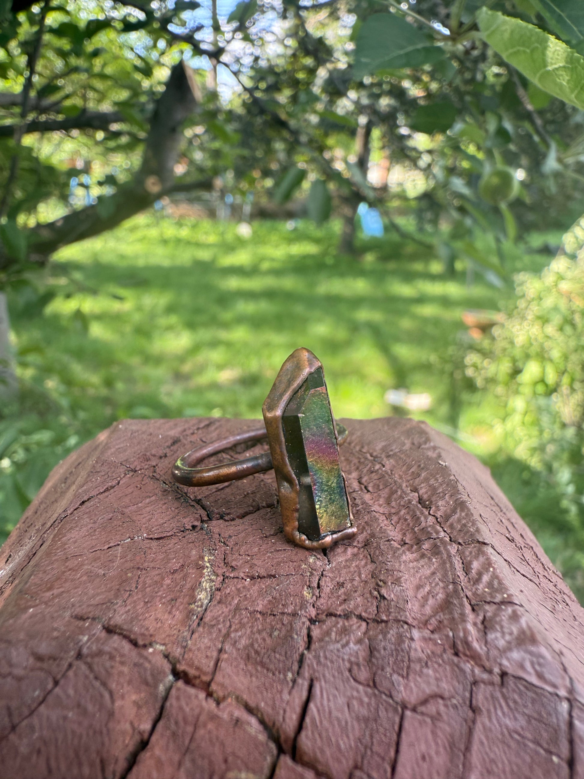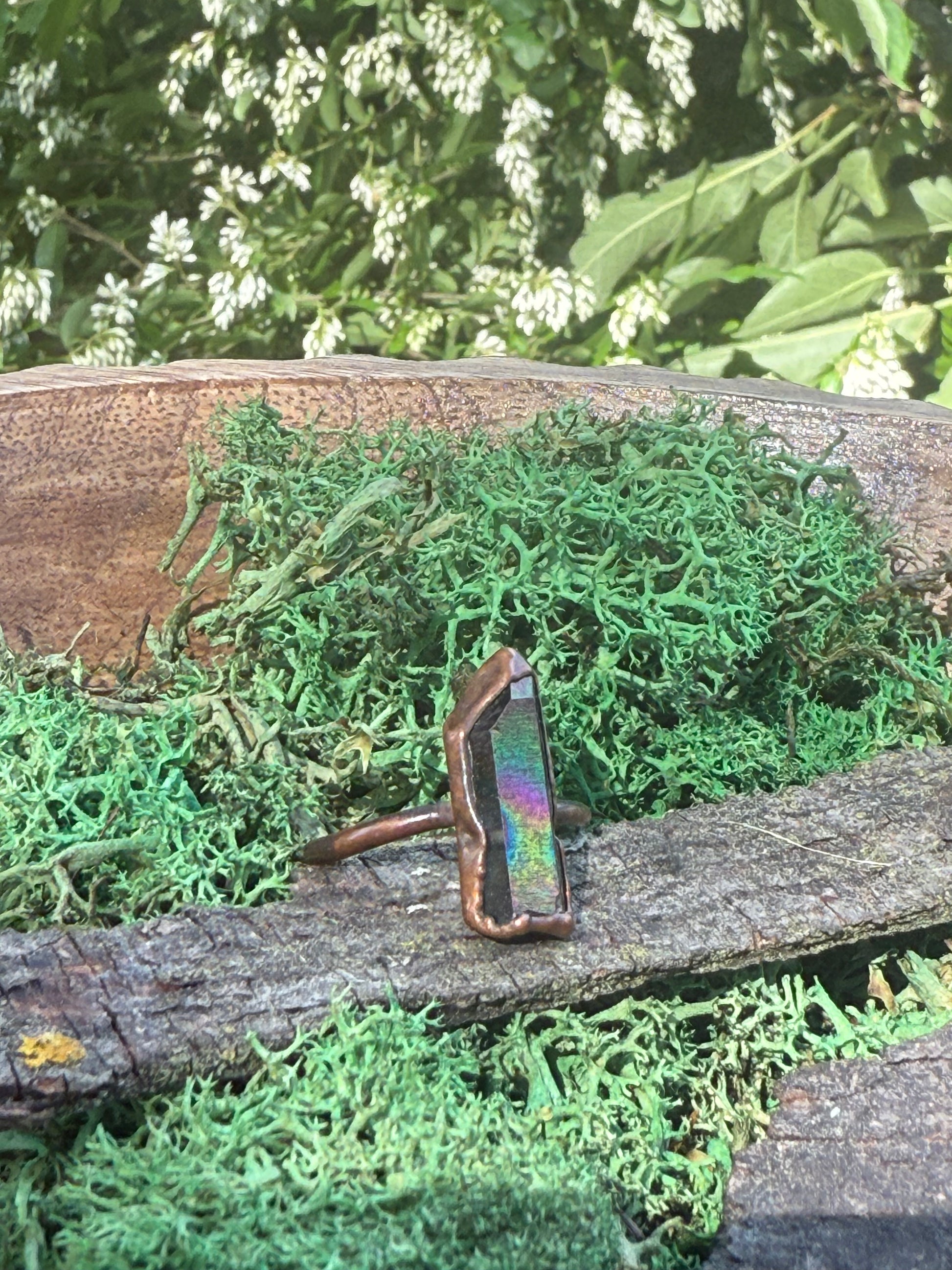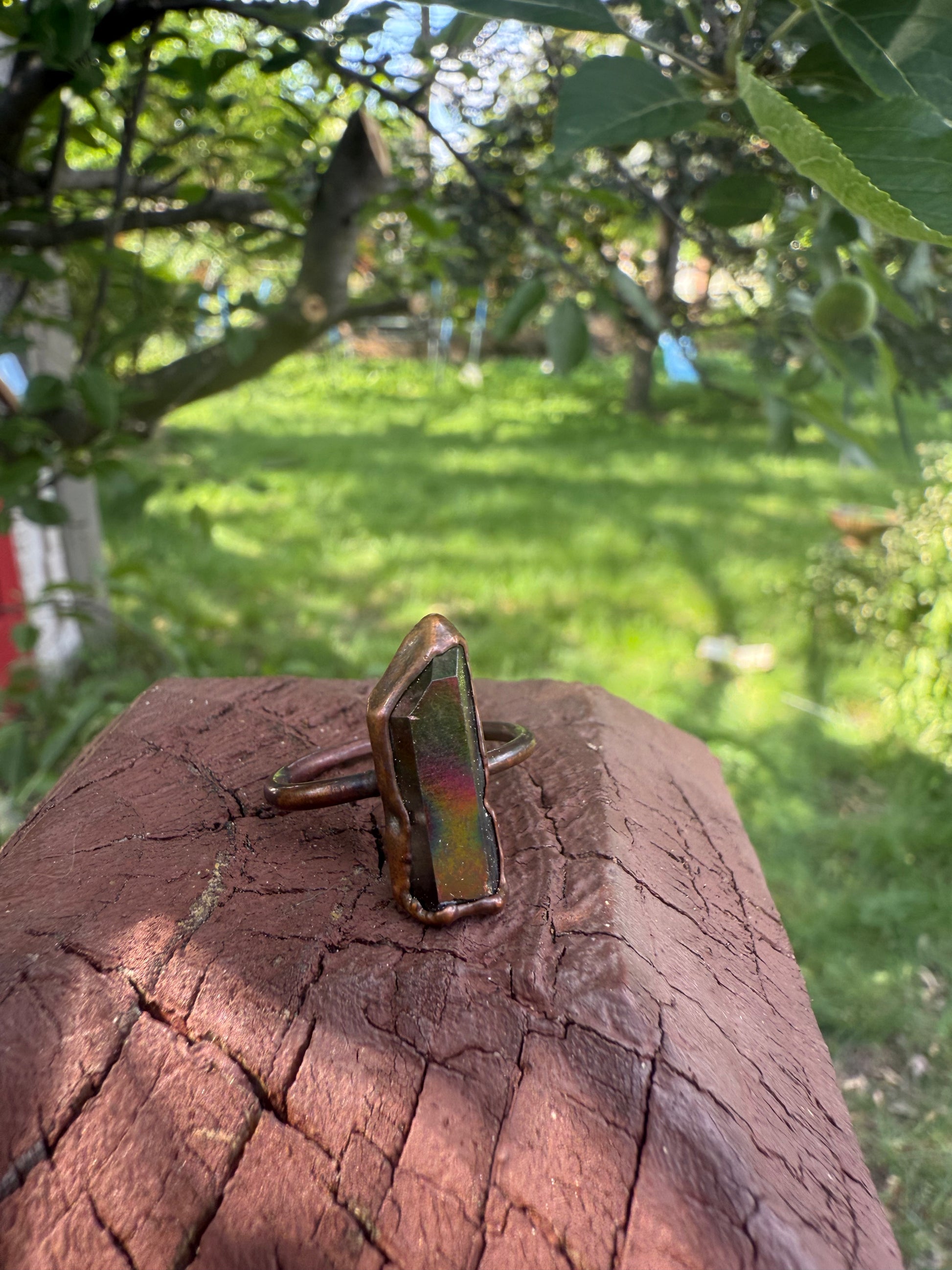 A beautiful Black Aura Quartz Point electroformed with copper. Size 8.75 ring.