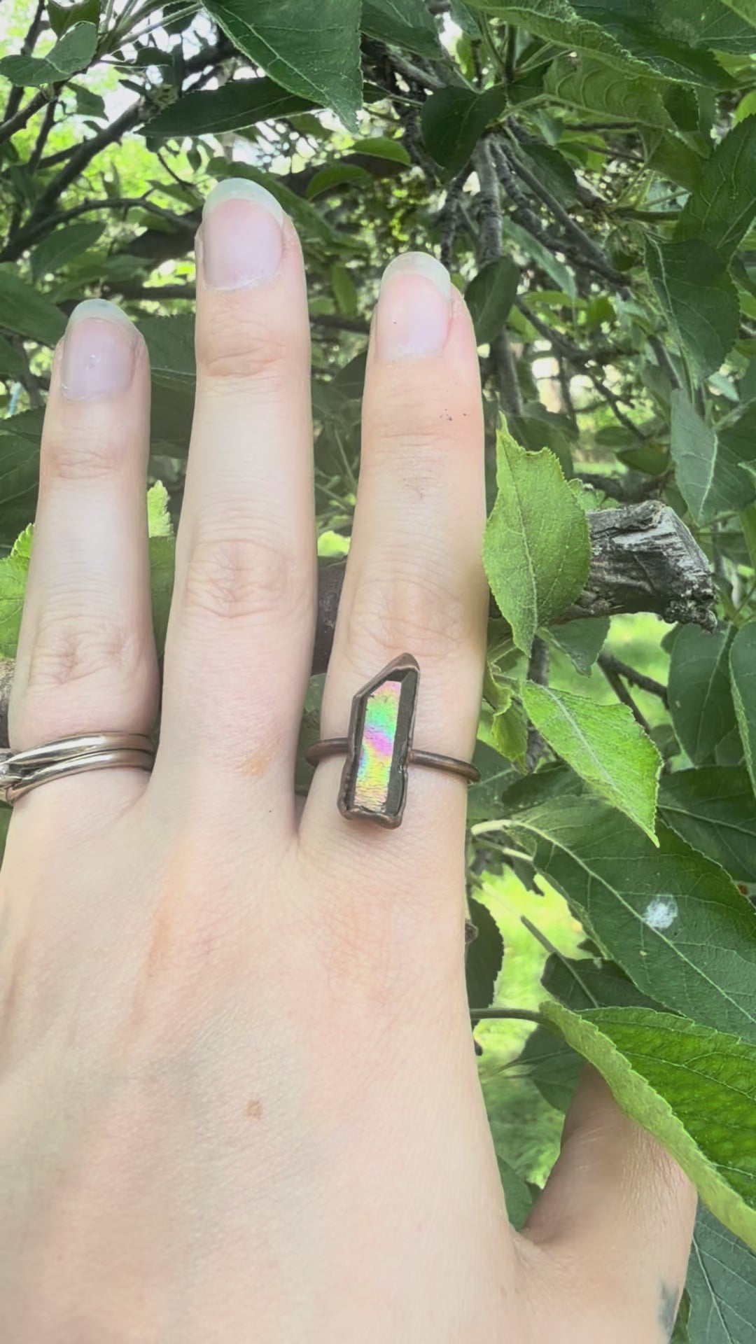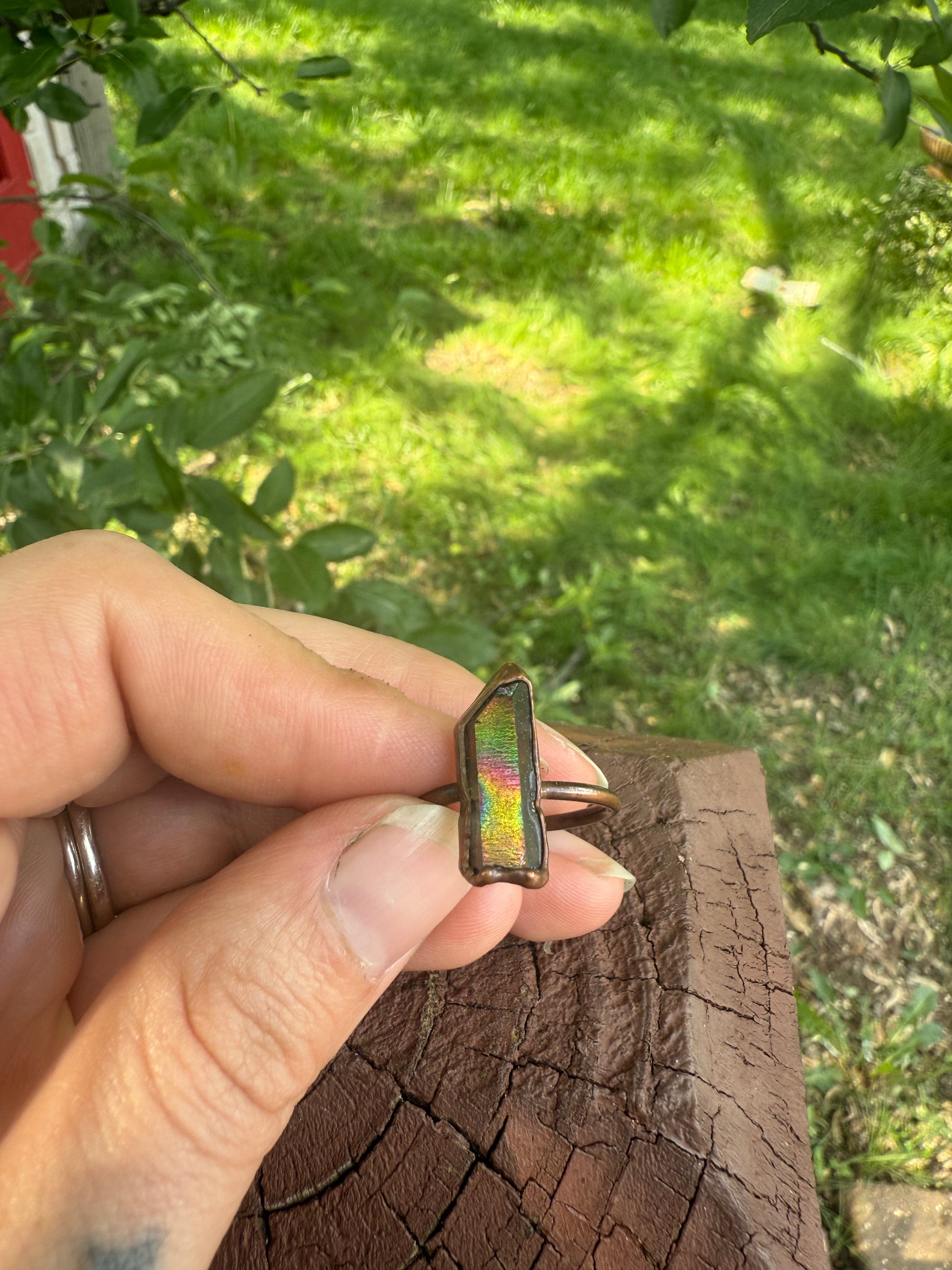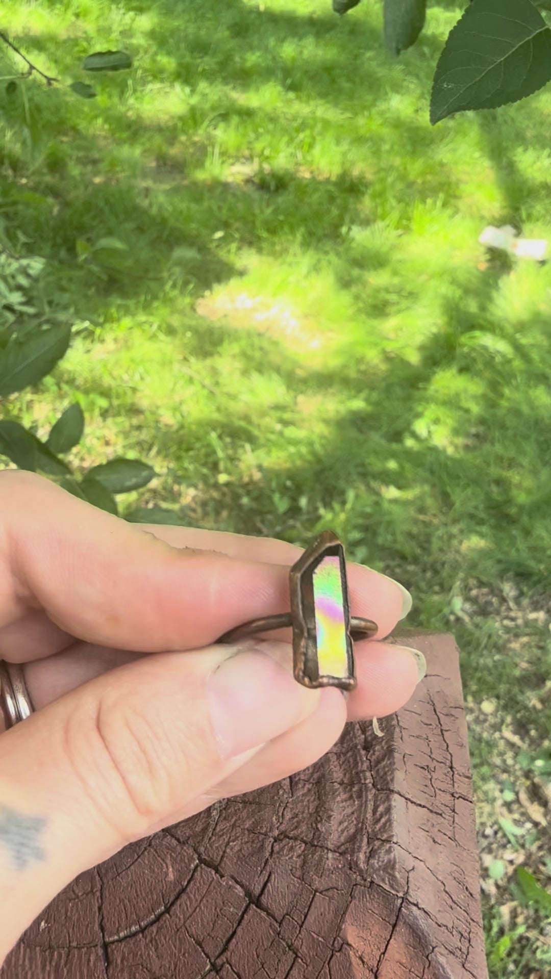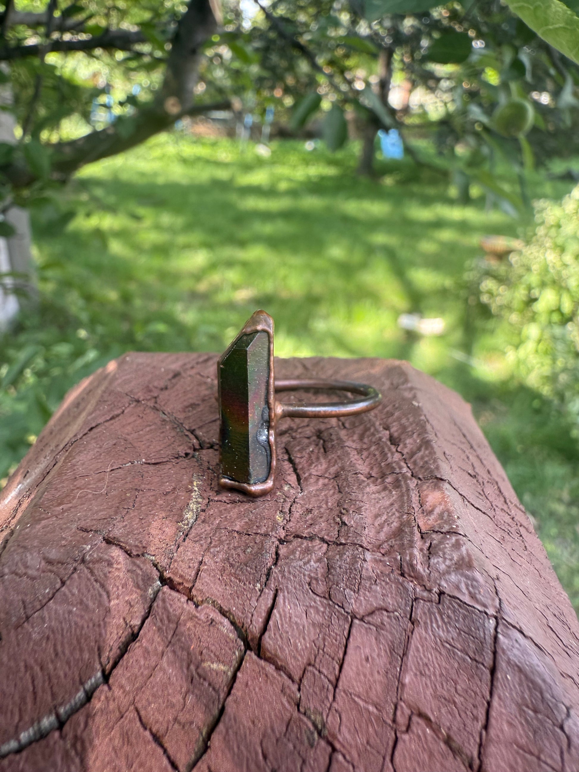 A beautiful Black Aura Quartz Point electroformed with copper. Size 8.75 ring.