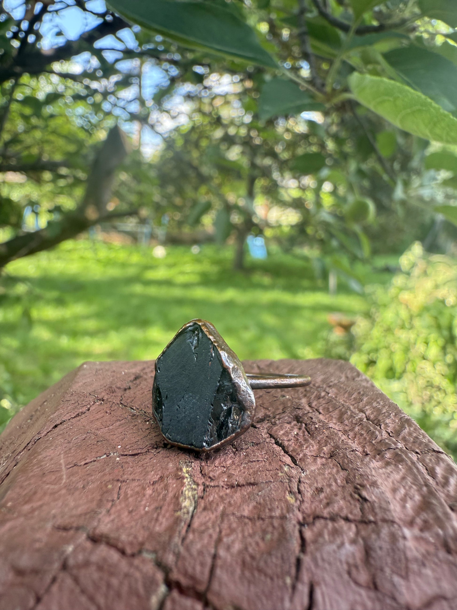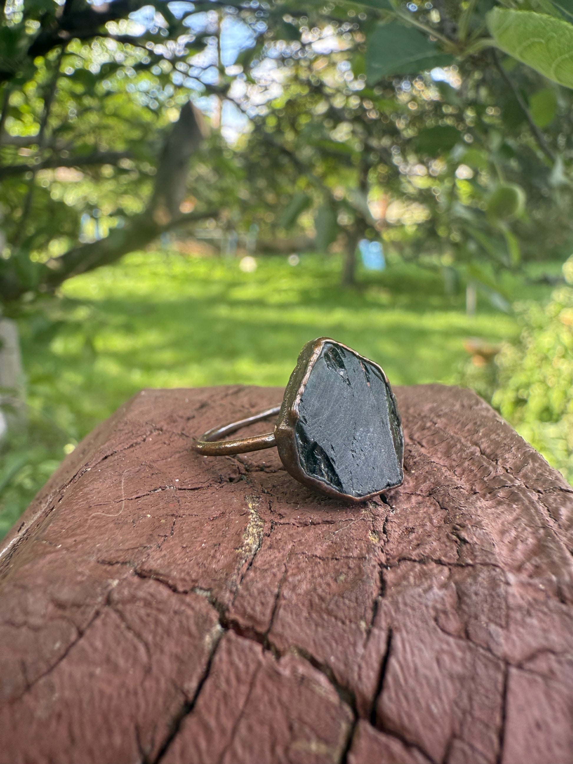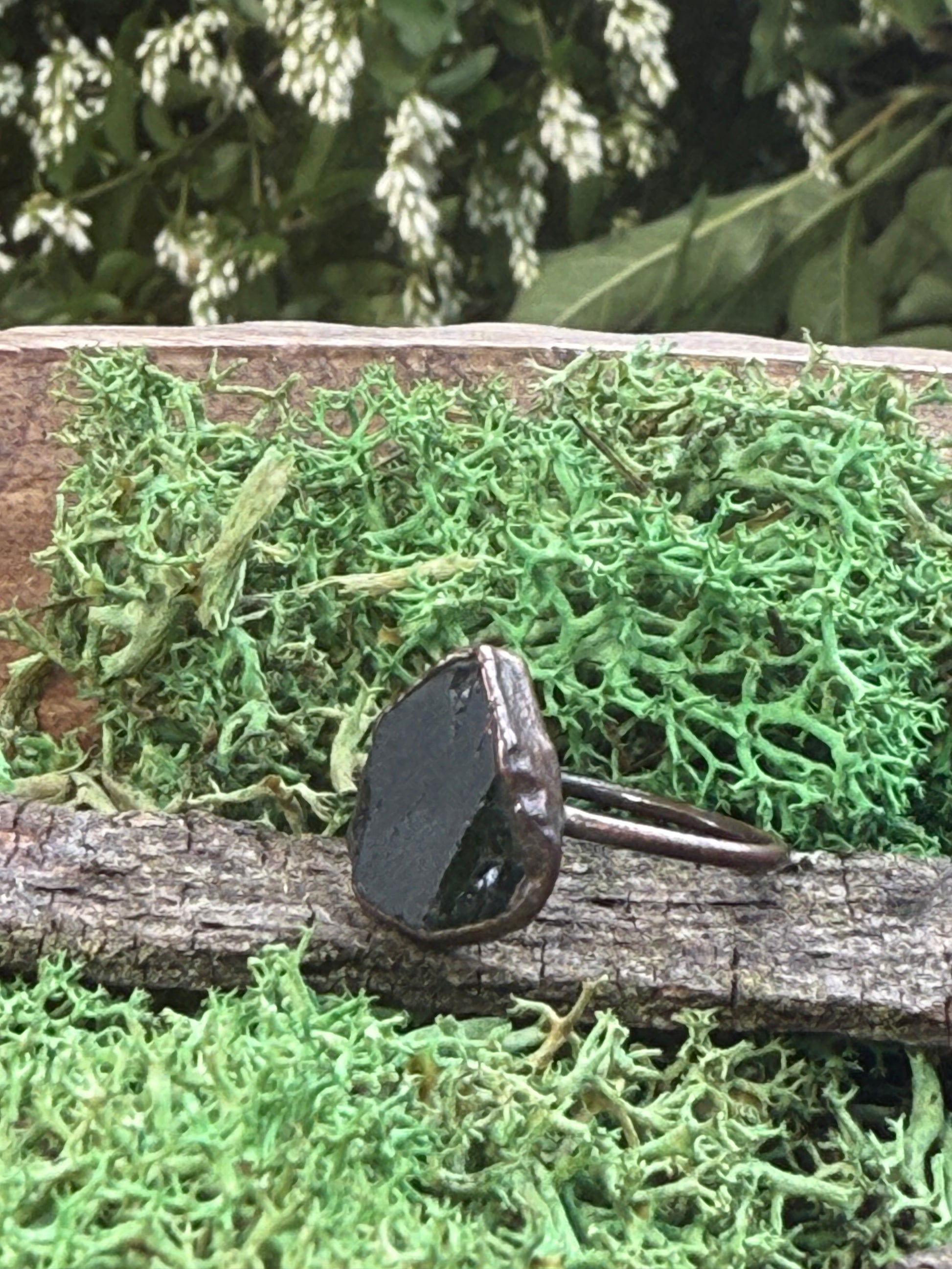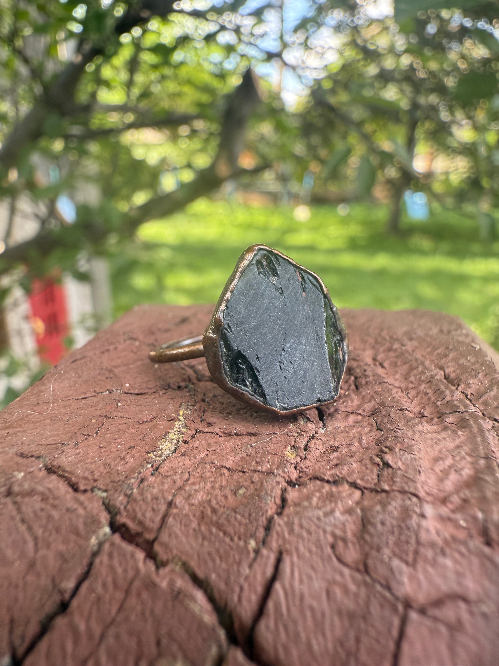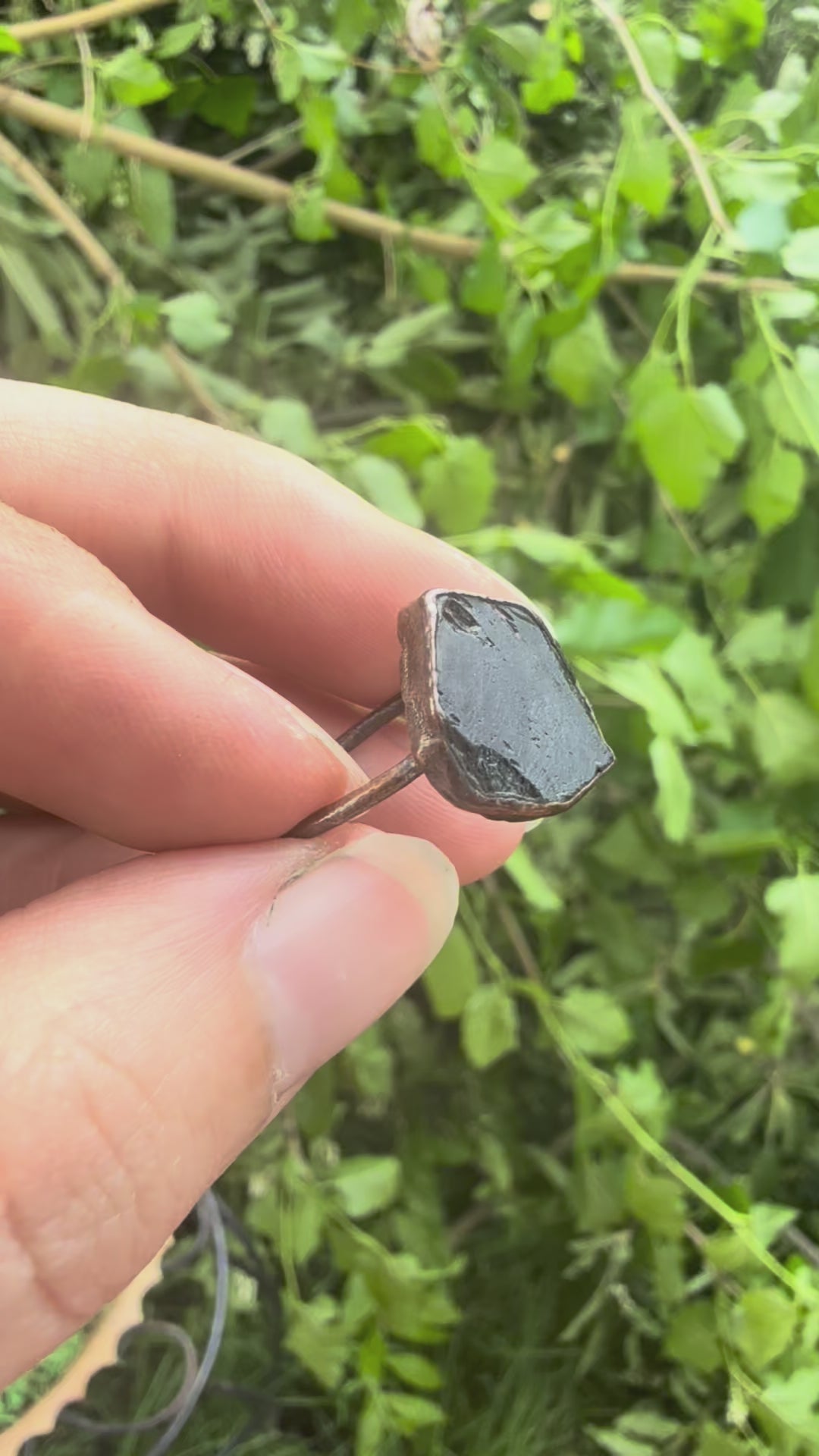 A beautiful Black Tourmaline stone electroformed with copper. Size 7 ring.
