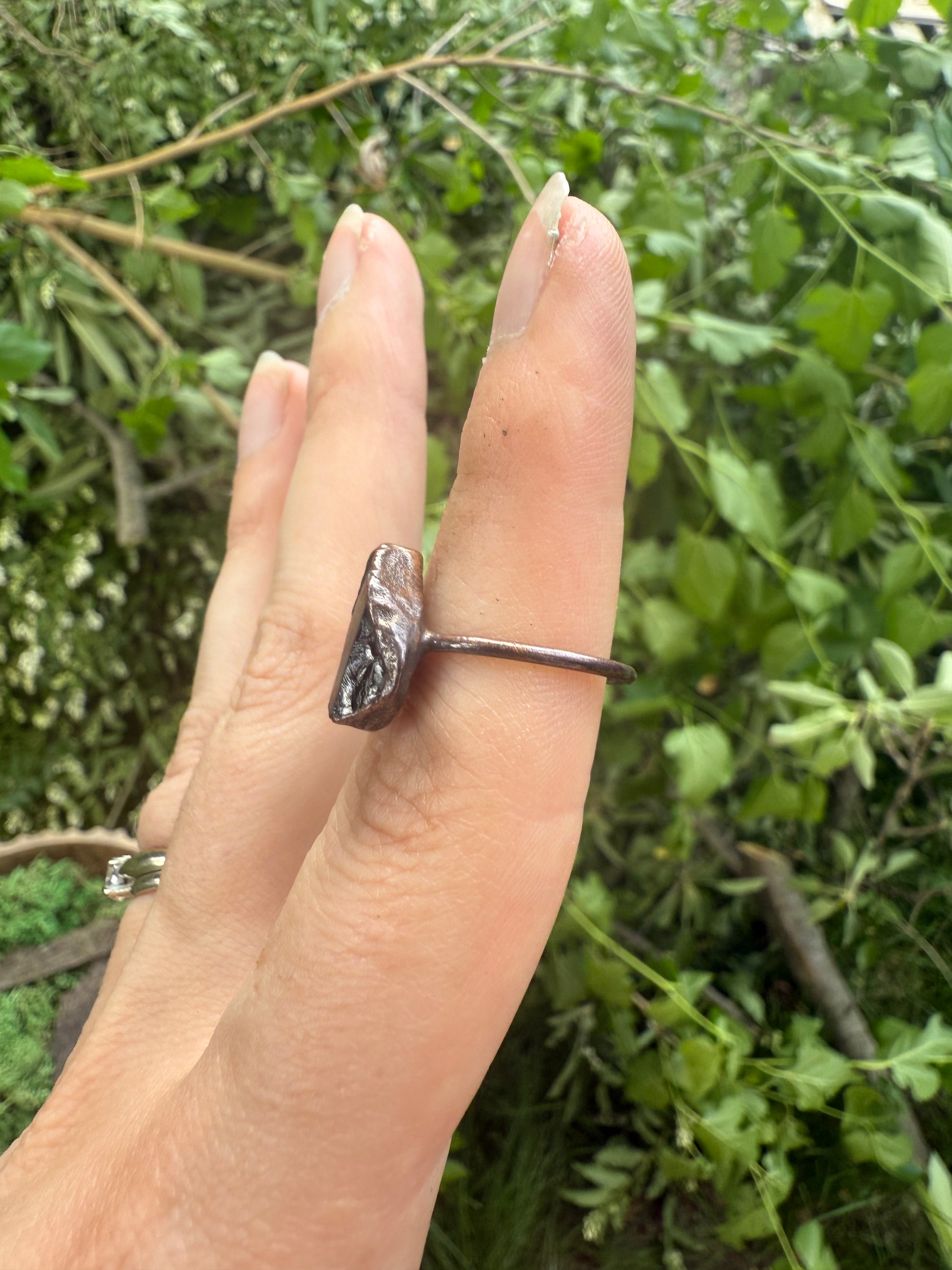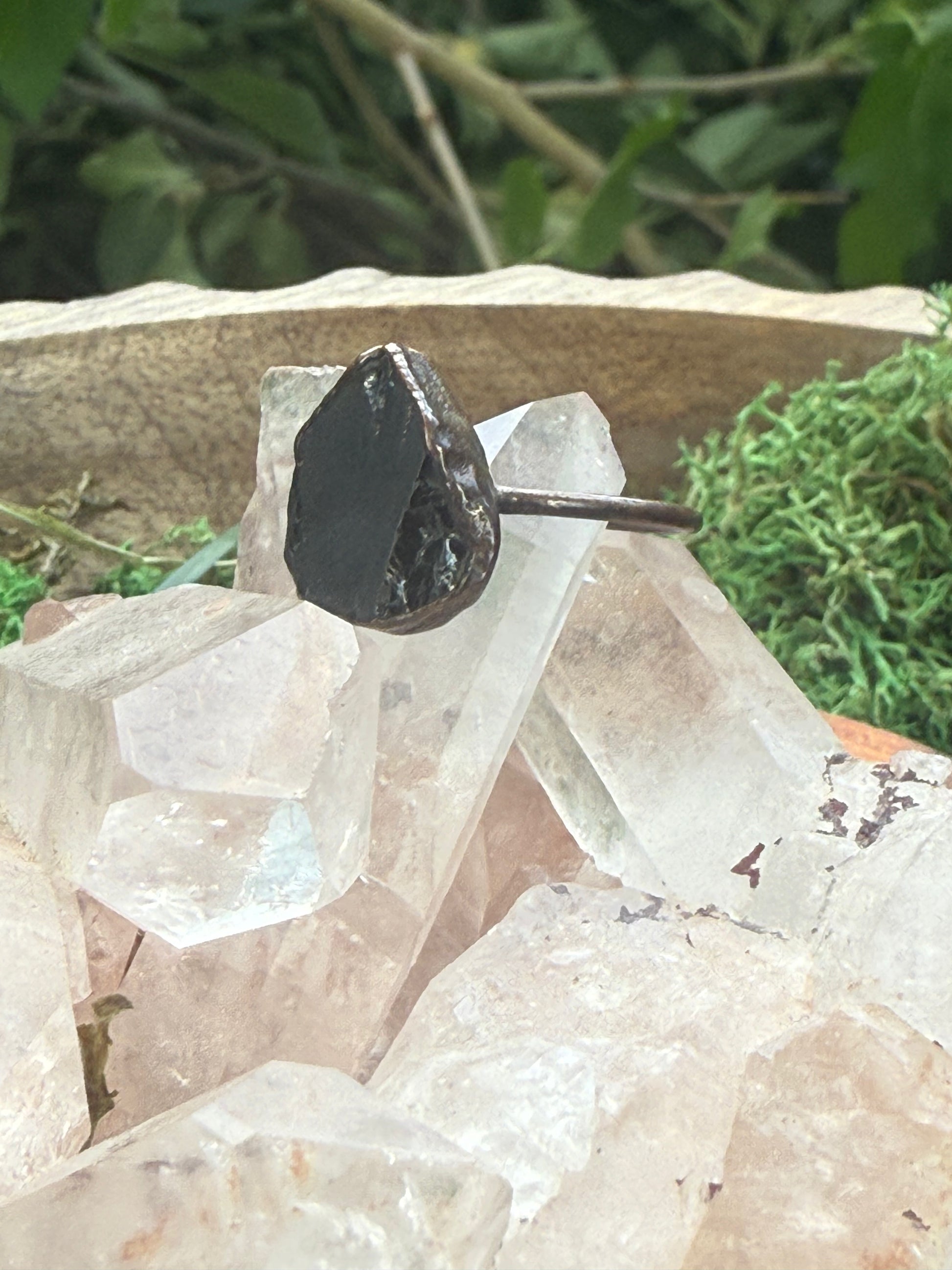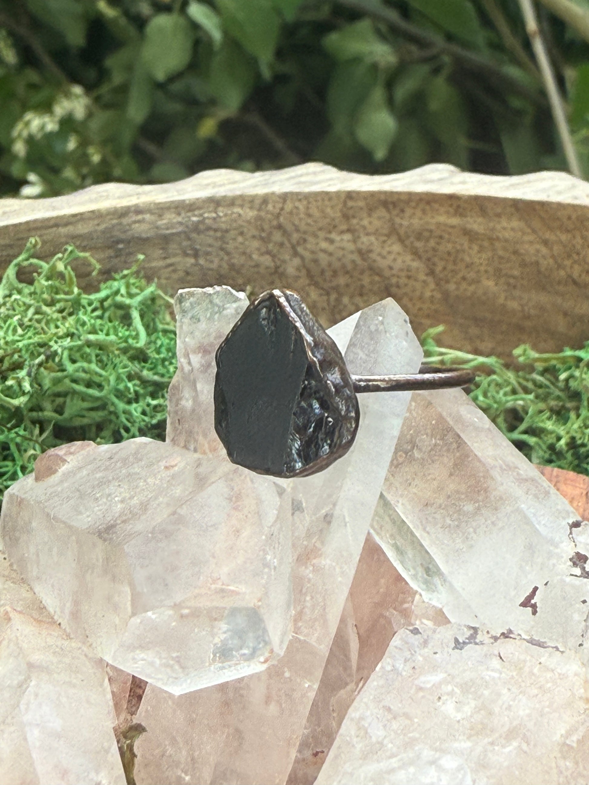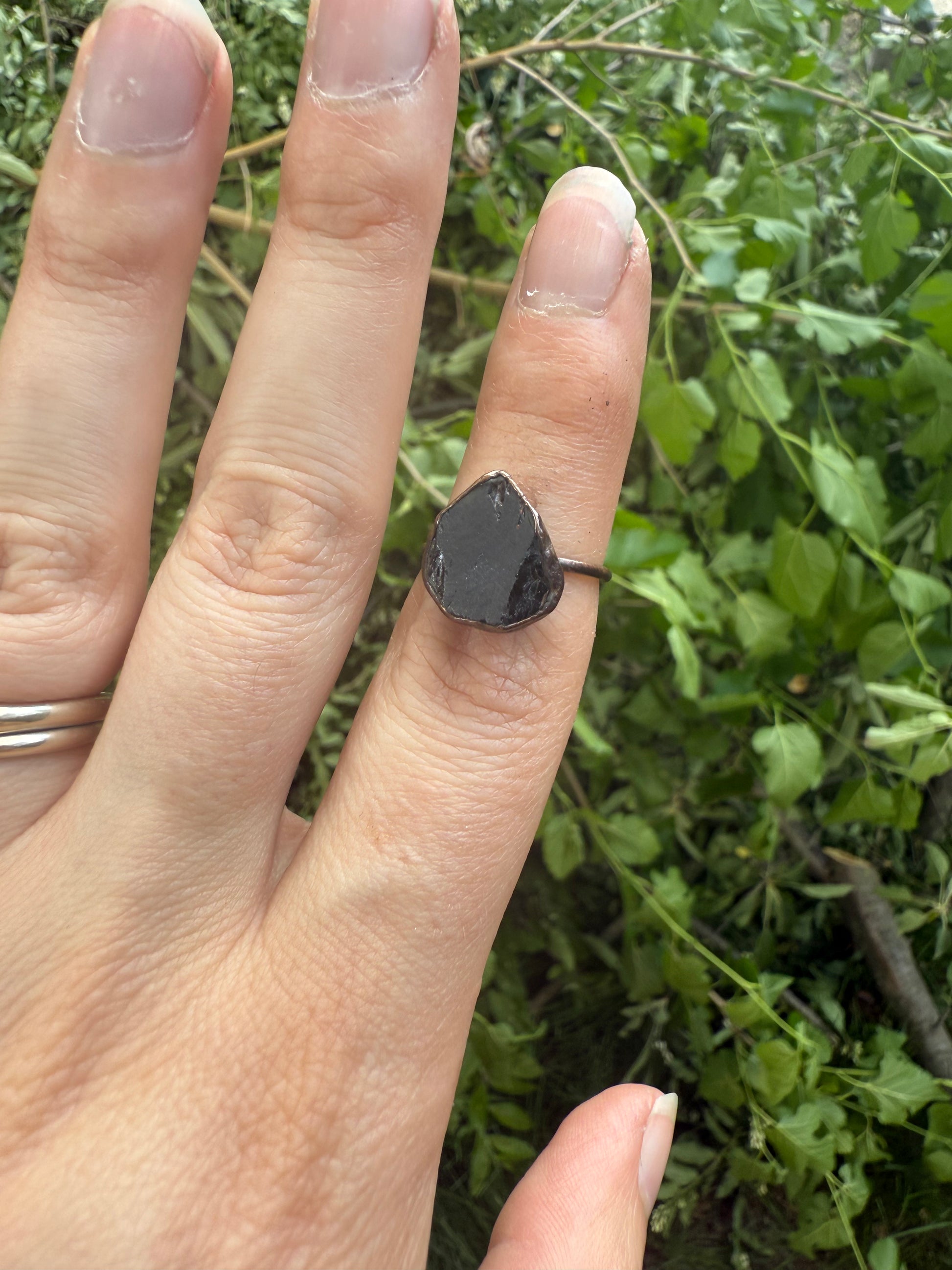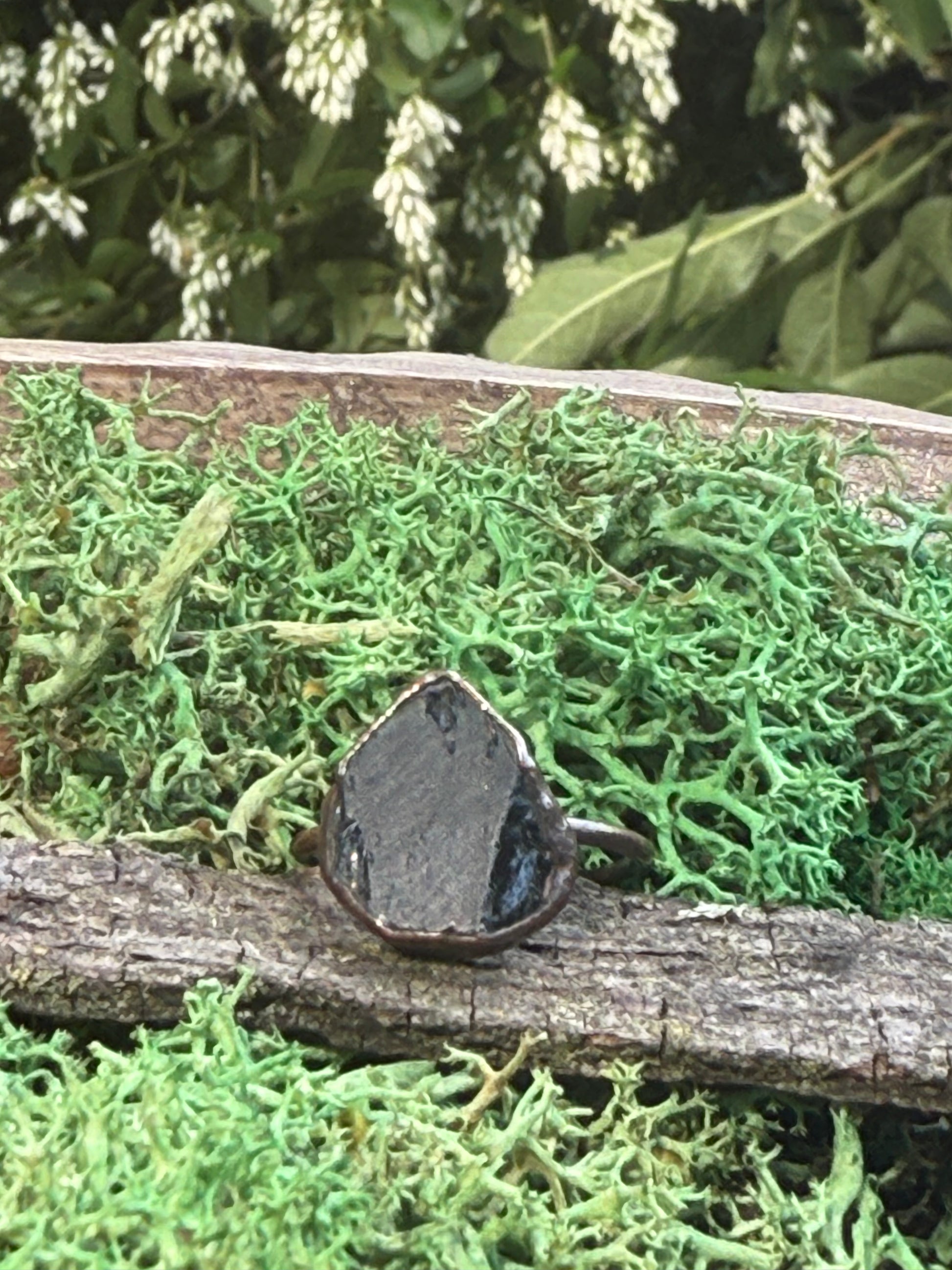 A beautiful Black Tourmaline stone electroformed with copper. Size 7 ring.