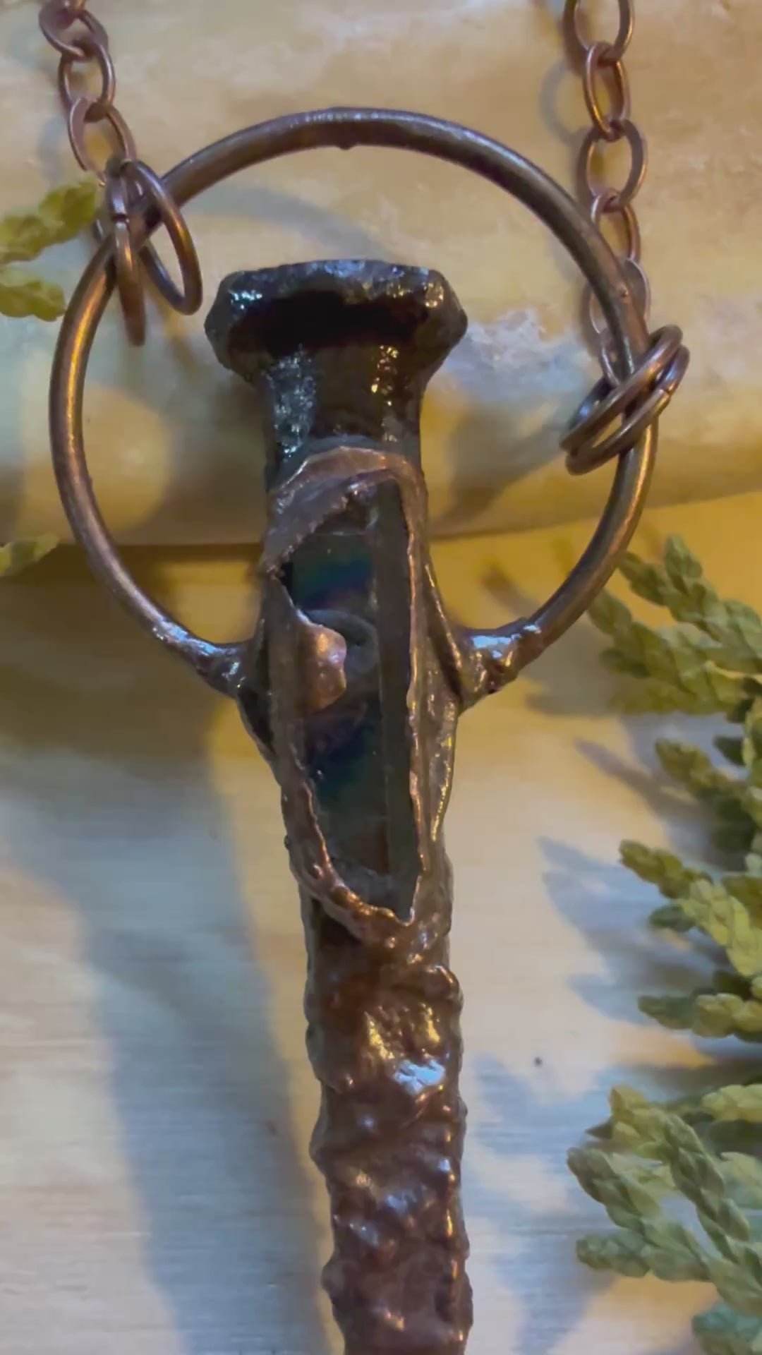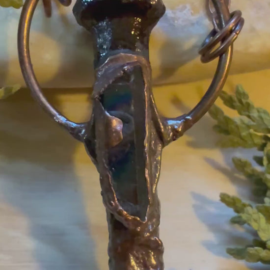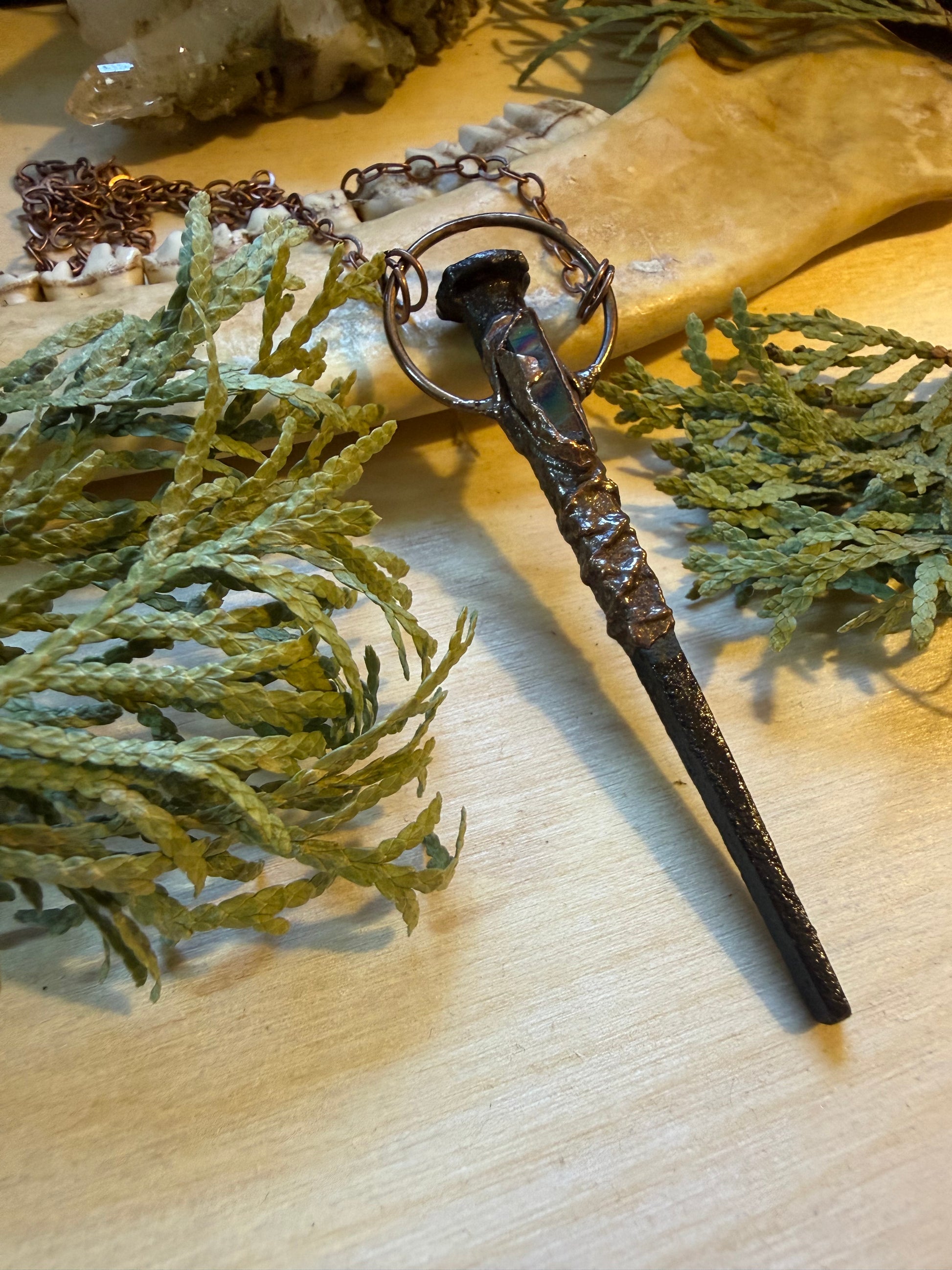 This necklace was assembled with beautiful Aura Quarts resting on an Iron Coffin Nail and wrapped with copper wire then electroformed with copper.