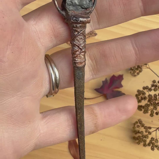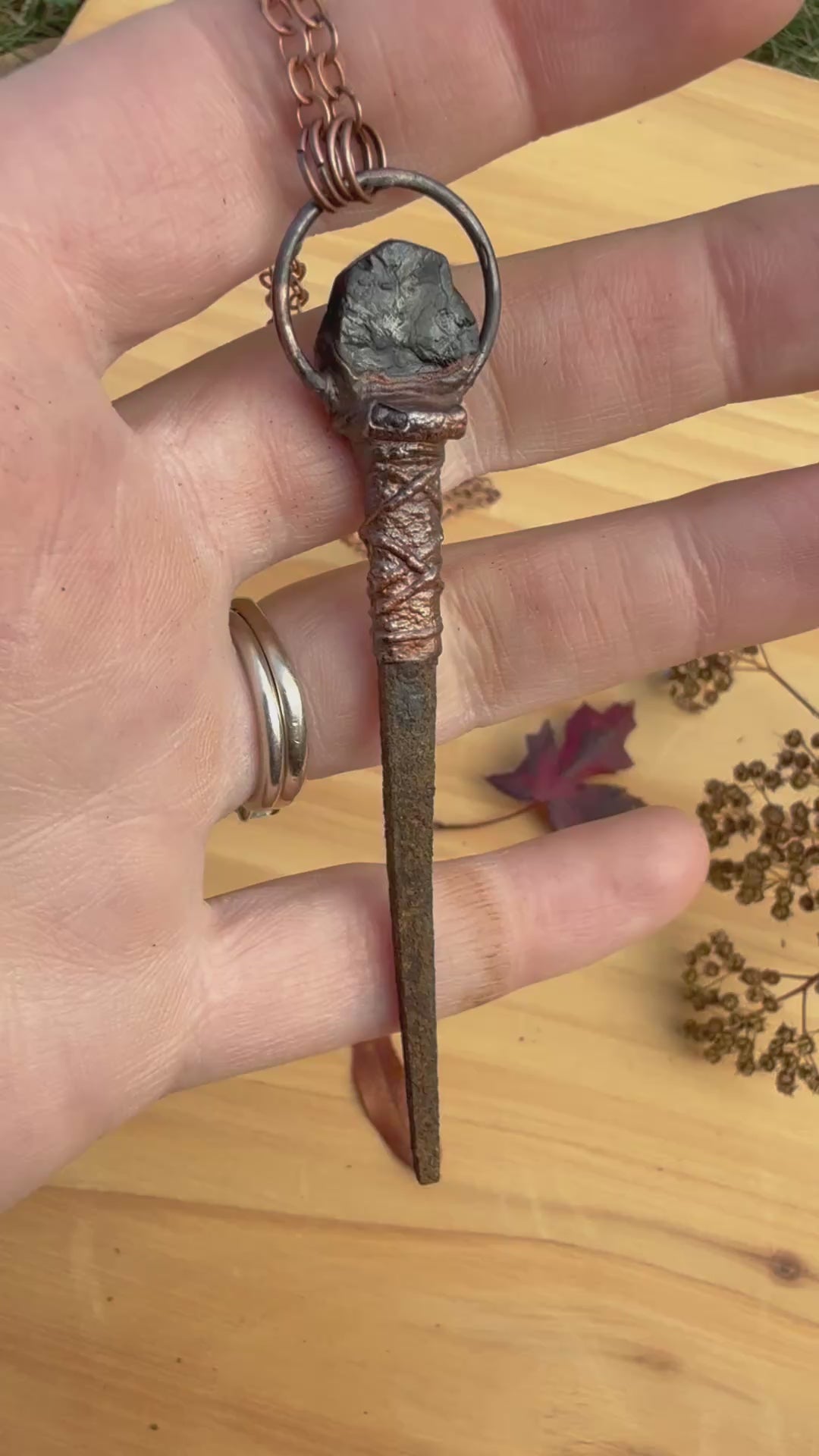 This necklace was assembled with a rounded Black Tourmaline topping an Iron Coffin Nail and wrapped with copper wire then electroformed with copper.