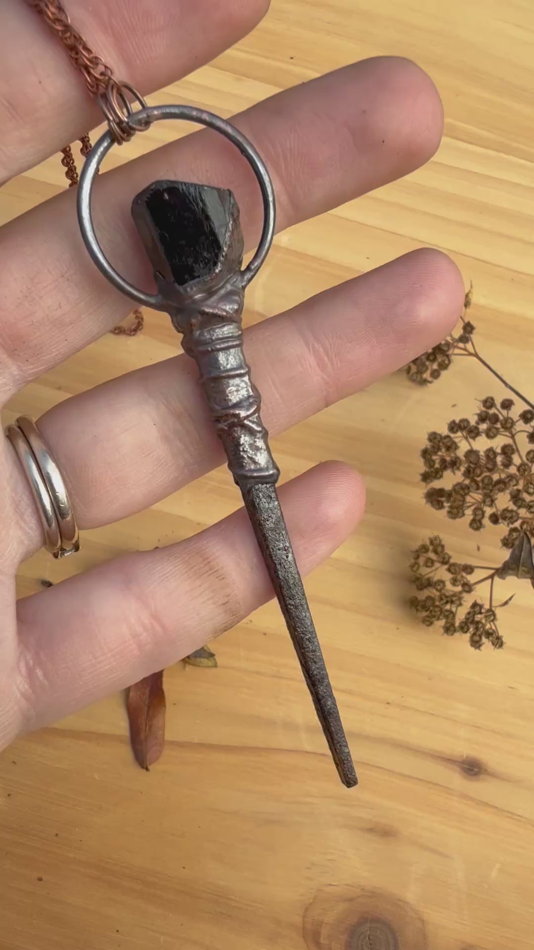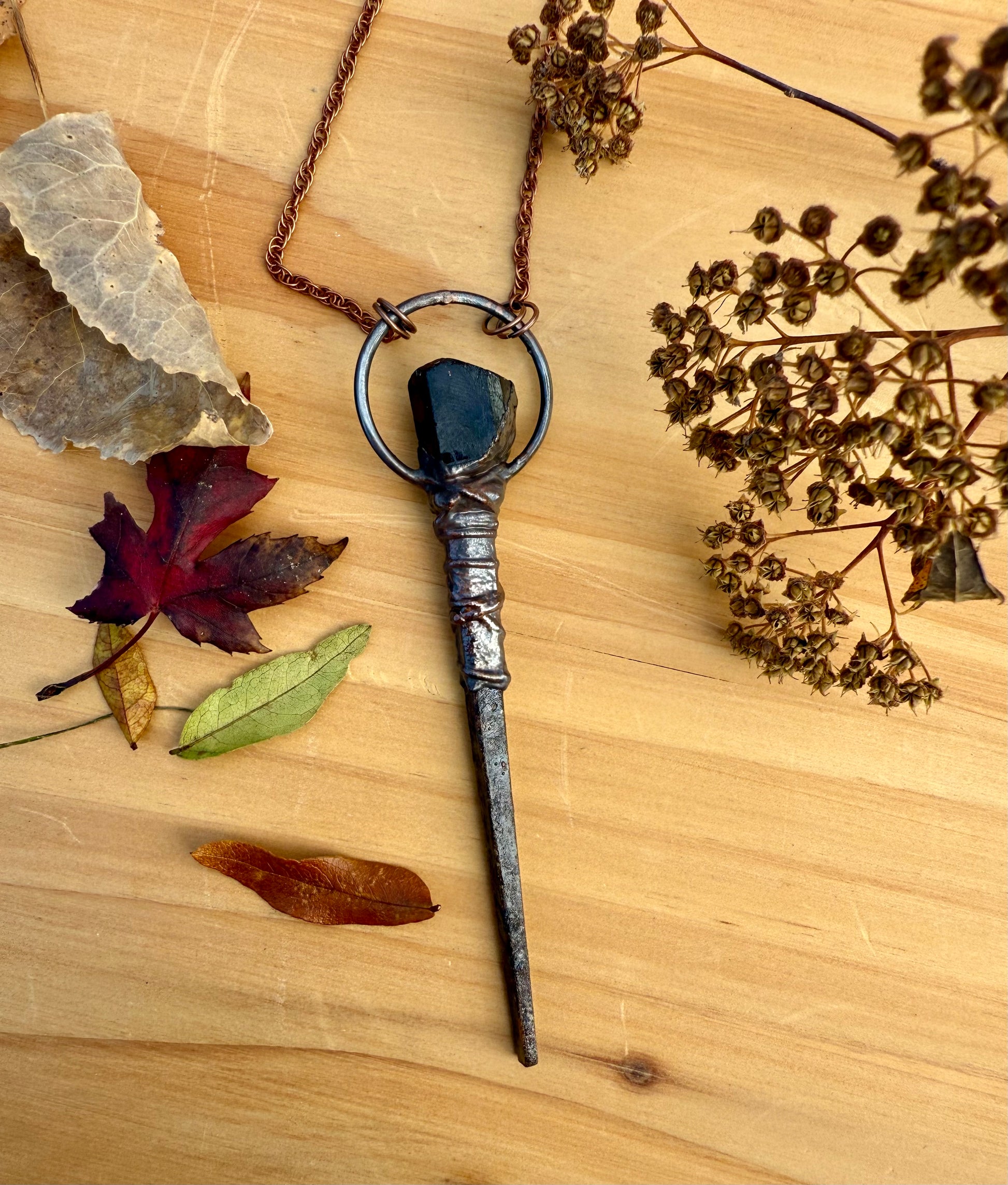 This necklace was assembled with a rounded Black Tourmaline topping an Iron Coffin Nail and wrapped with copper wire then electroformed with copper.
