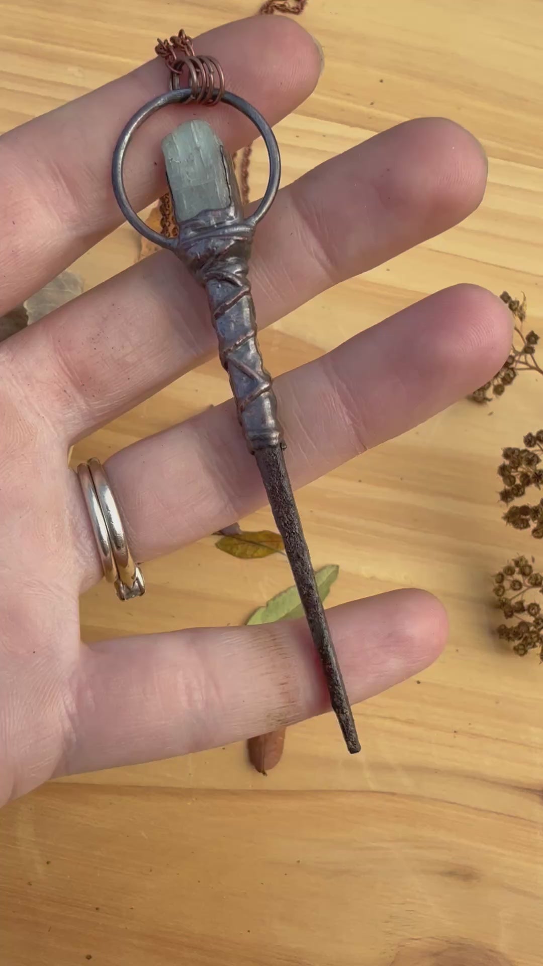 This necklace was assembled with Blue Kyanite topping an Iron Coffin Nail and wrapped with copper wire then electroformed with copper.