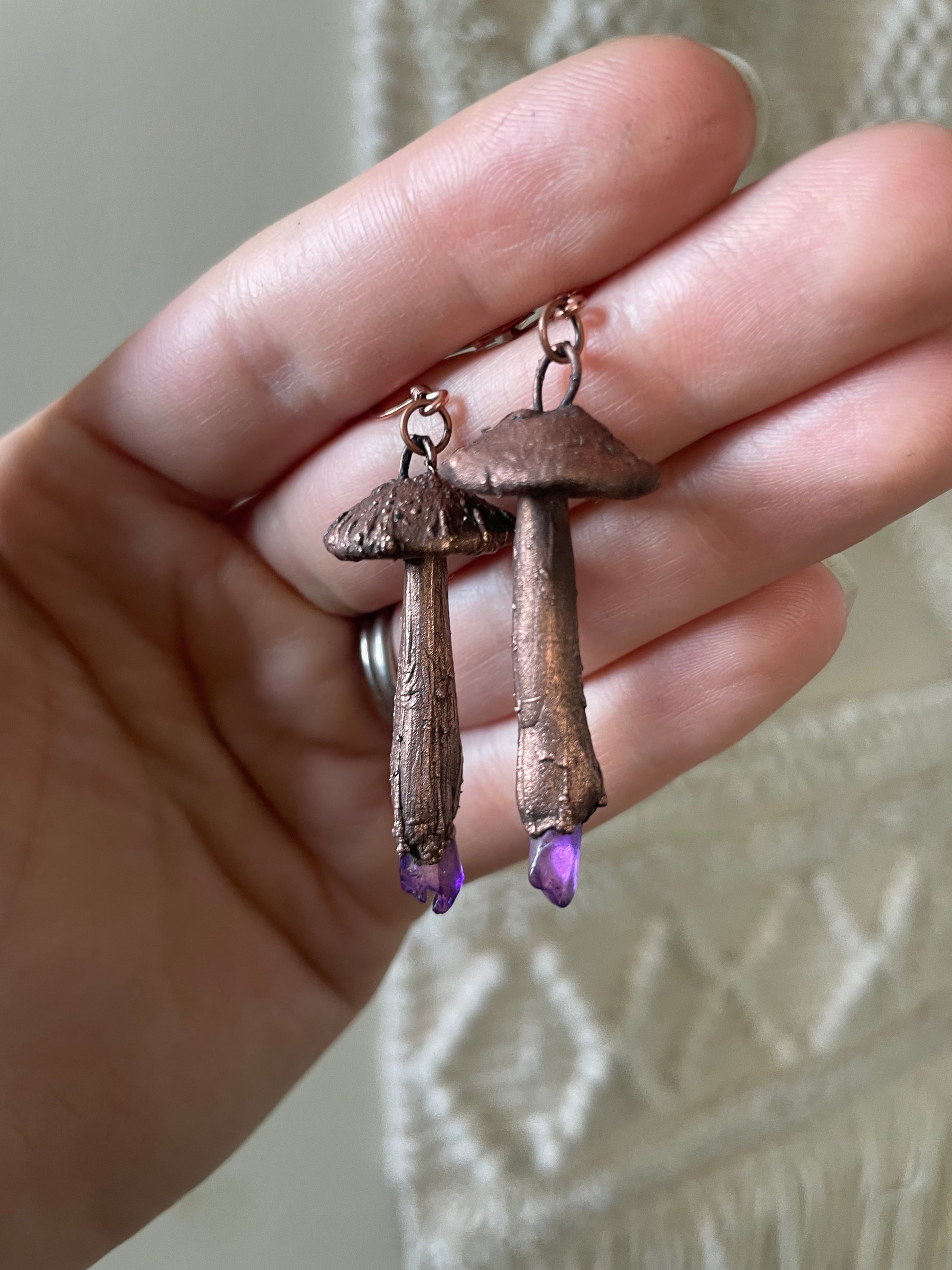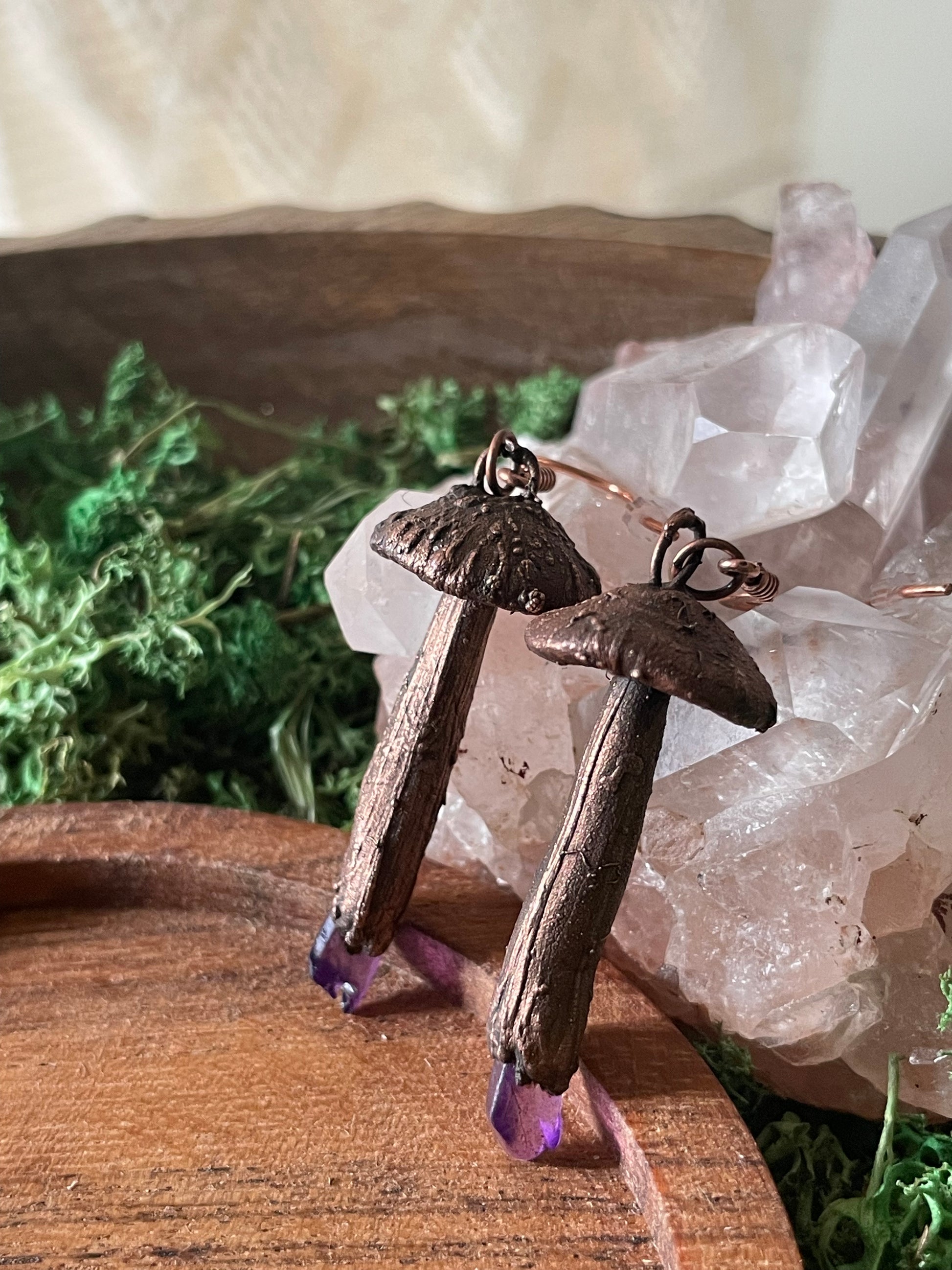 Hand Sculpted Mushrooms earrings with a colored purple quartz stem. Electroformed with copper and hung on copper ear hooks.