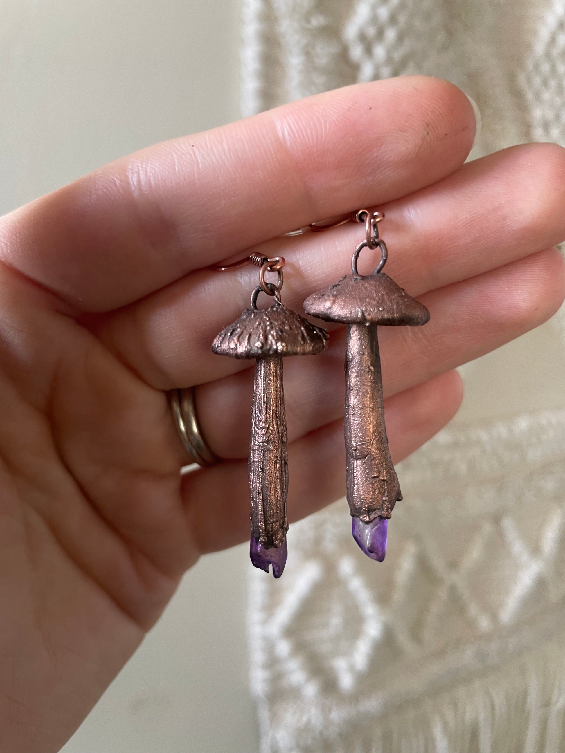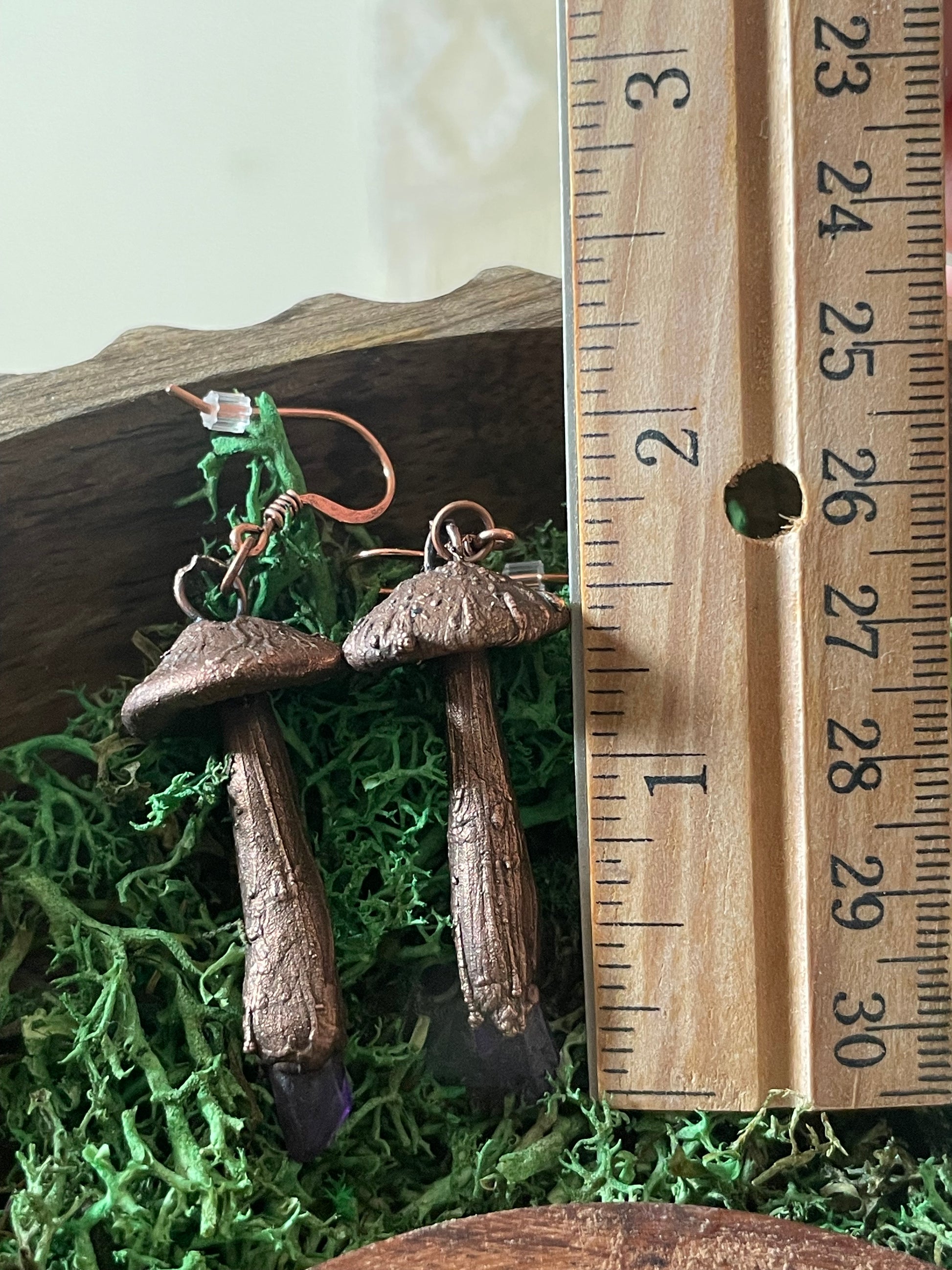 Electroformed Copper Mushroom Purple Quartz Stem Earrings
