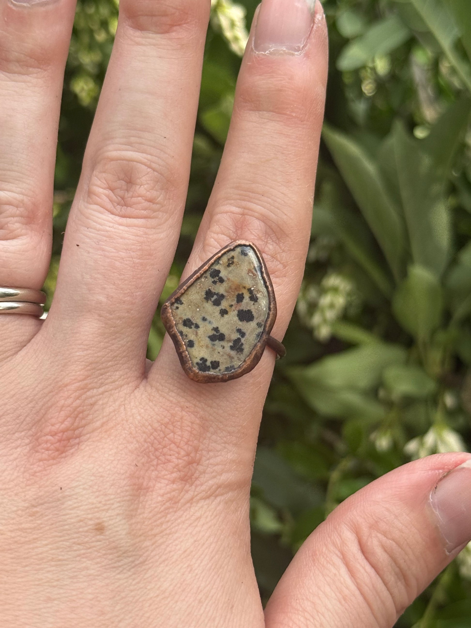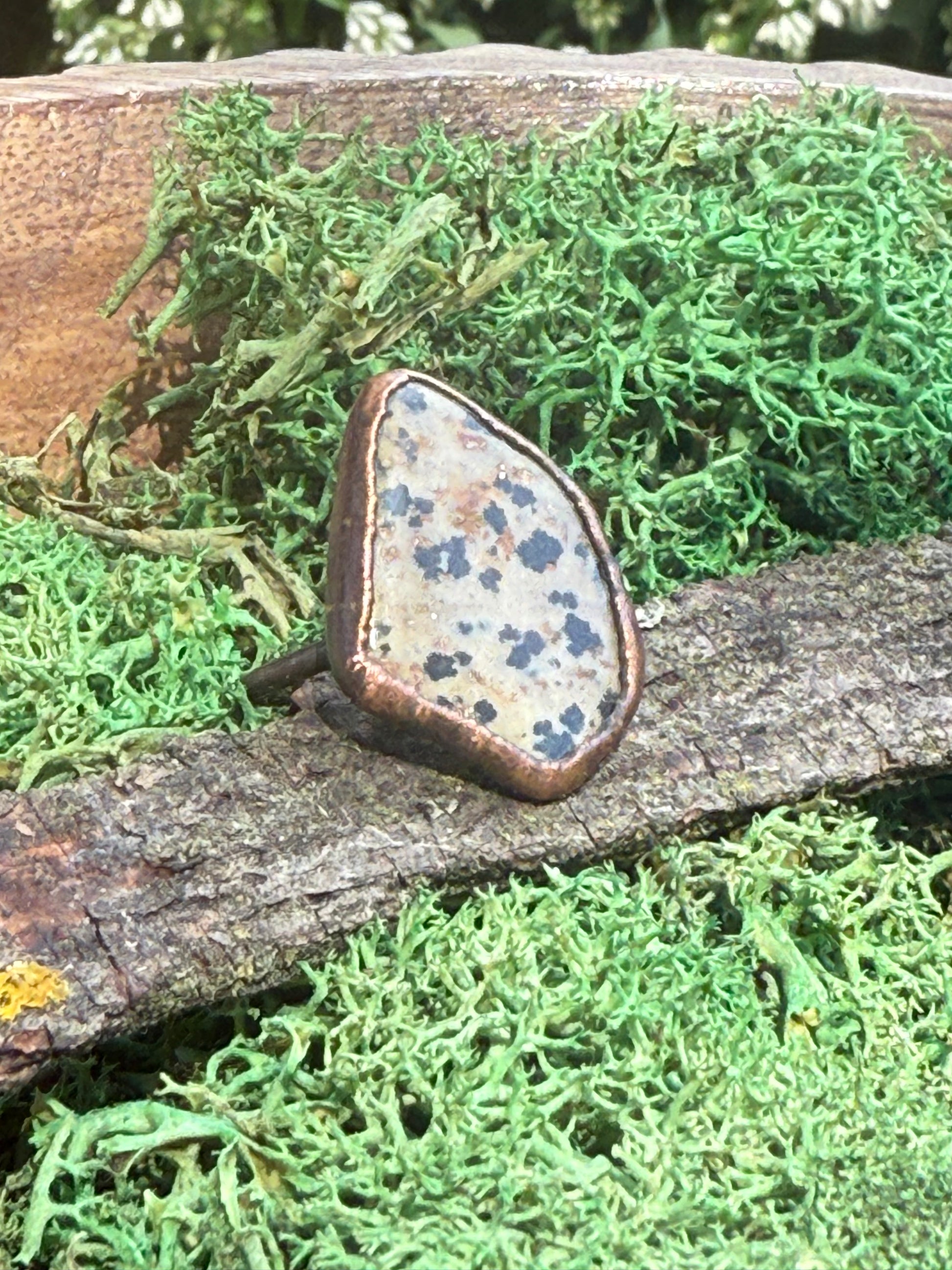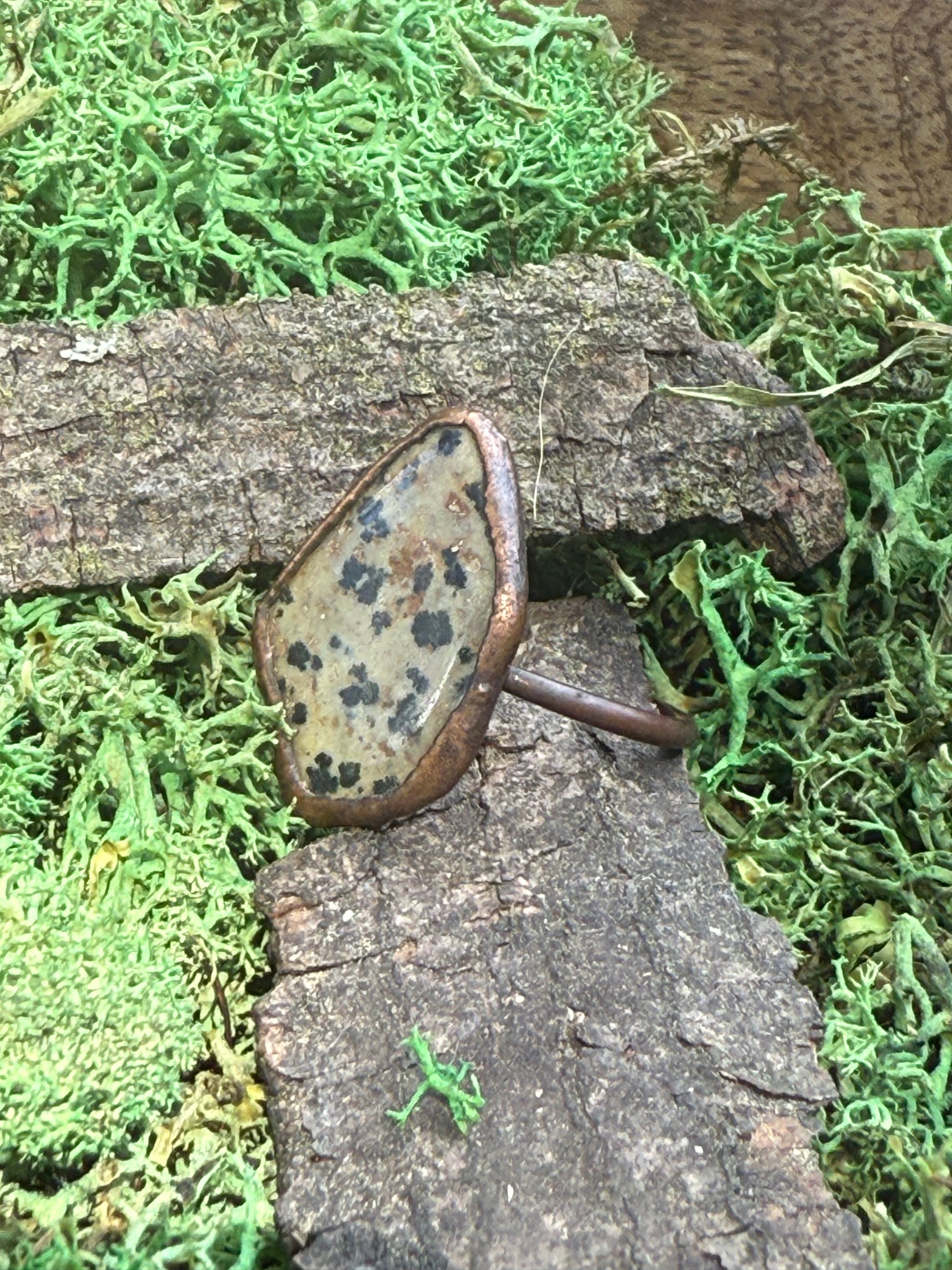 A beautiful and unique cut of Dalmation Jasper electroformed with copper. Size 9.5 ring.
