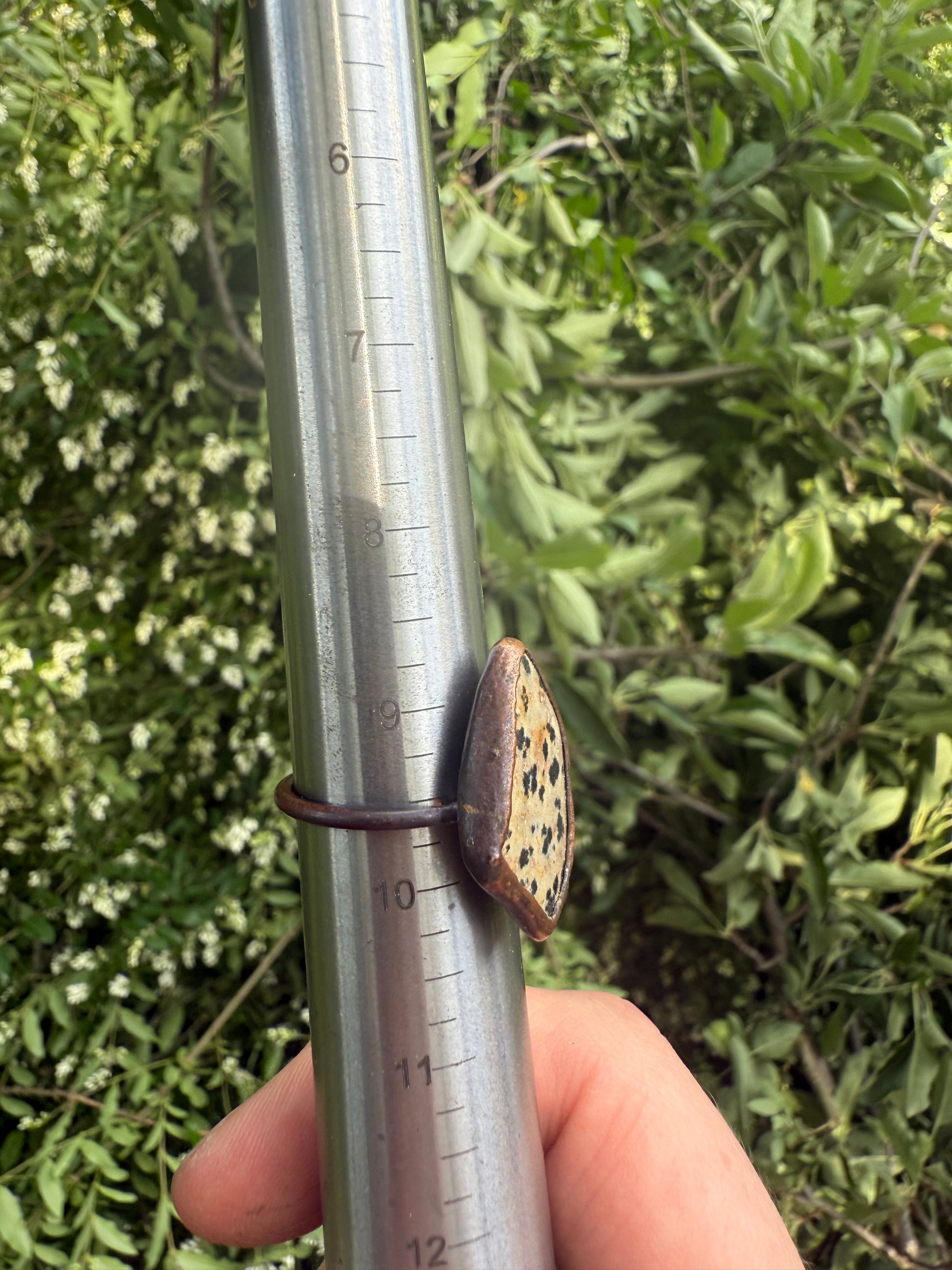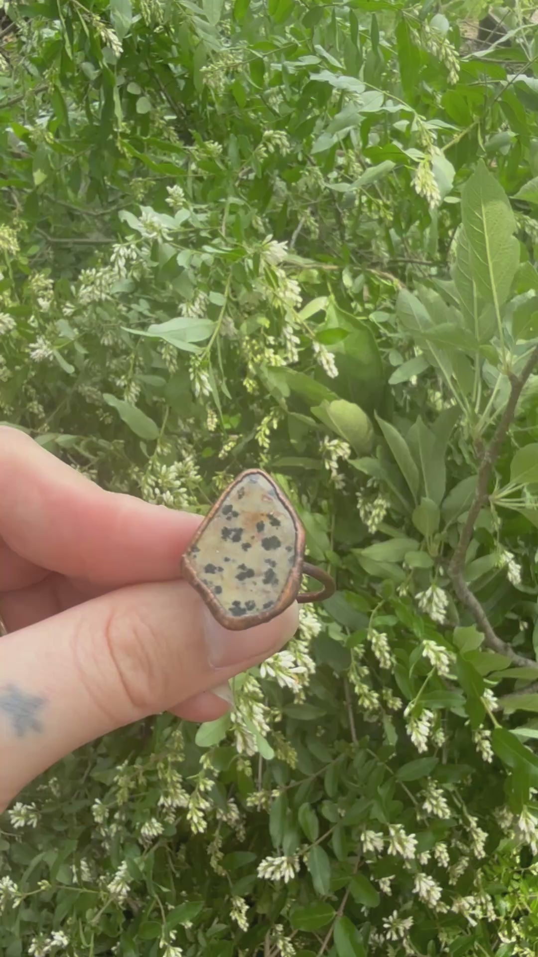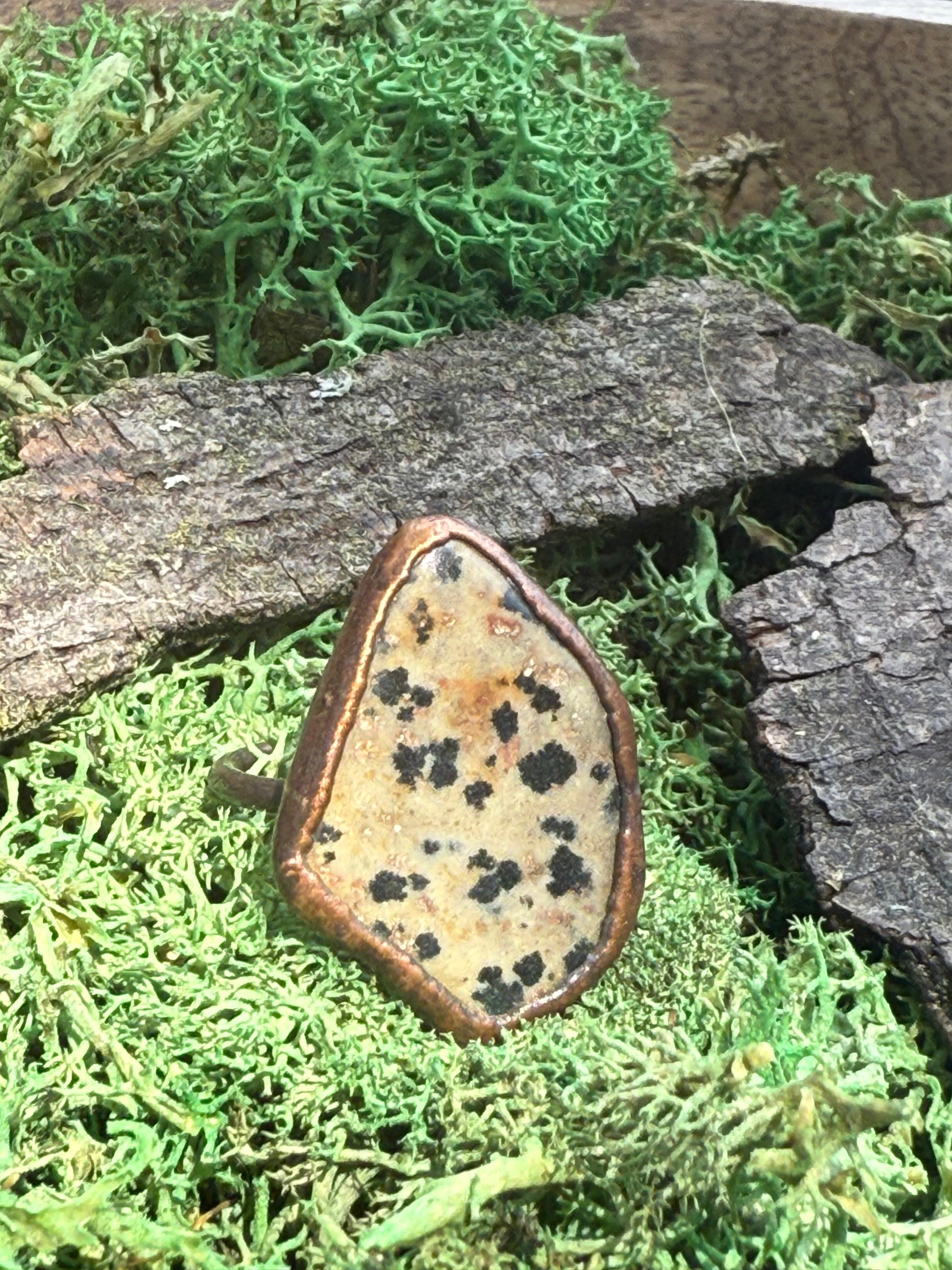 A beautiful and unique cut of Dalmation Jasper electroformed with copper. Size 9.5 ring.