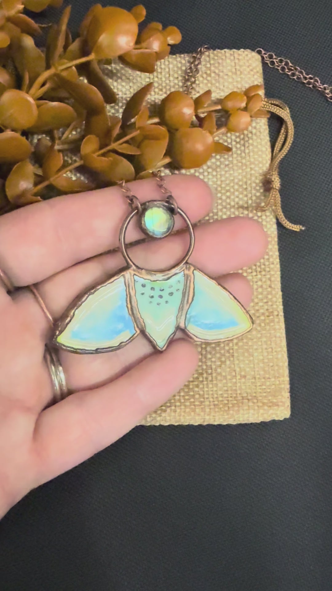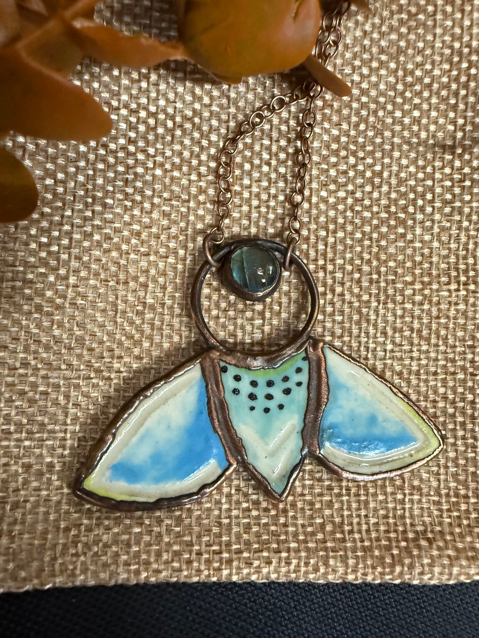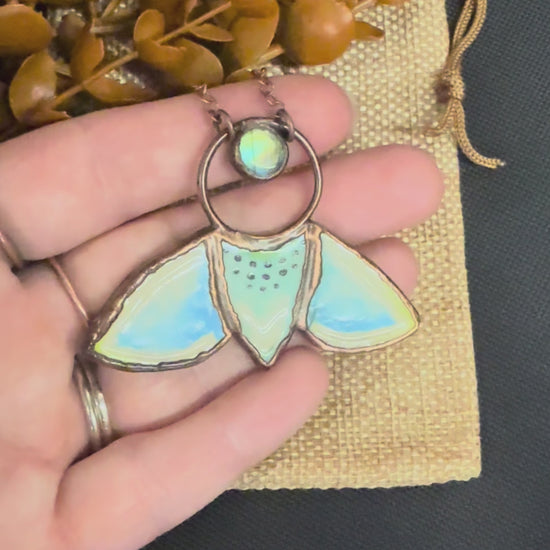 A little clay sculpted moth with a small Labradorite cabochon. I had so much fun making this charm along with a few others at my local clay studio Half Moon Clay. Electroformed with copper and strung on a copper chain, you choose your length.