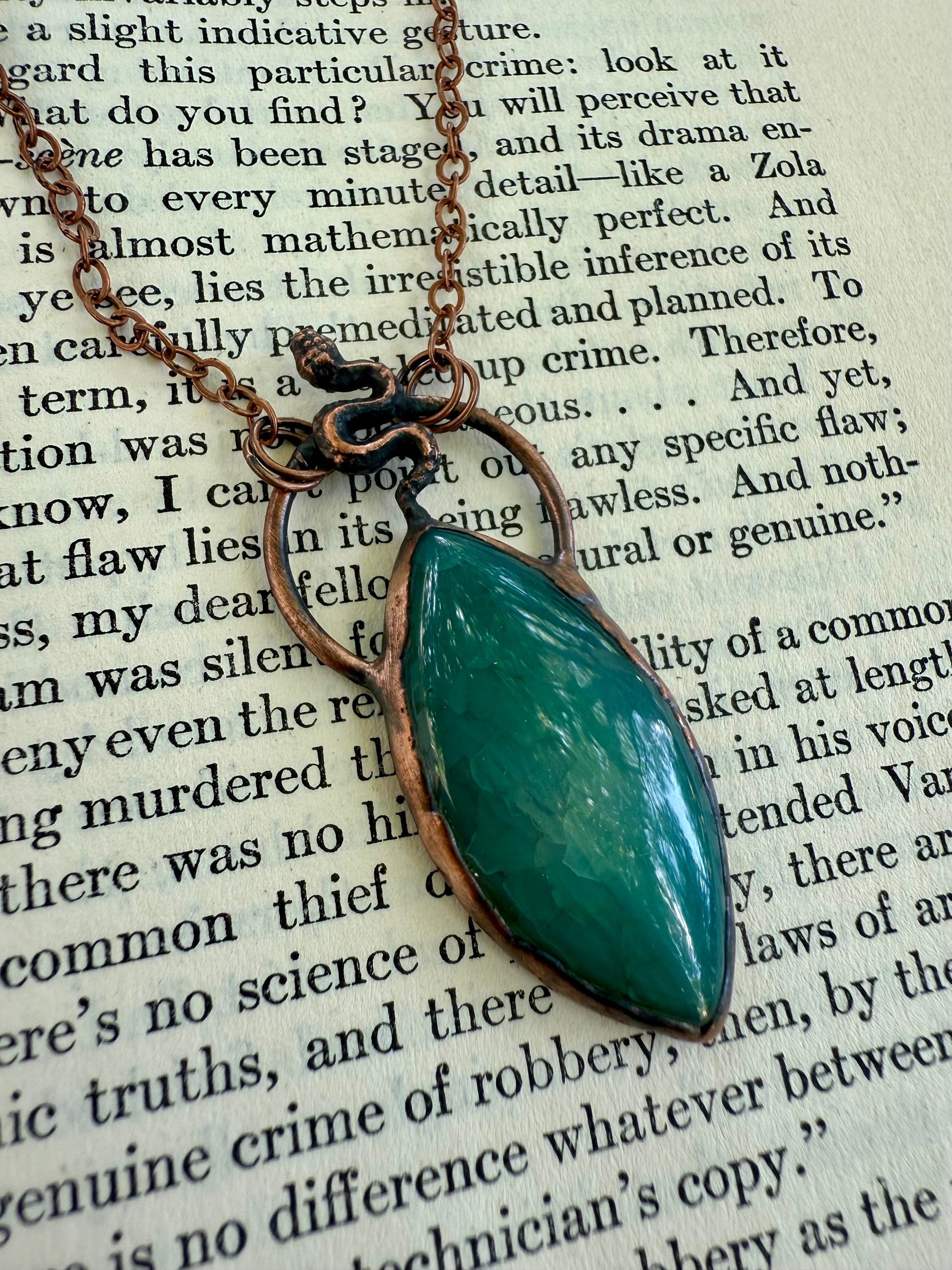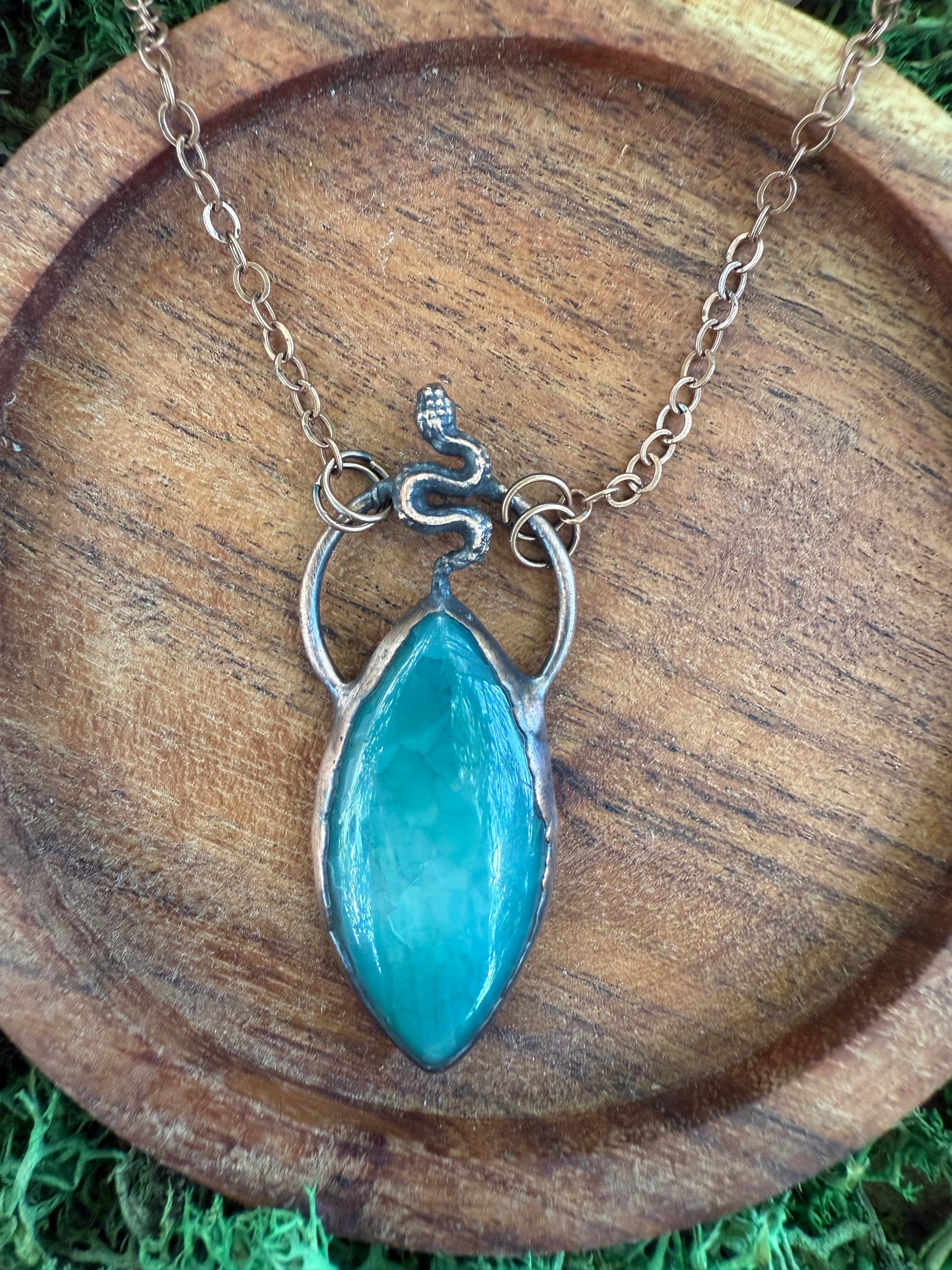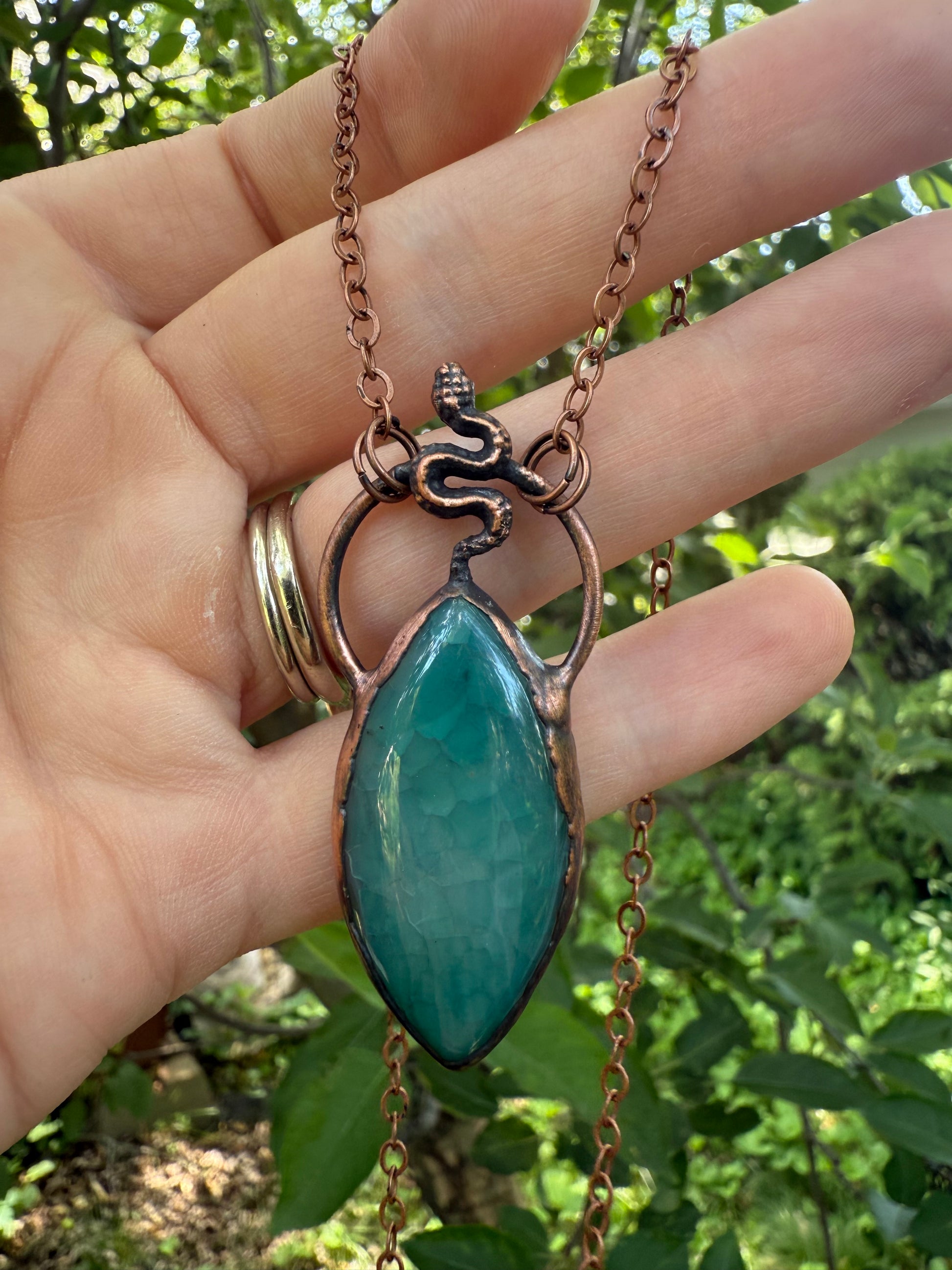 A dyed agate with tiny serpent set on top. Electroformed with copper and strung on a copper chain, you choose your length.
