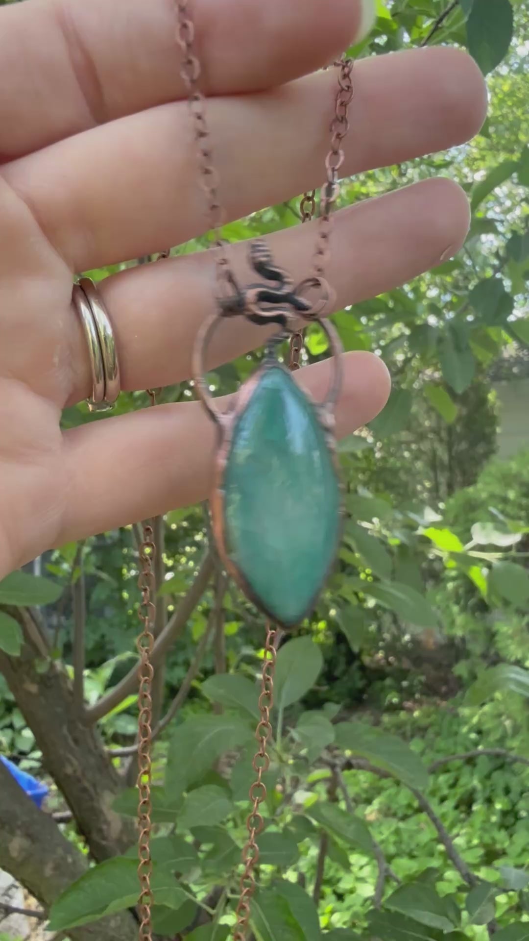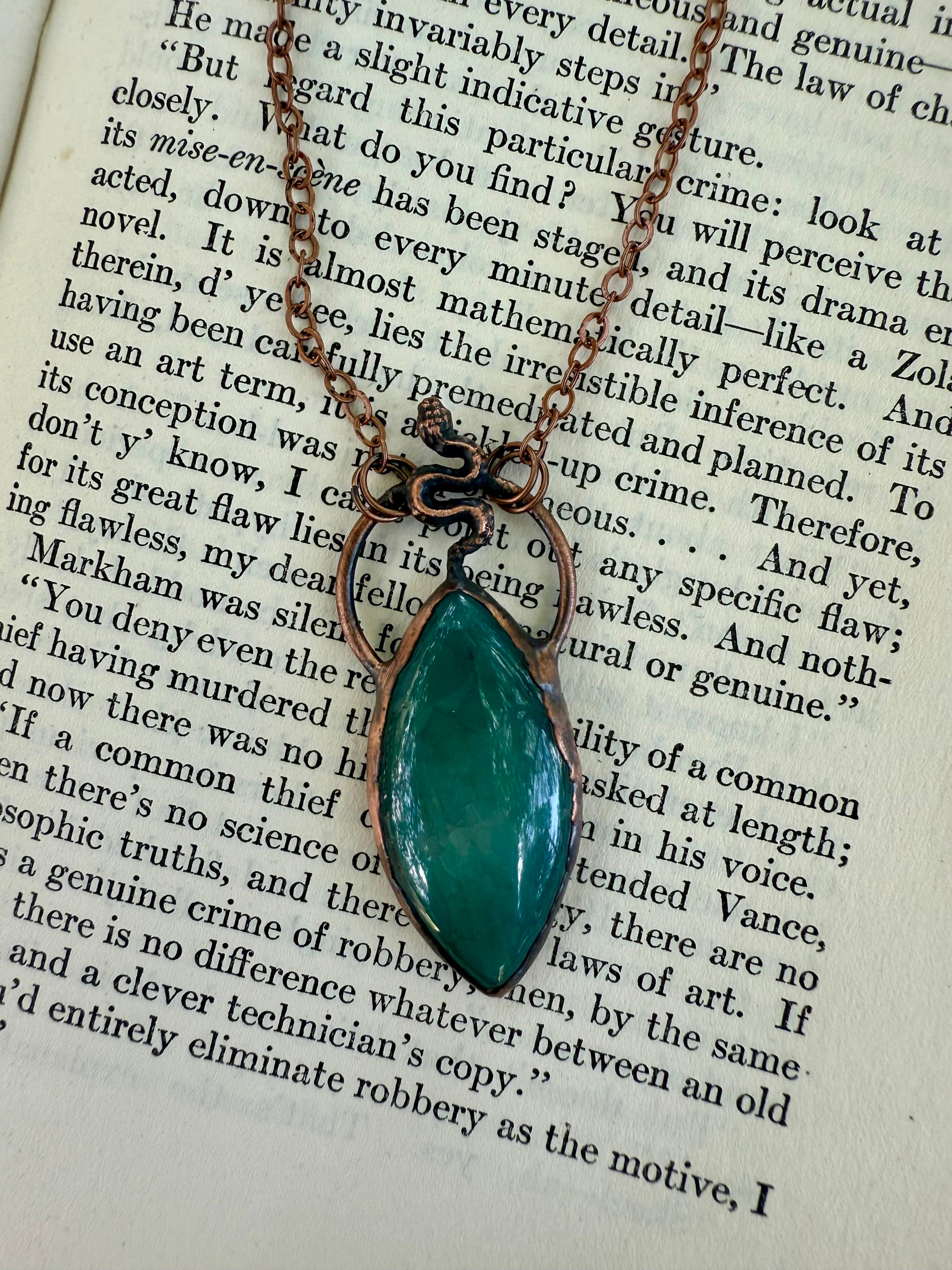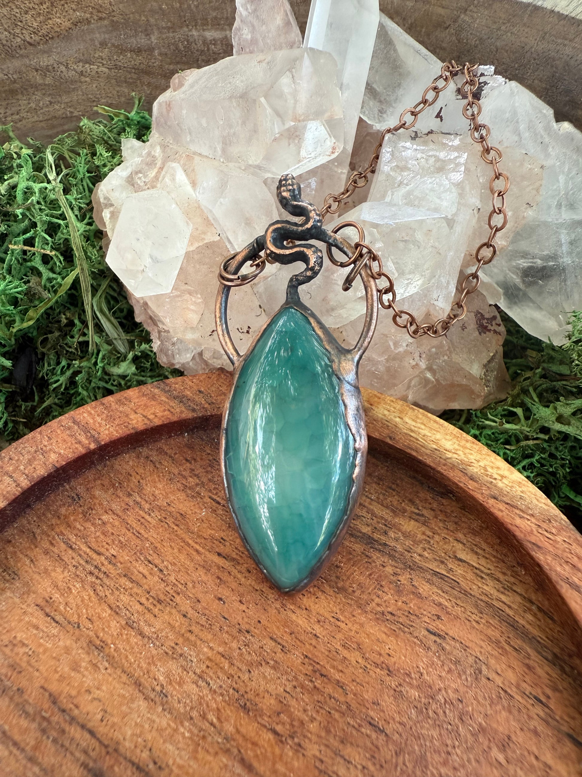 A dyed agate with tiny serpent set on top. Electroformed with copper and strung on a copper chain, you choose your length.