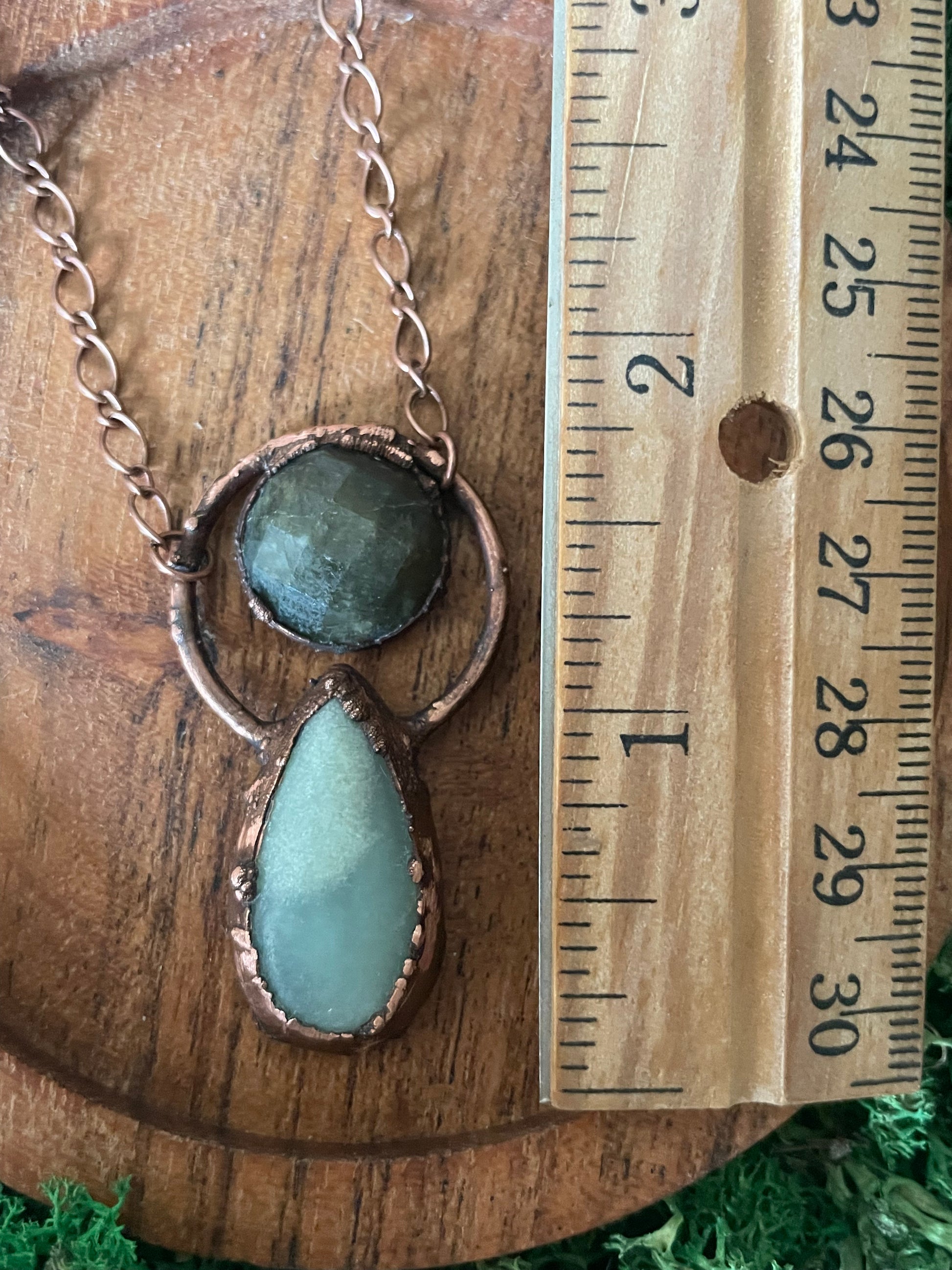 A beautiful teardrop Amazonite Stone with a round faceted Labradorite Crystal. Electroformed with copper. Strung on a copper chain, you choose your length.