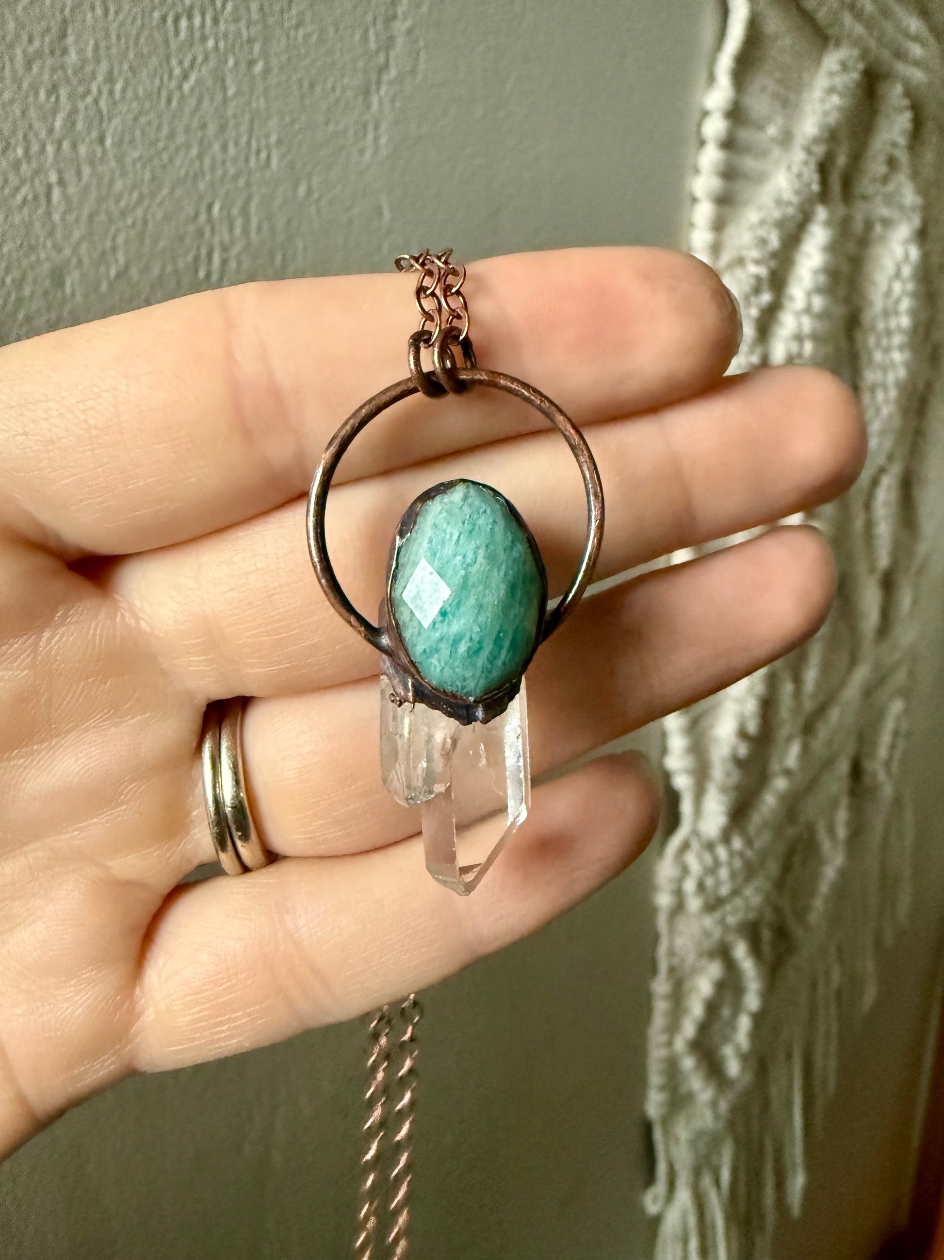 A faceted Amazonite cabochon set on a clear Quart Crystal point. Electroformed with copper and strung on a copper chain, you choose your length.
