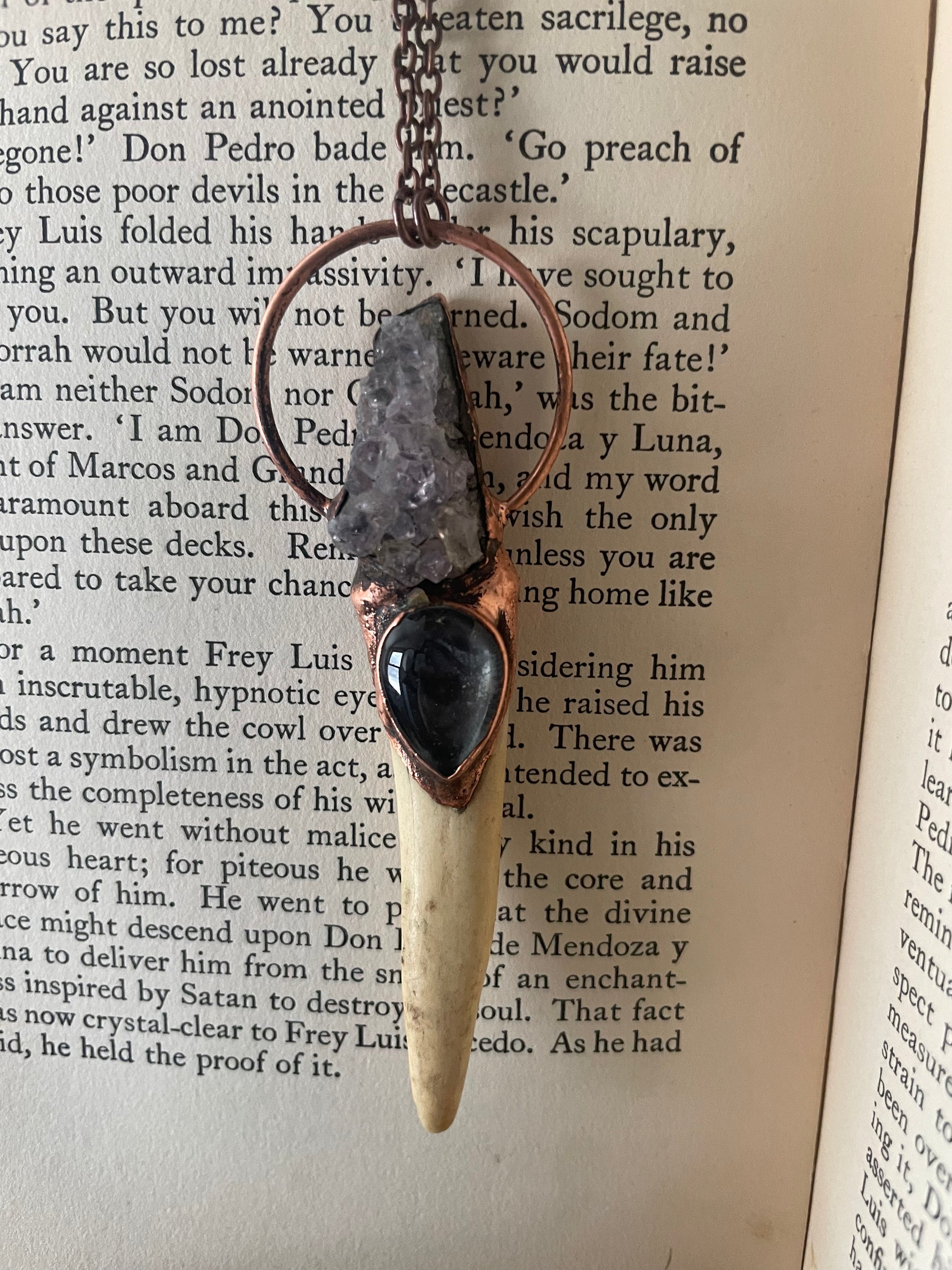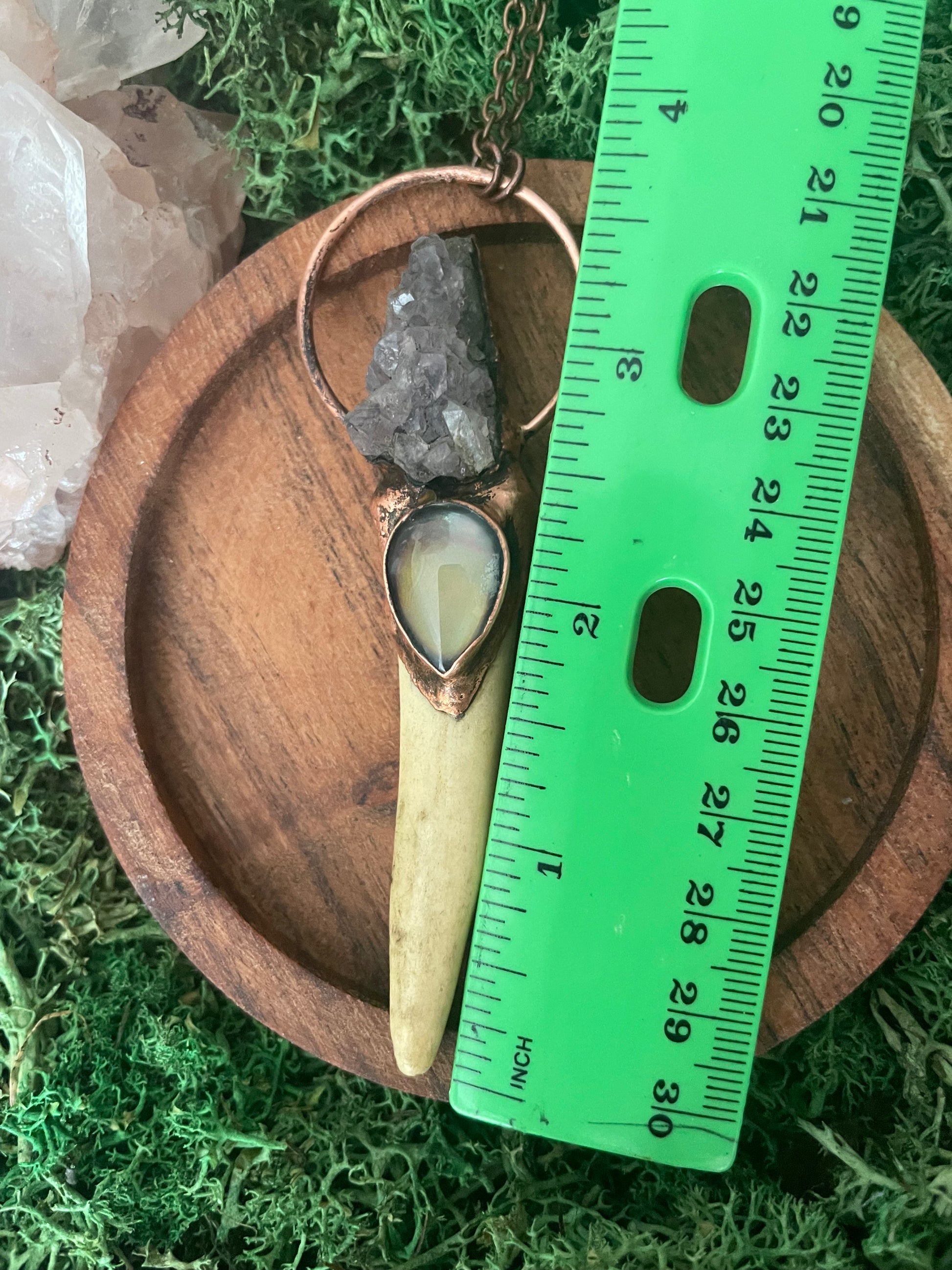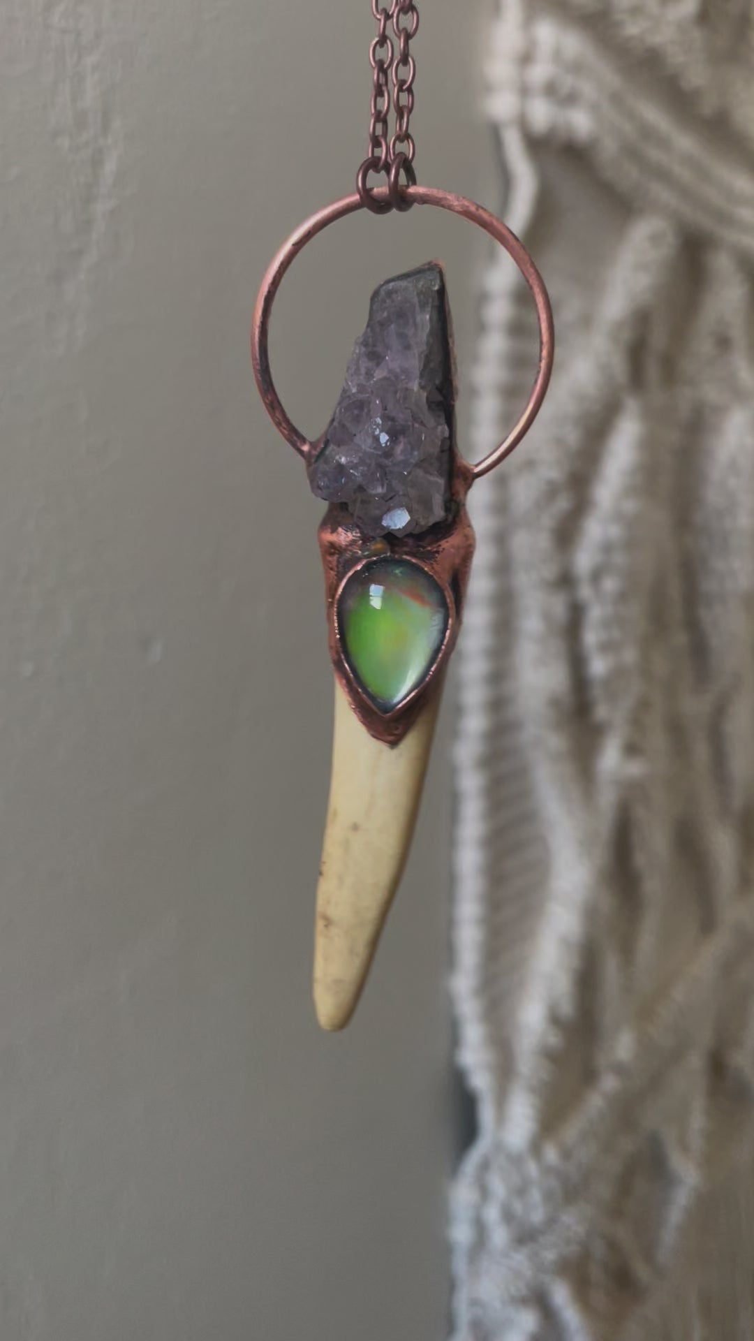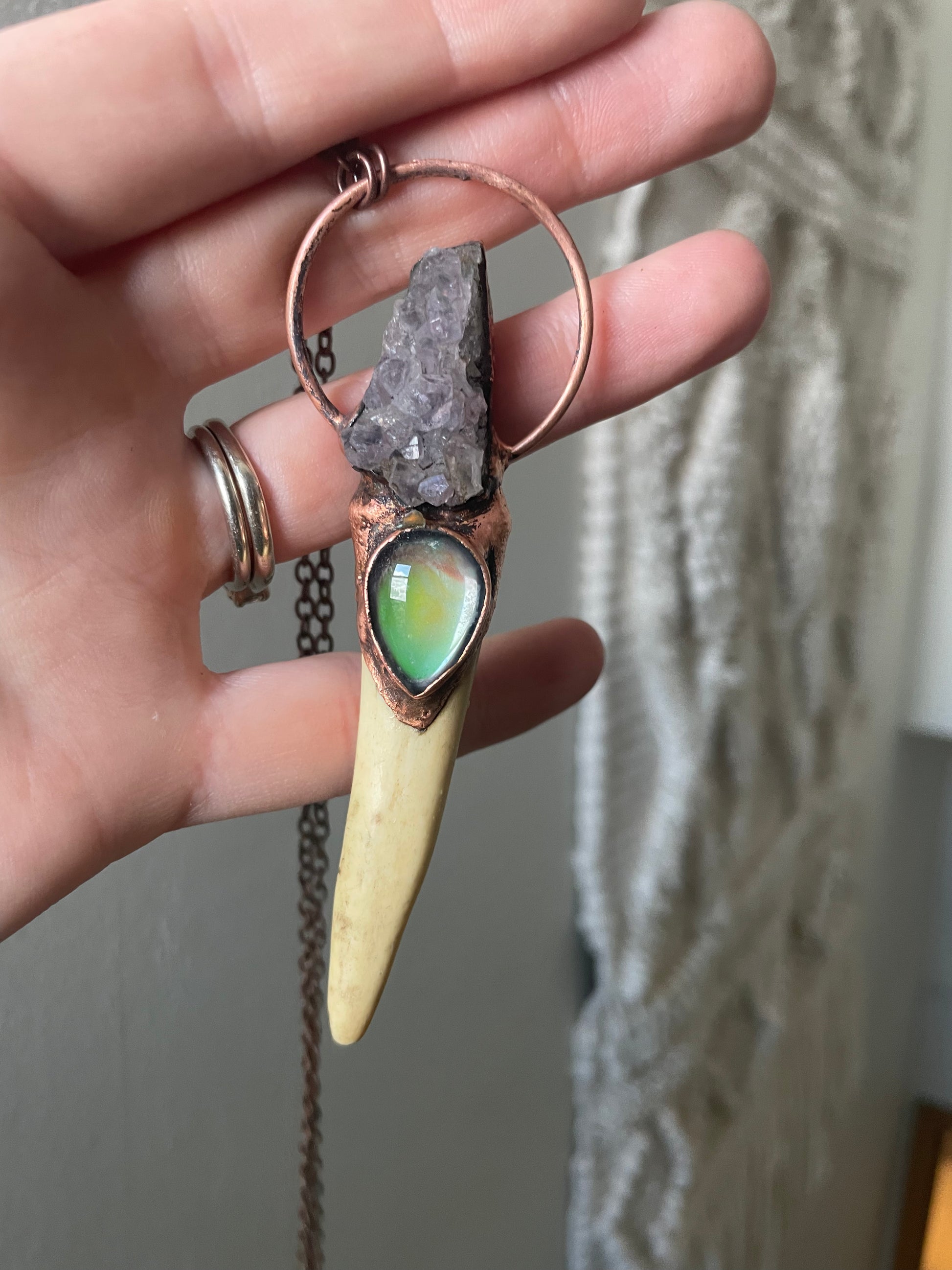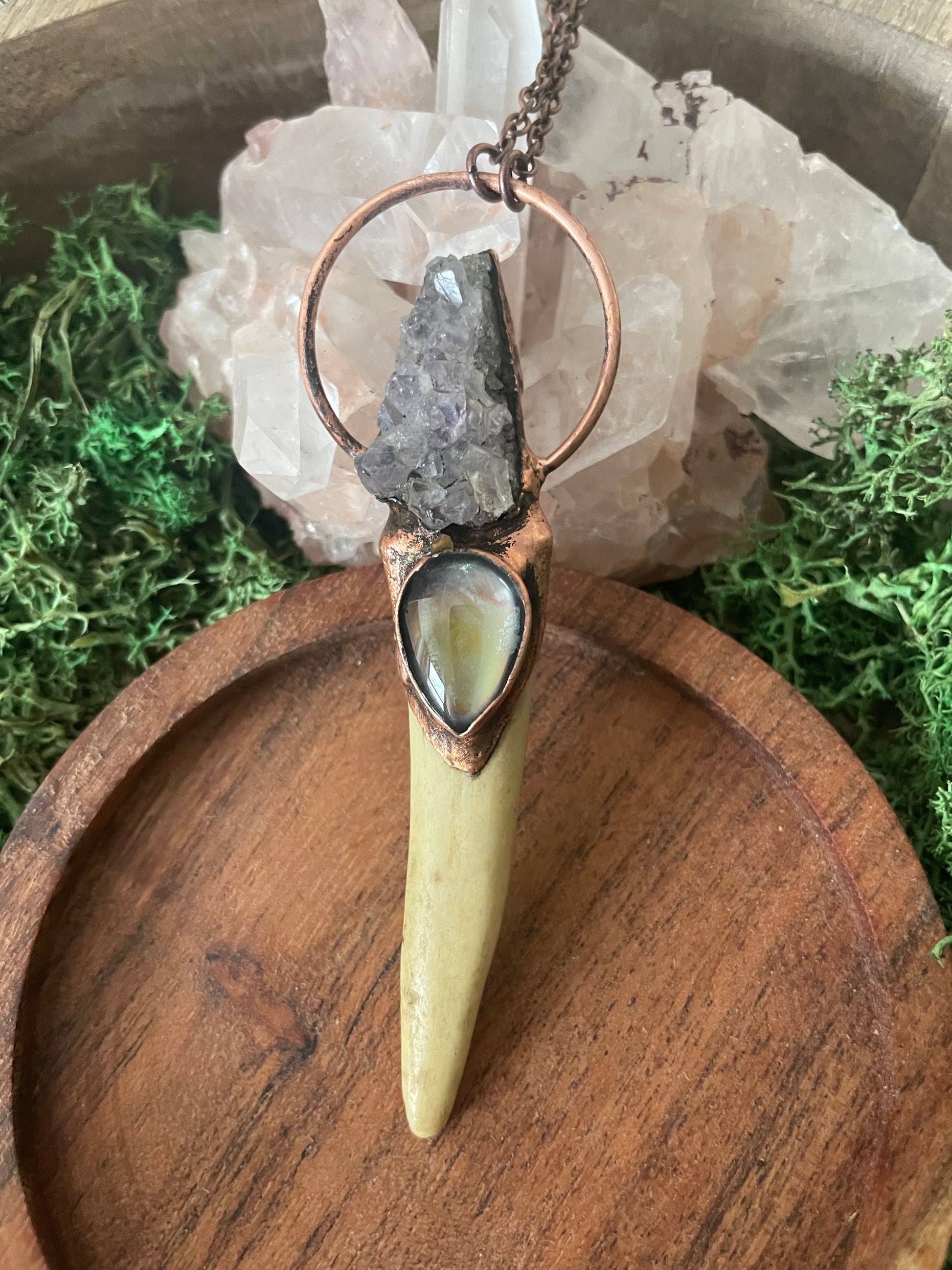 Hand Sculpted with an Amethyst Cluster and temperature color changing Mood Stone rest on an Deer Antler horn. Electroformed with copper and strung on a copper chain, you choose your length. This versatile piece can be worn as a necklace or hung on a wall.
