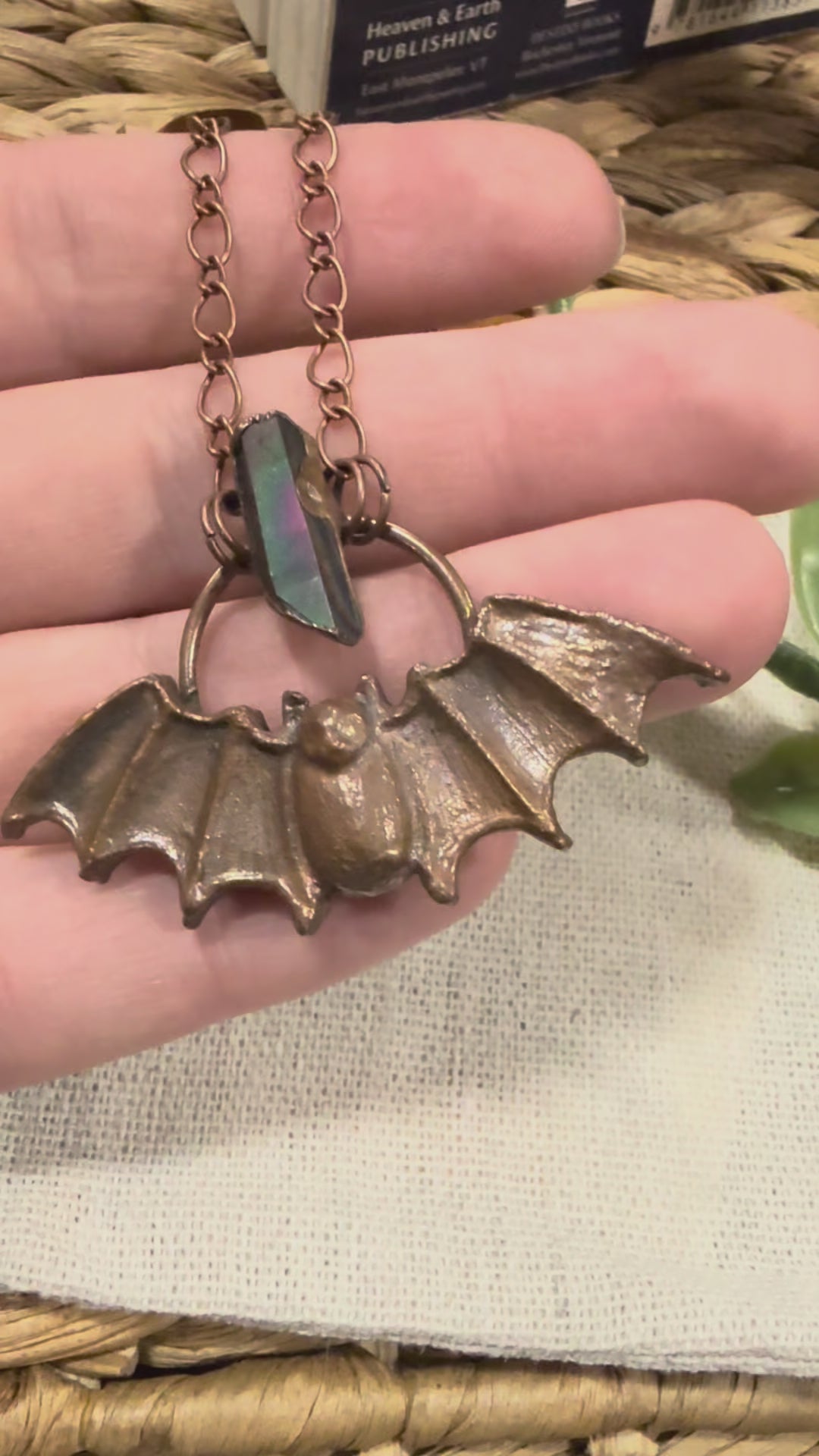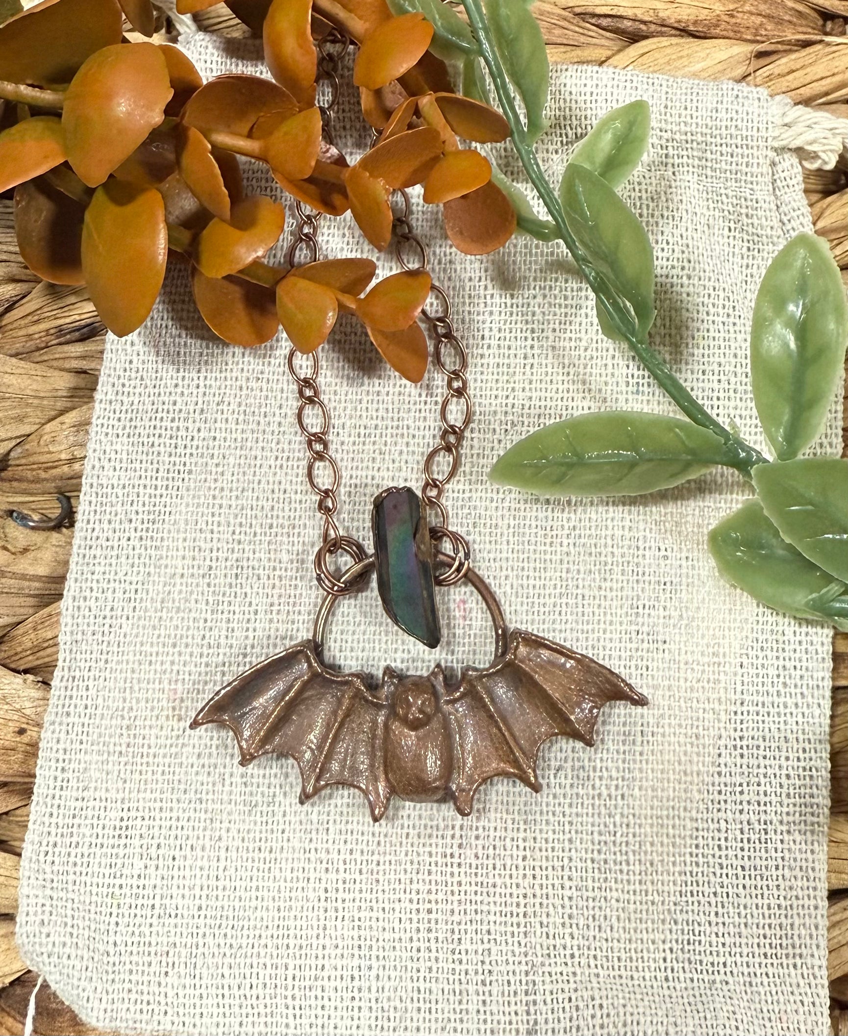 Copper Bat with Aura Quartz. Electroformed with copper and strung on a copper chain, you choose your length.
