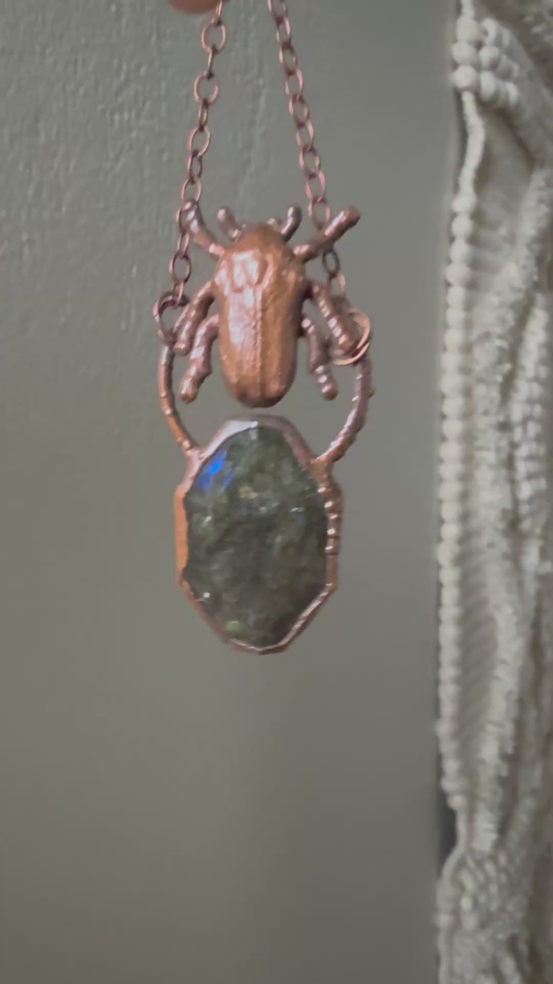 A plastic Bettle with a Labradorite stone crystal. Electroformed with copper and strung on a copper chain, you choose your length.