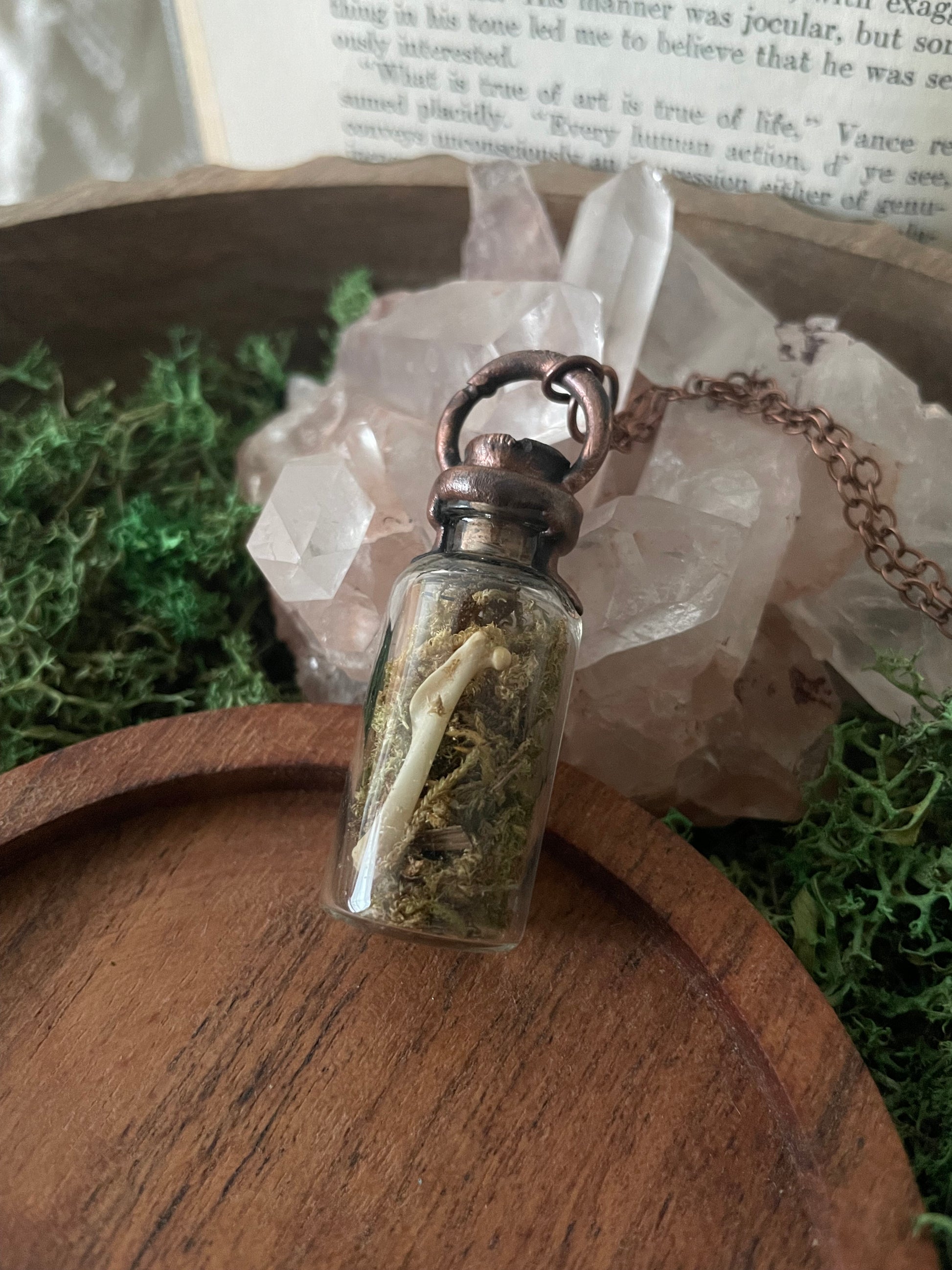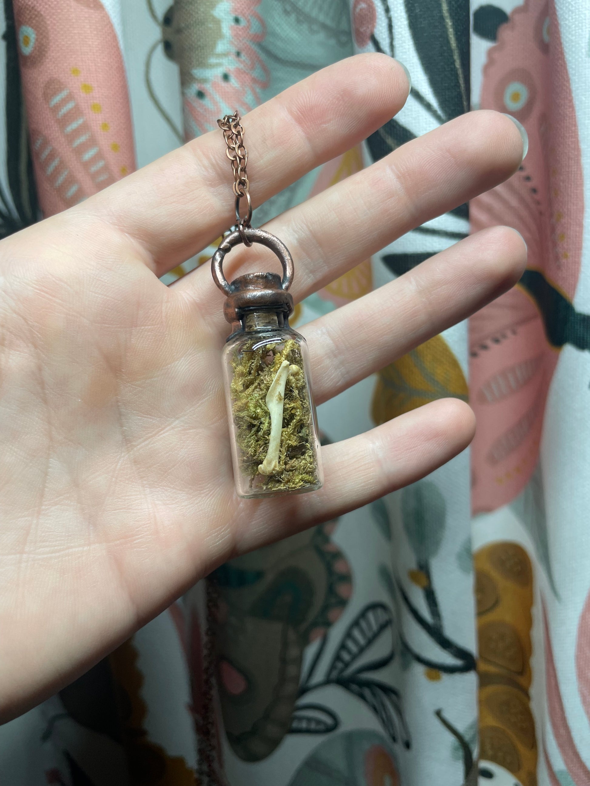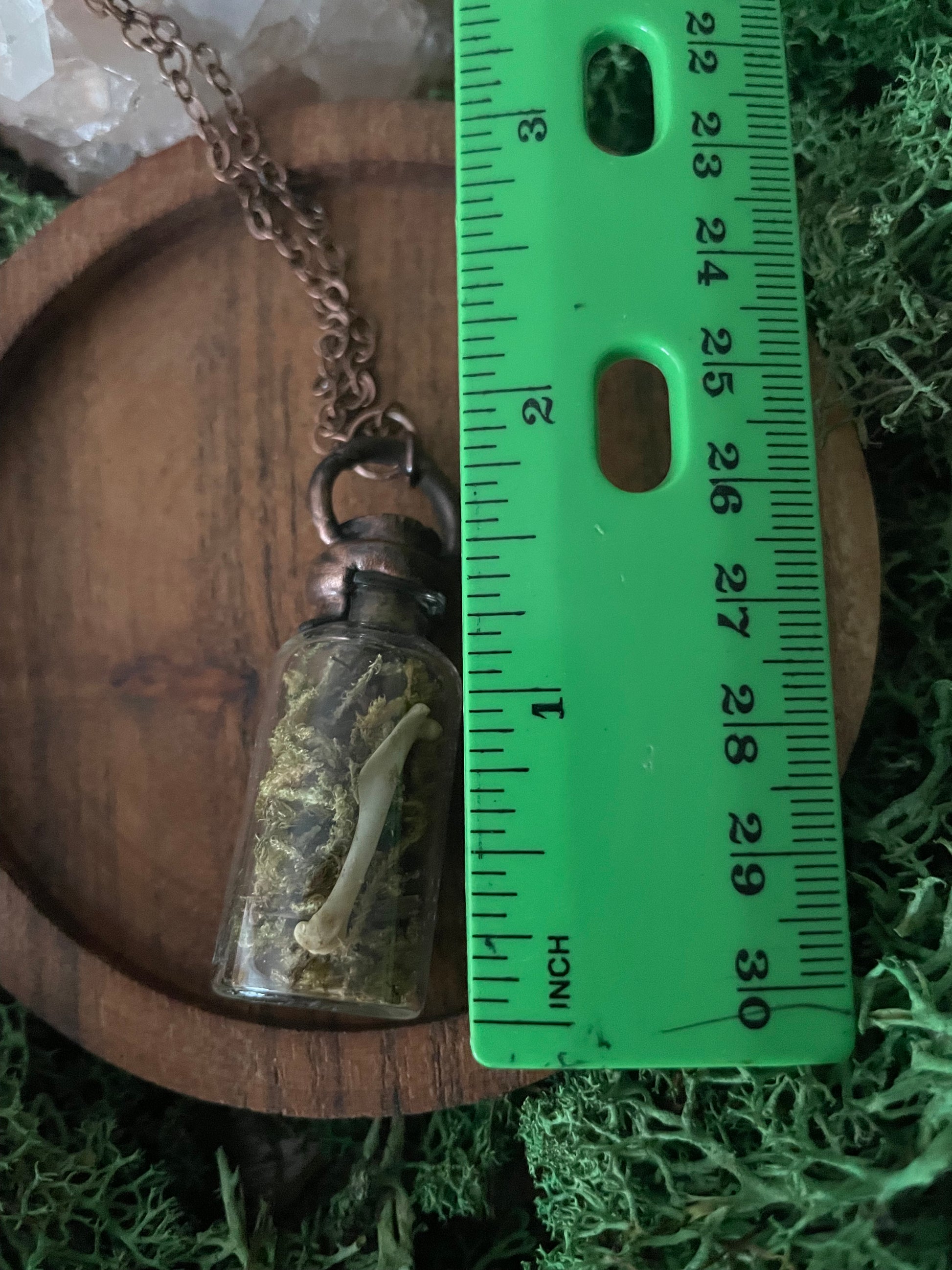 A small glass vial with moss and small bone sourced from an owl pellet, Electroformed with copper and strung on a copper chain, you choose your length.