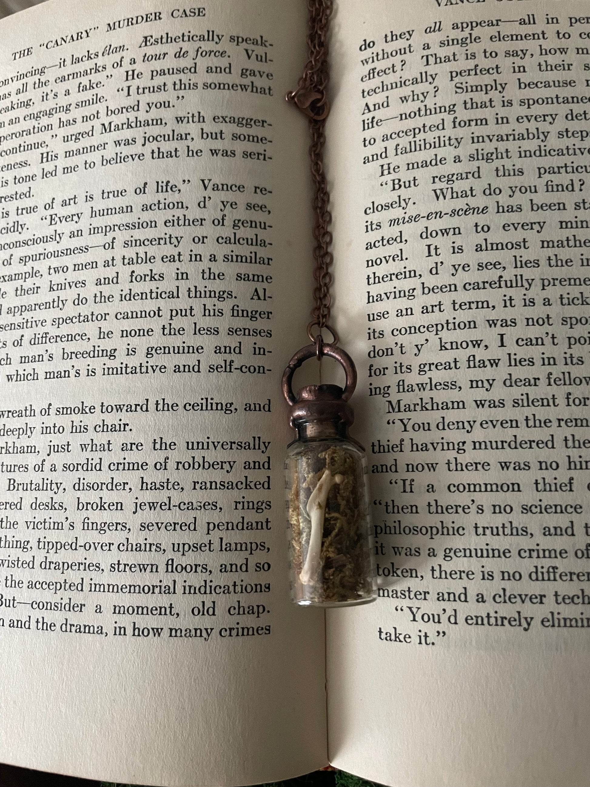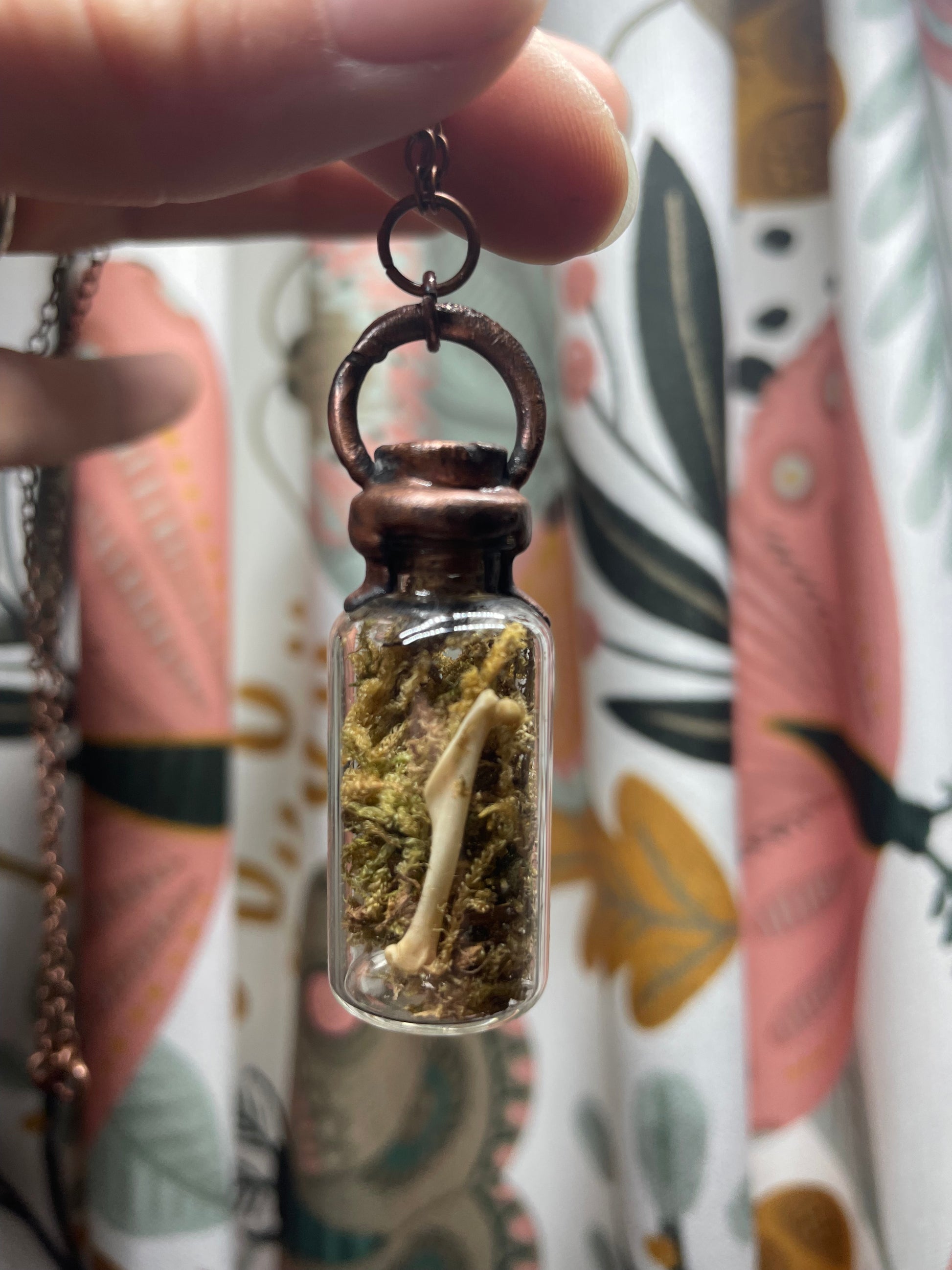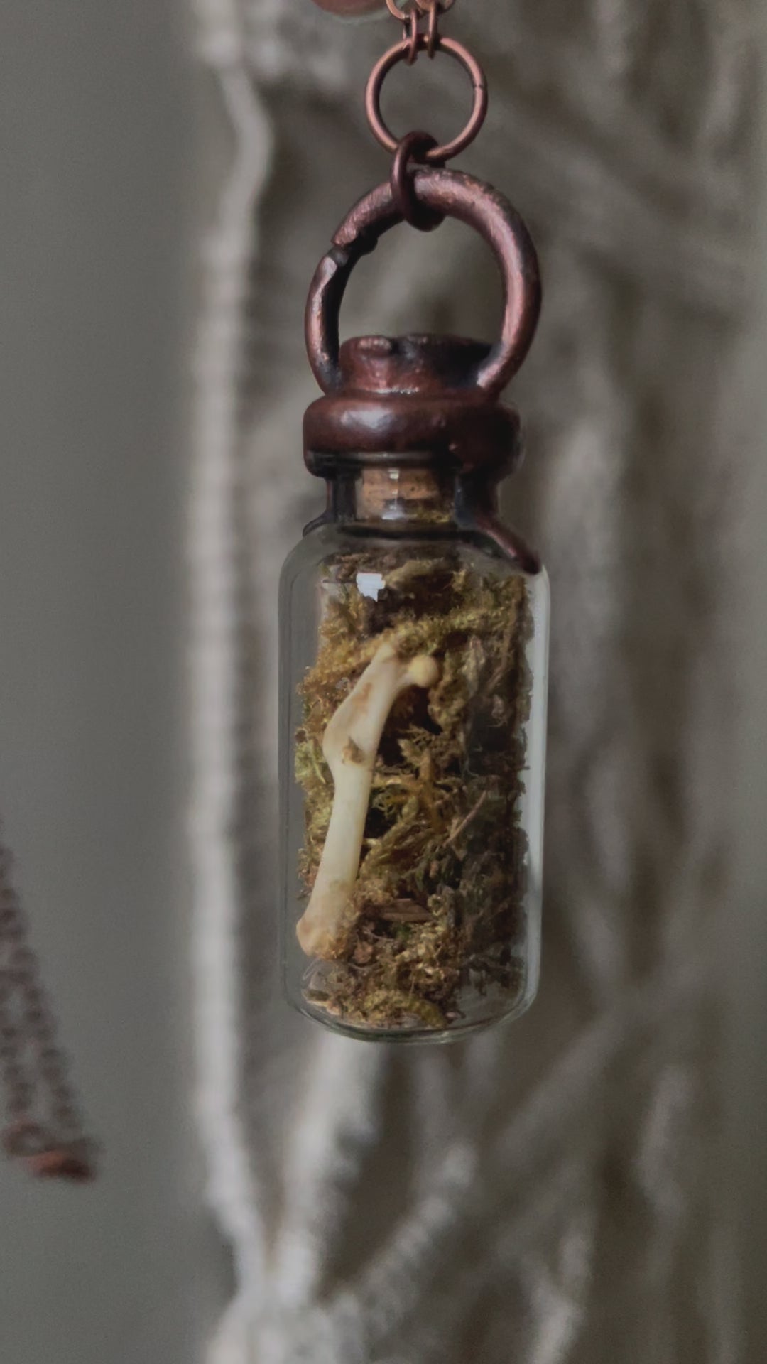 A small glass vial with moss and small bone sourced from an owl pellet, Electroformed with copper and strung on a copper chain, you choose your length.