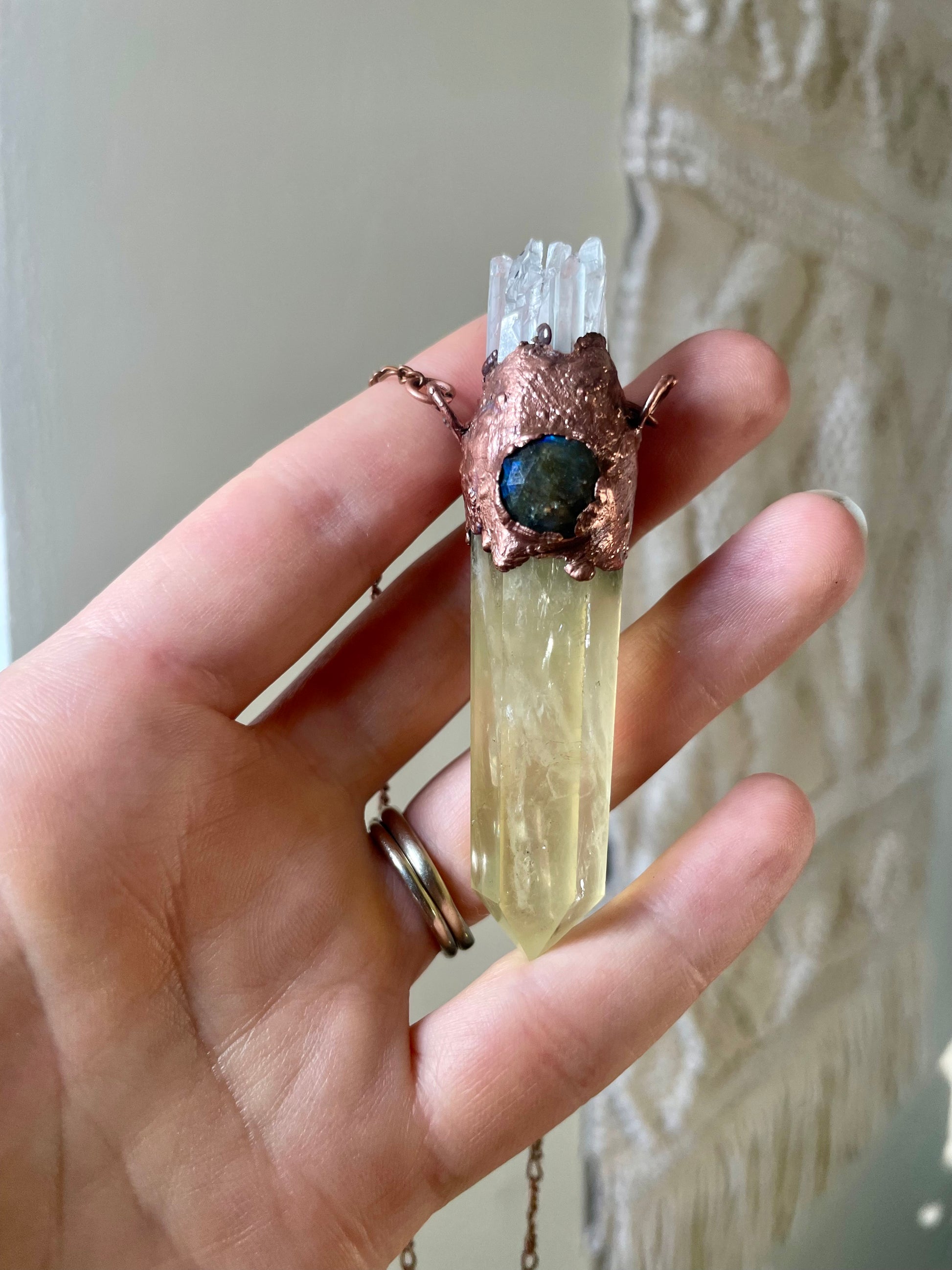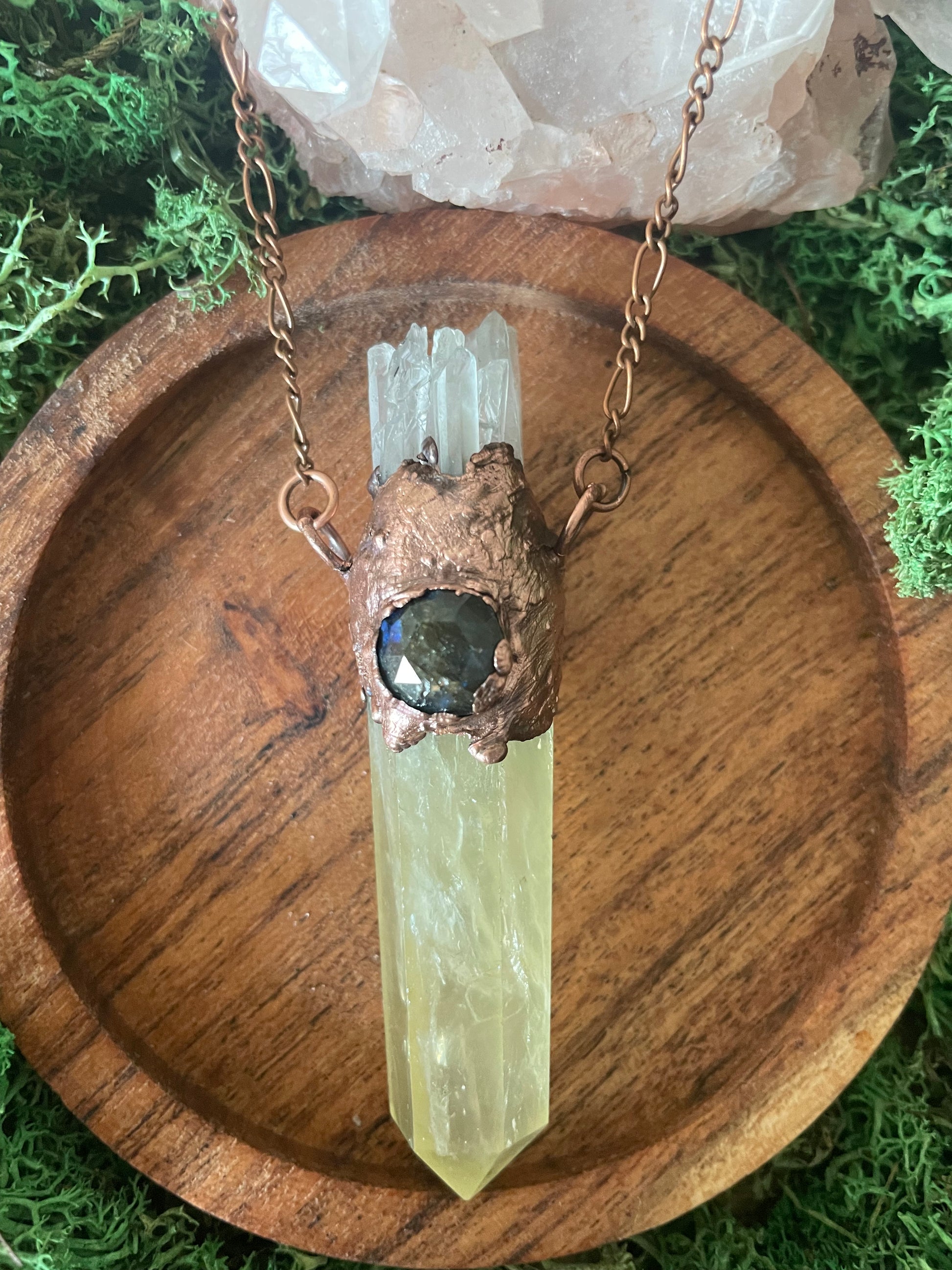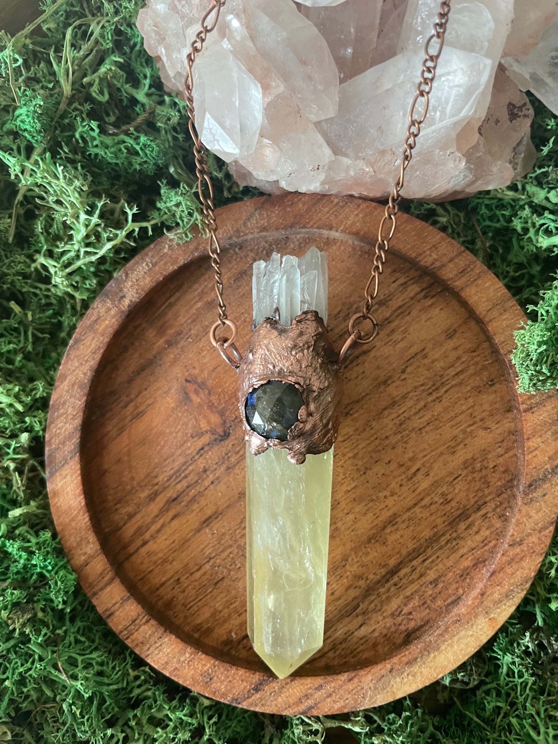 Citrine Crystal Point with Quartz Crystal Cluster and Labradorite Faceted Stone Cabachon. Electroformed with copper and strung on a copper chain, you choose your length.