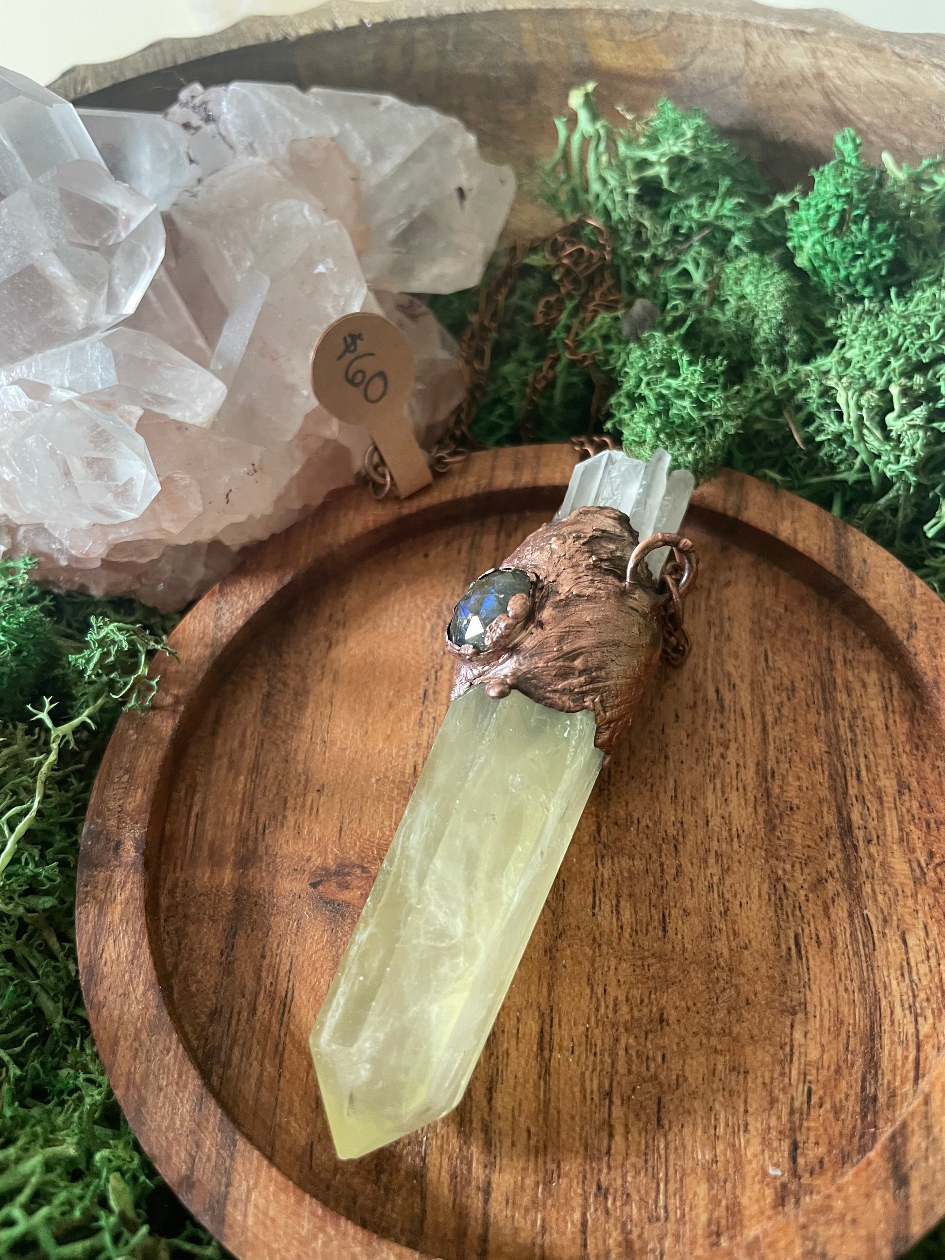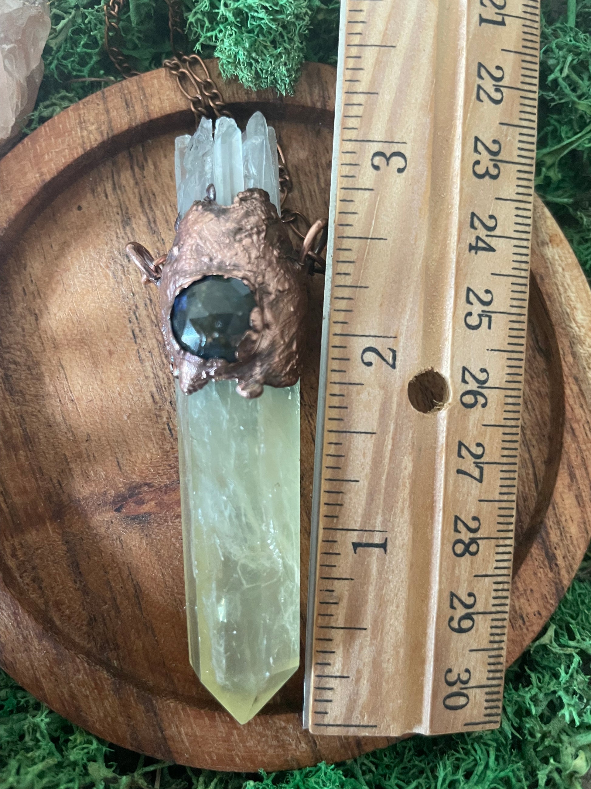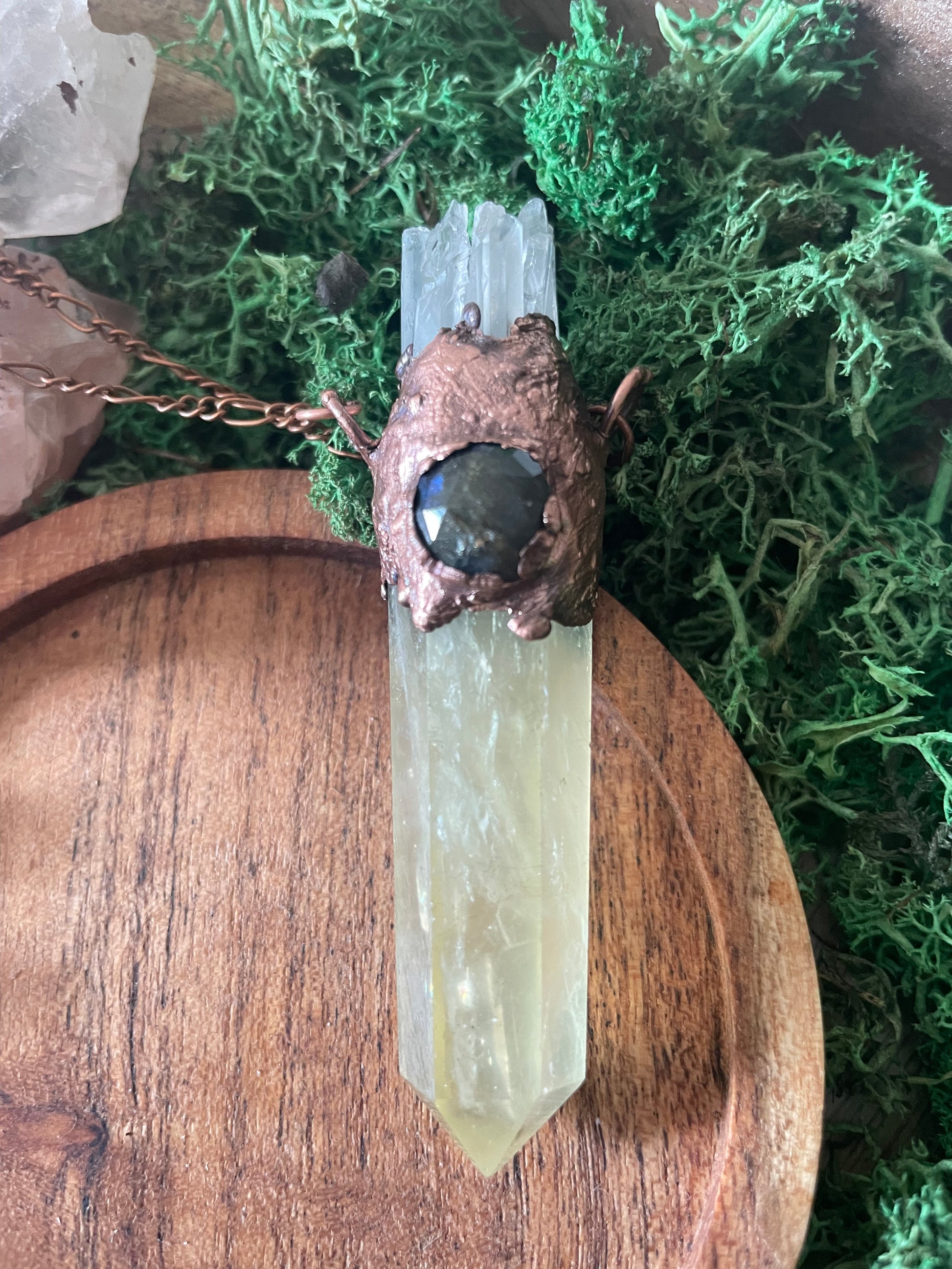 Citrine Crystal Point with Quartz Crystal Cluster and Labradorite Faceted Stone Cabachon. Electroformed with copper and strung on a copper chain, you choose your length.