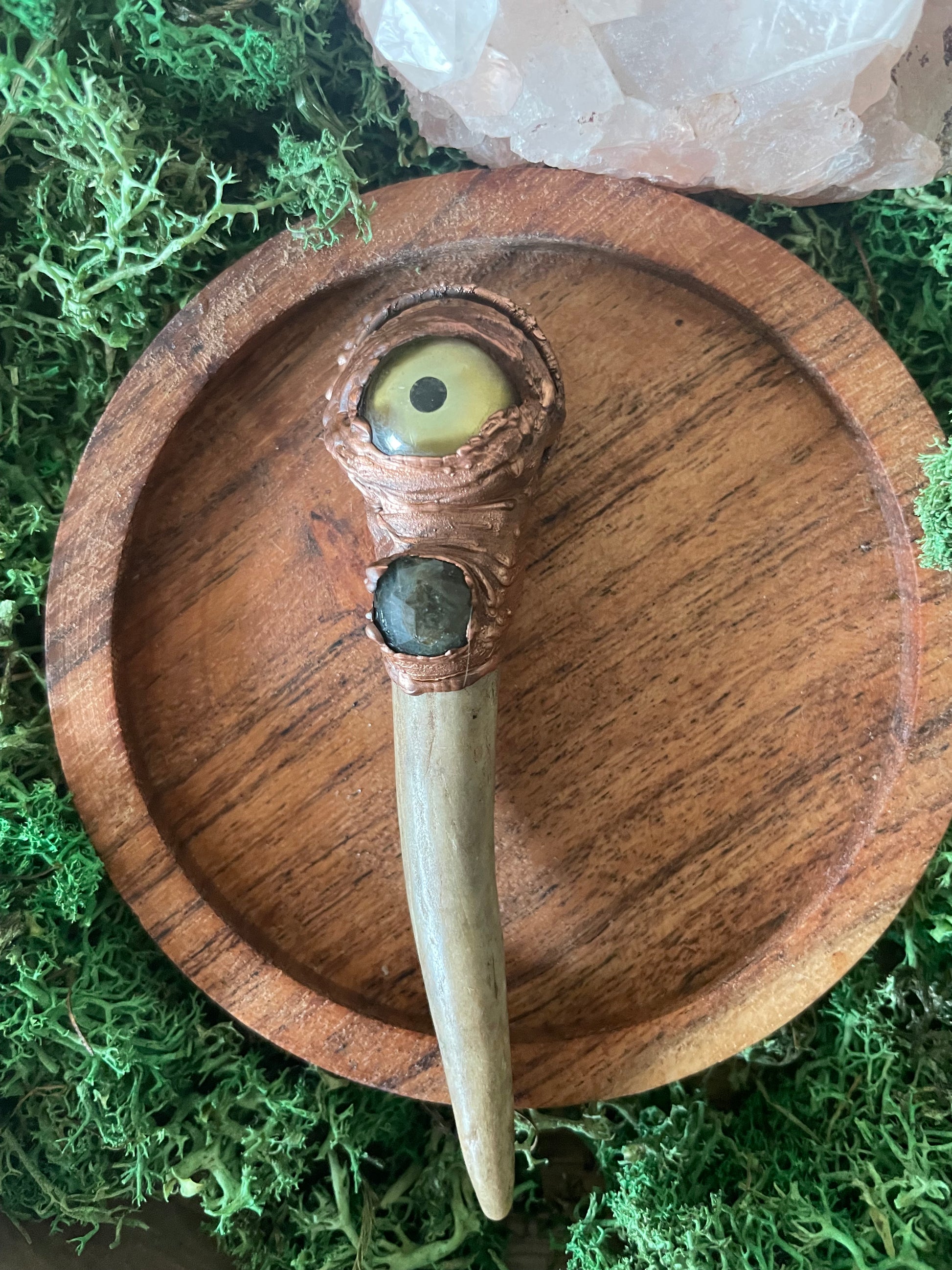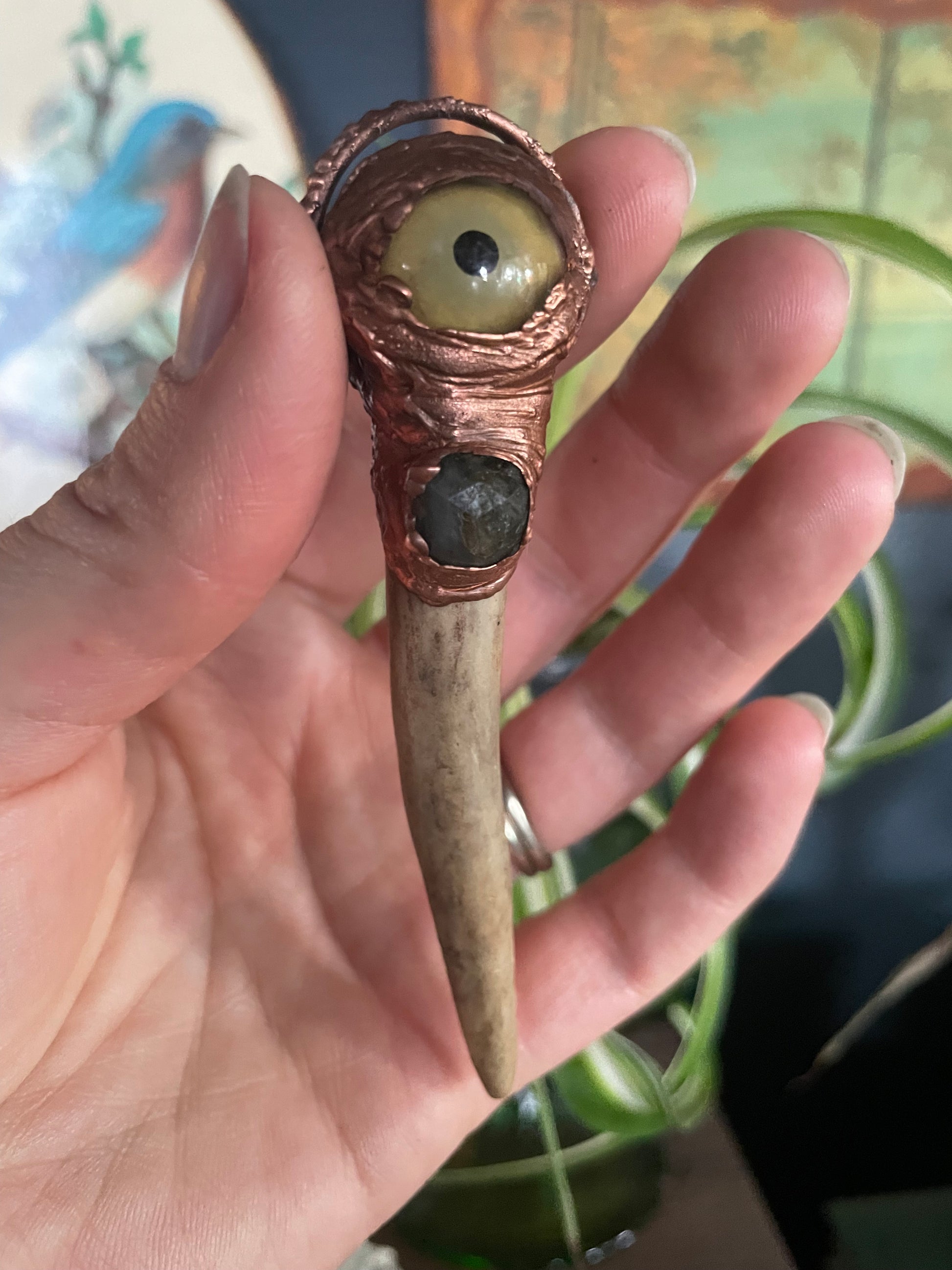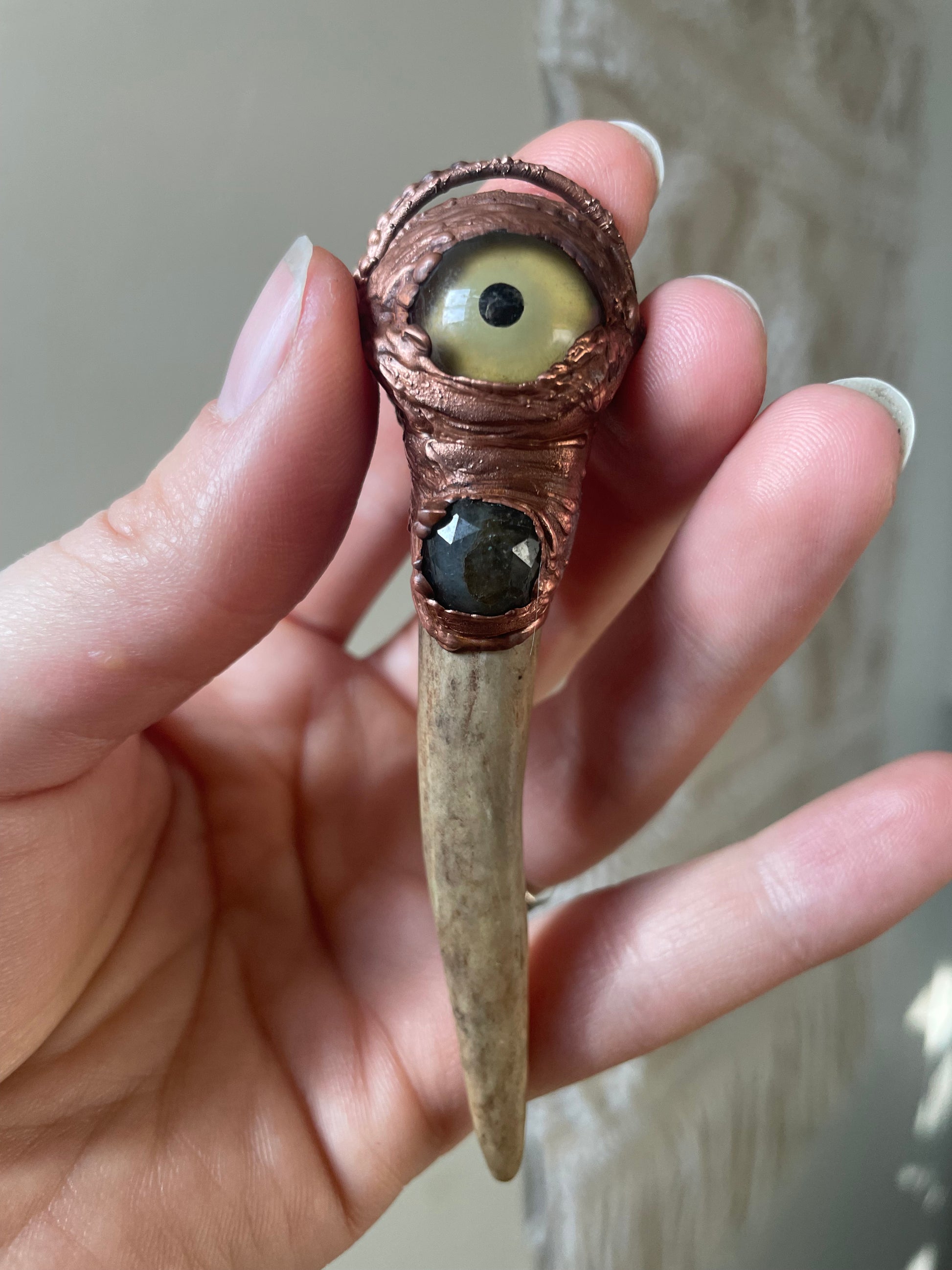 Hand Sculpted with a Glass Eye and Labradorite Stone rest on an Antler horn. Electroformed with copper and strung on a copper chain, you choose your length. This versatile piece can be worn as a necklace or hung on a wall.