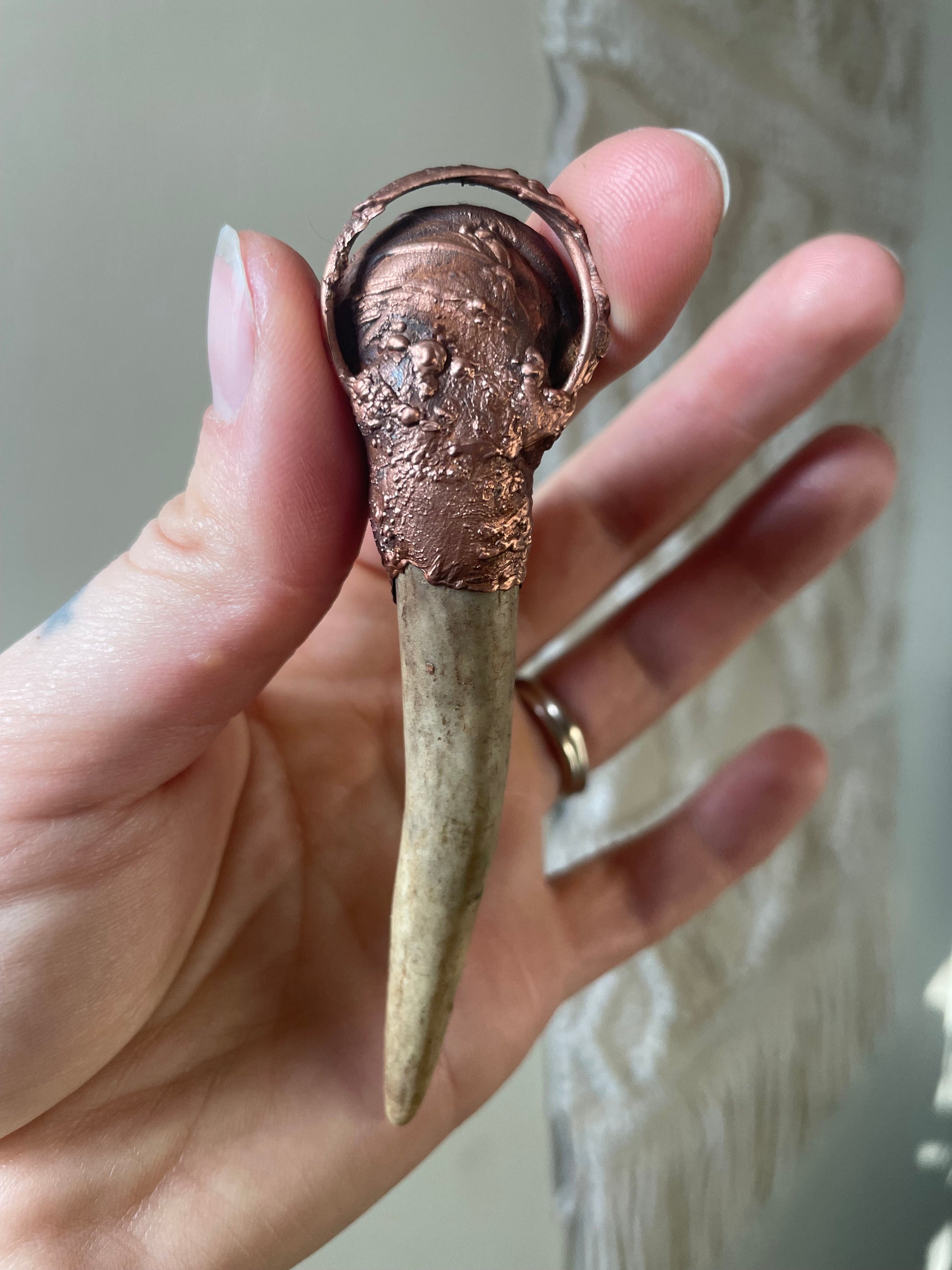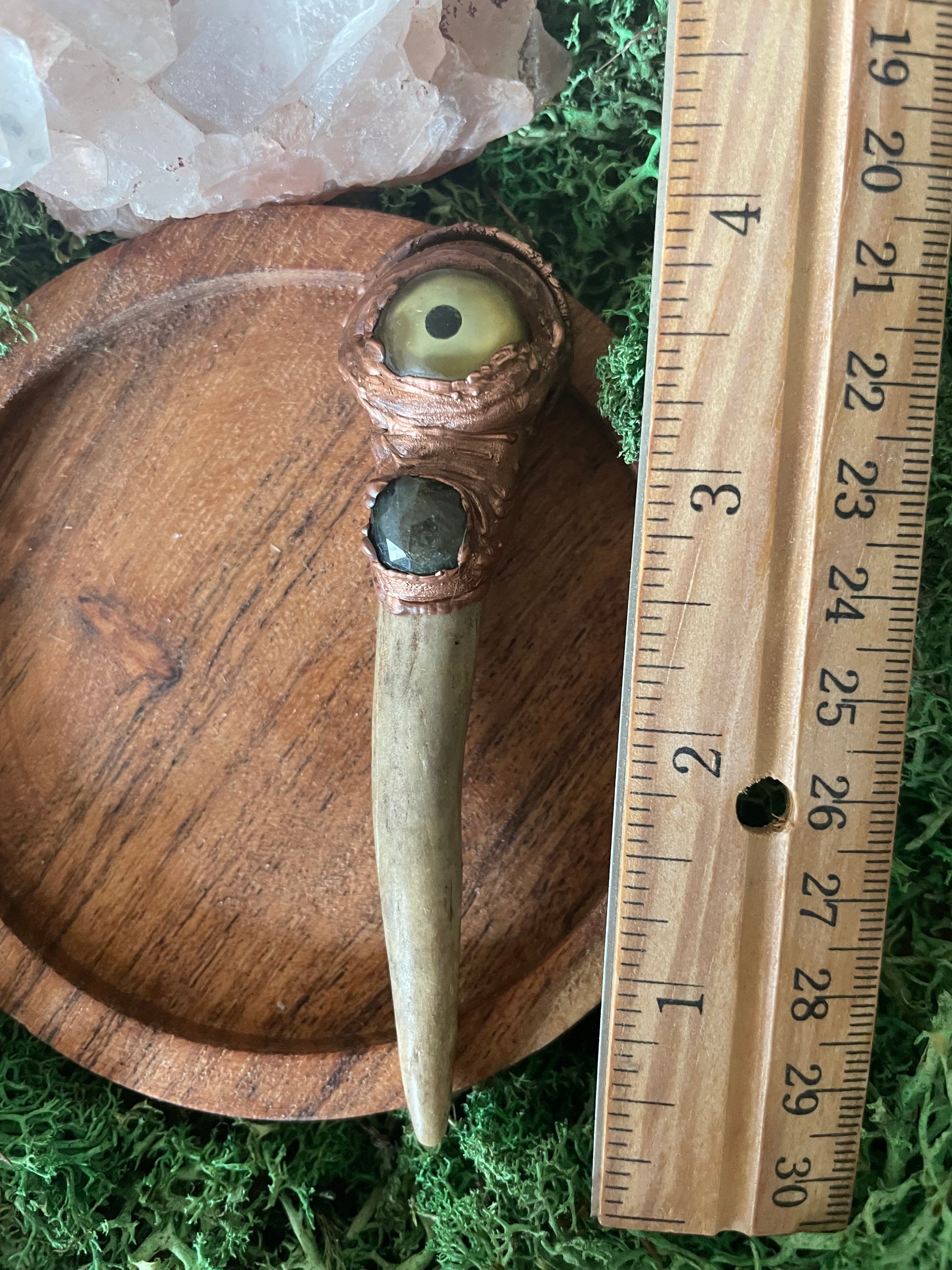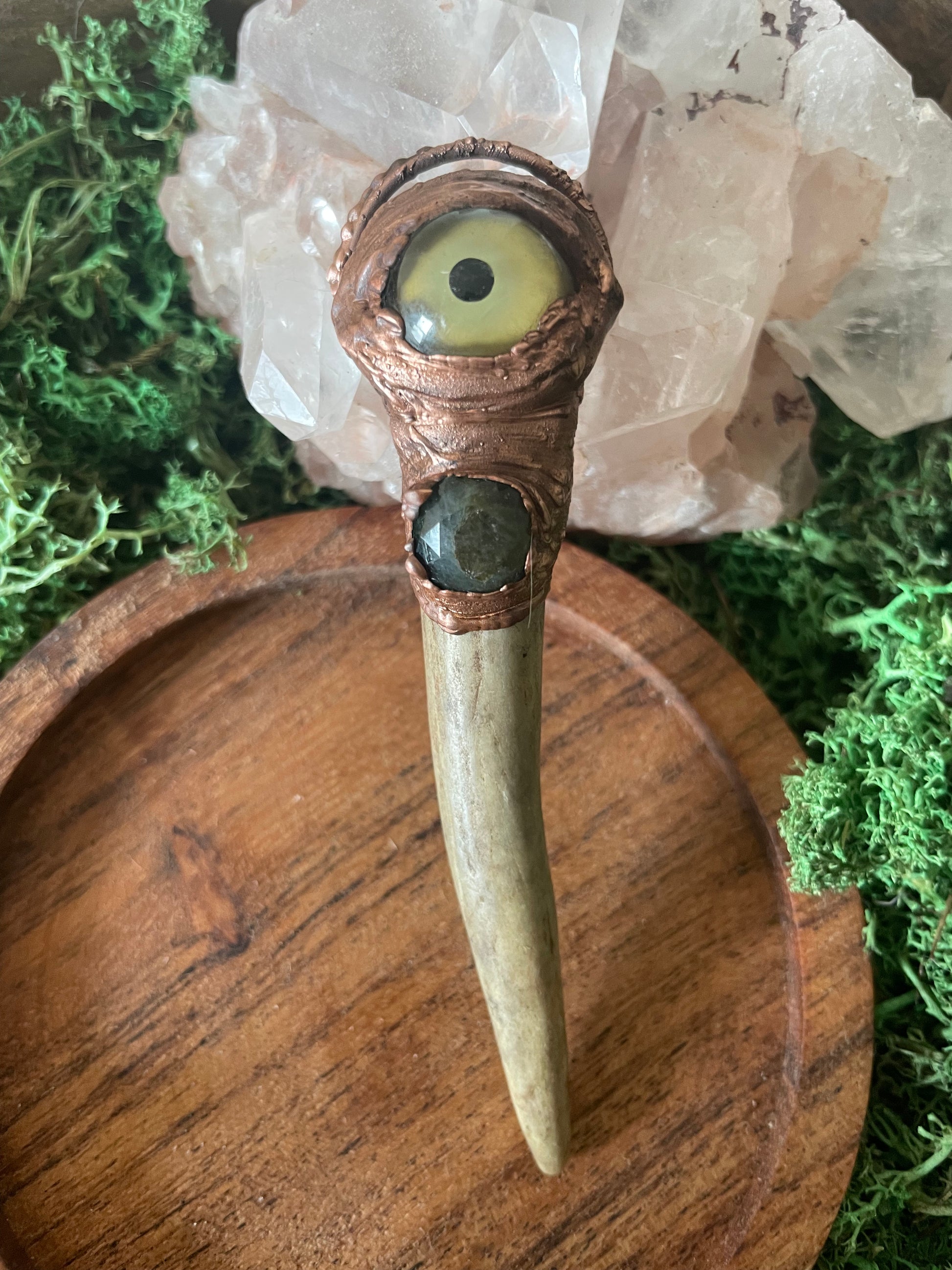 Hand Sculpted with a Glass Eye and Labradorite Stone rest on an Antler horn. Electroformed with copper and strung on a copper chain, you choose your length. This versatile piece can be worn as a necklace or hung on a wall.