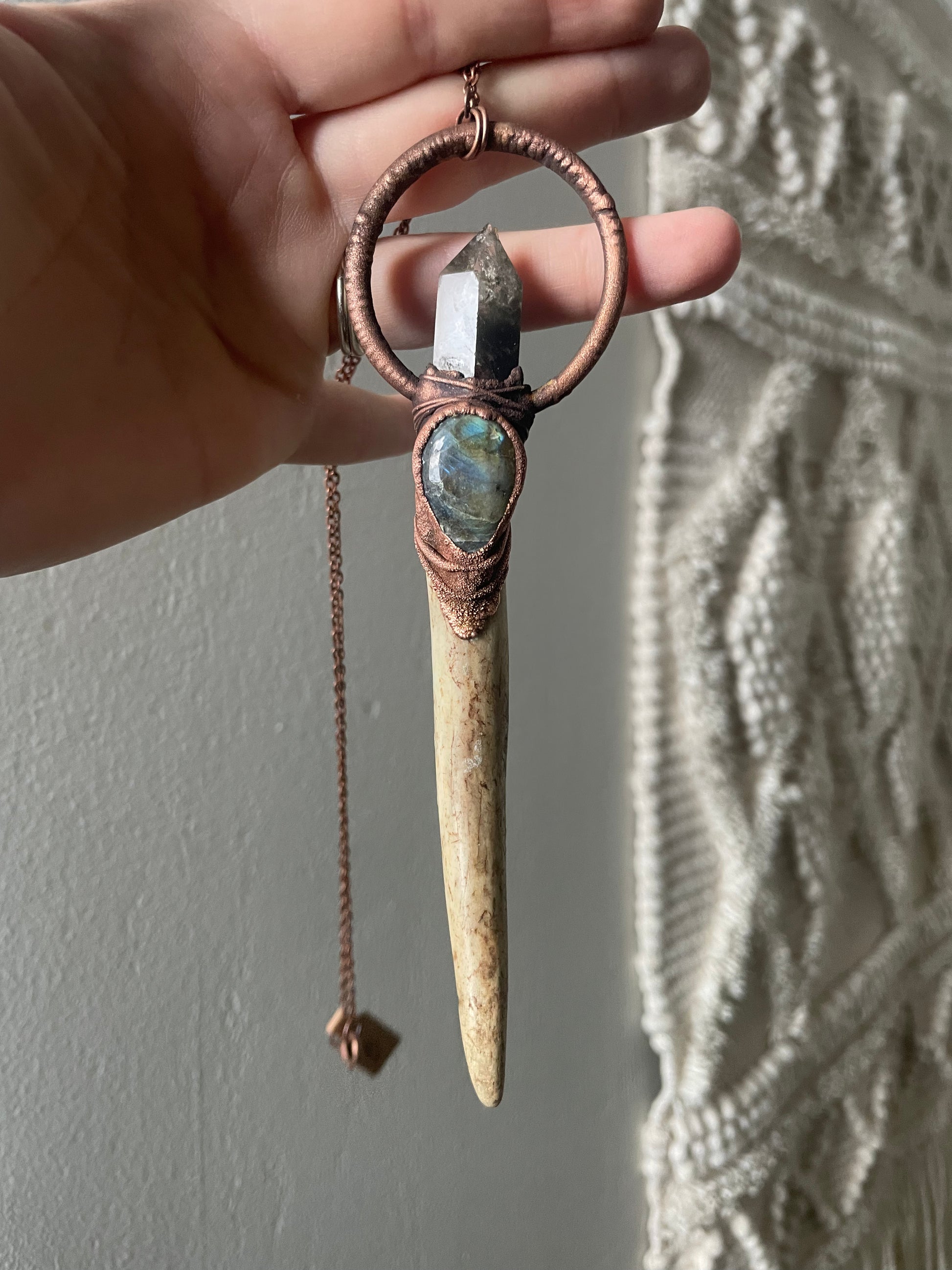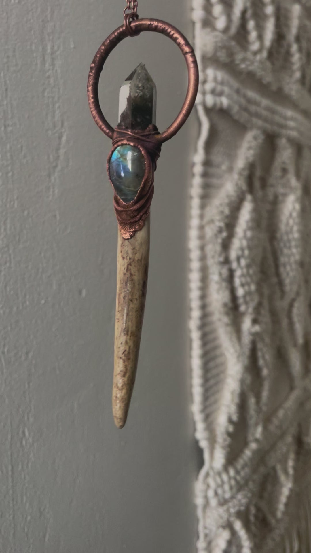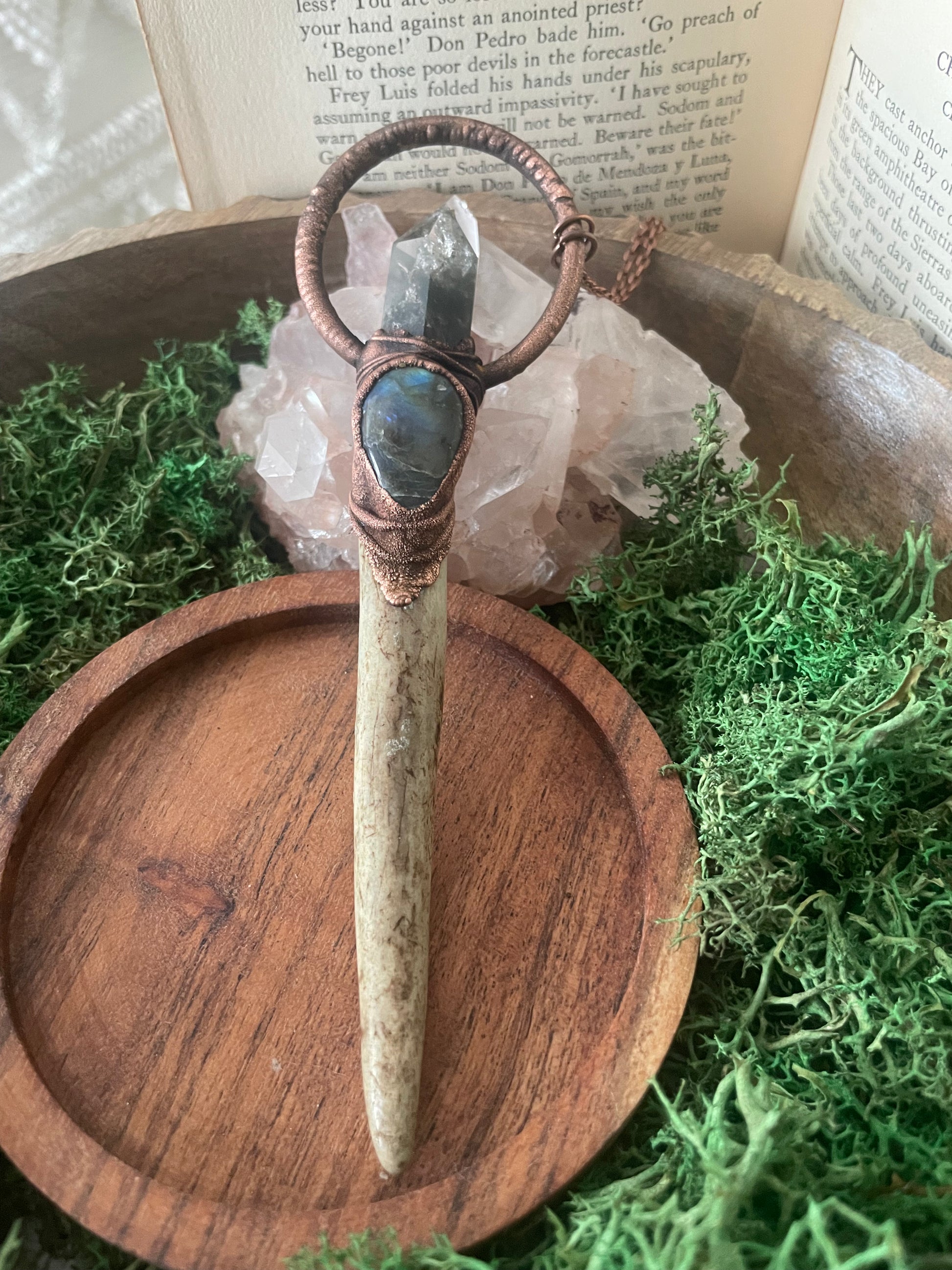 Hand Sculpted with a large Garden Quartz point on top and a Labradorite Cabochon rest on an Deer Antler horn. Electroformed with copper and strung on a copper chain, you choose your length. This versatile piece can be worn as a necklace or hung on a wall.
