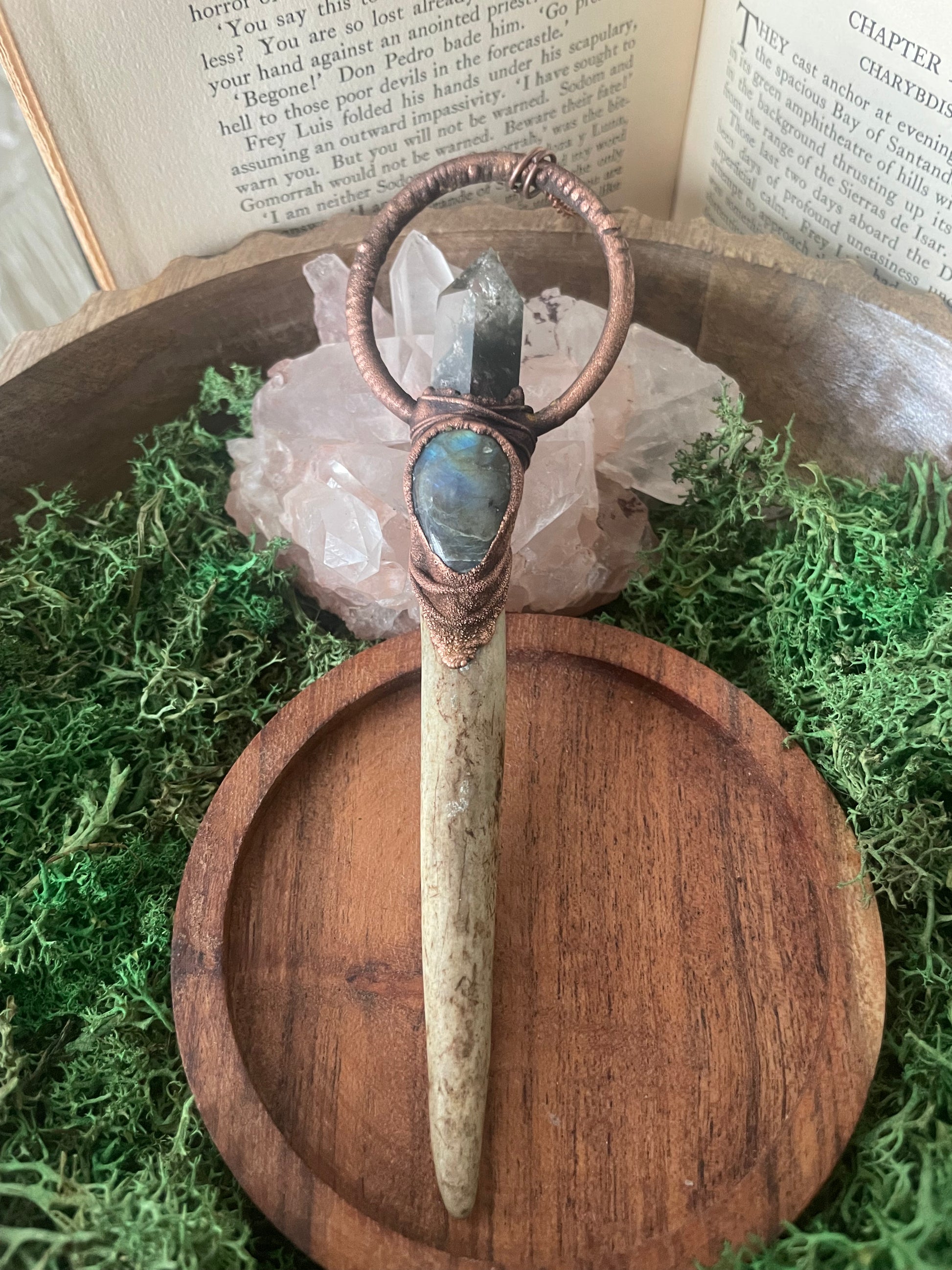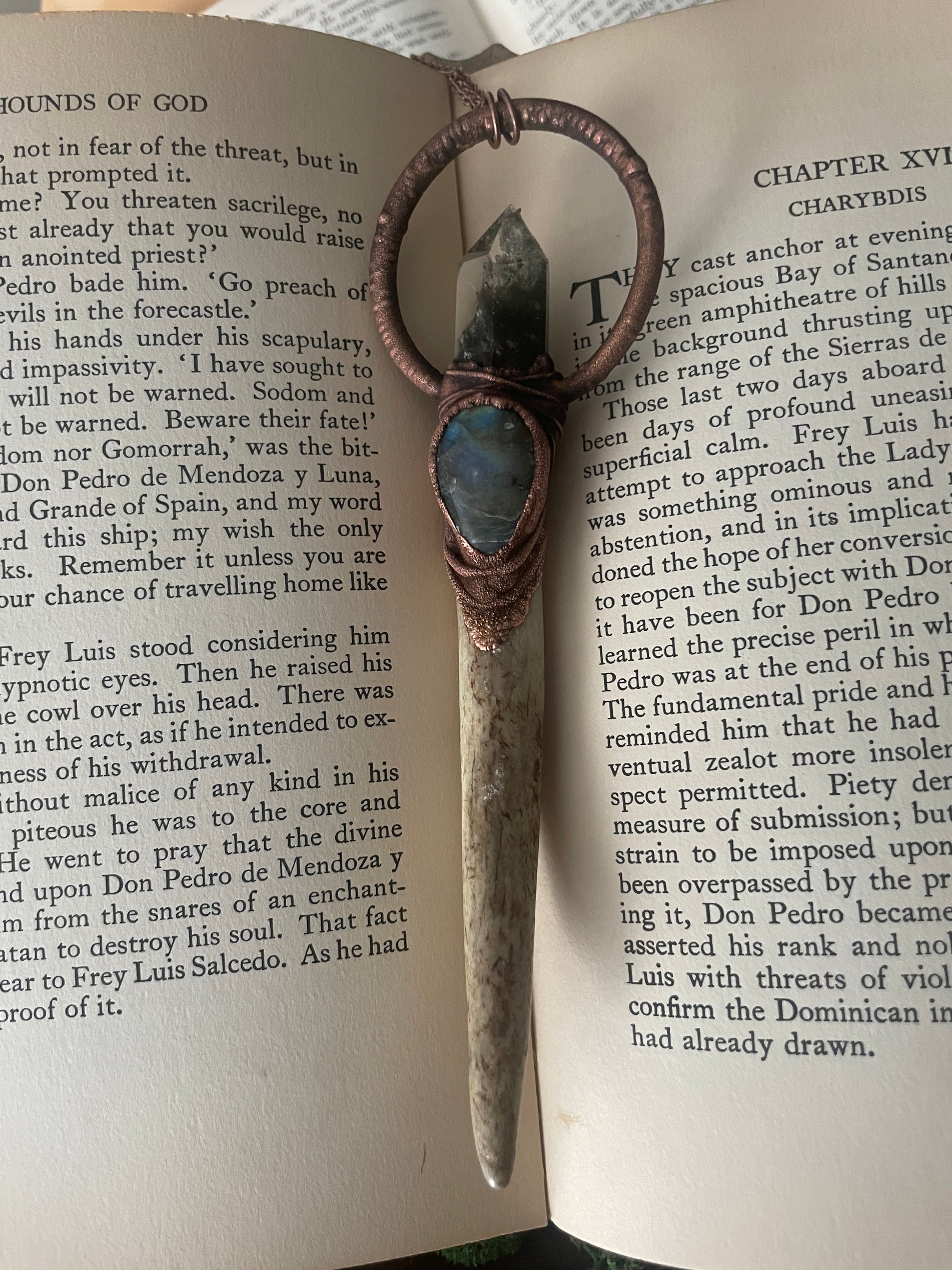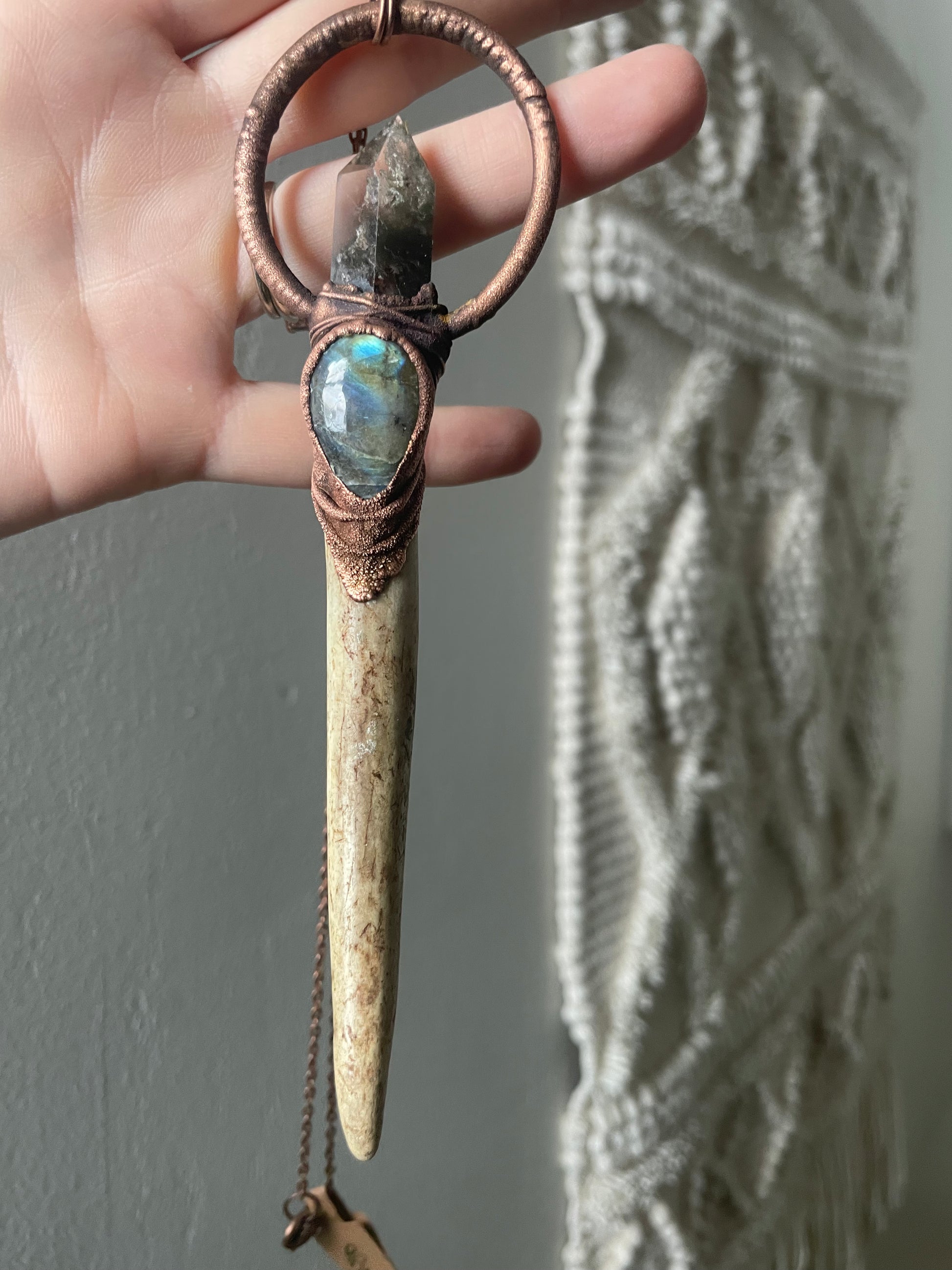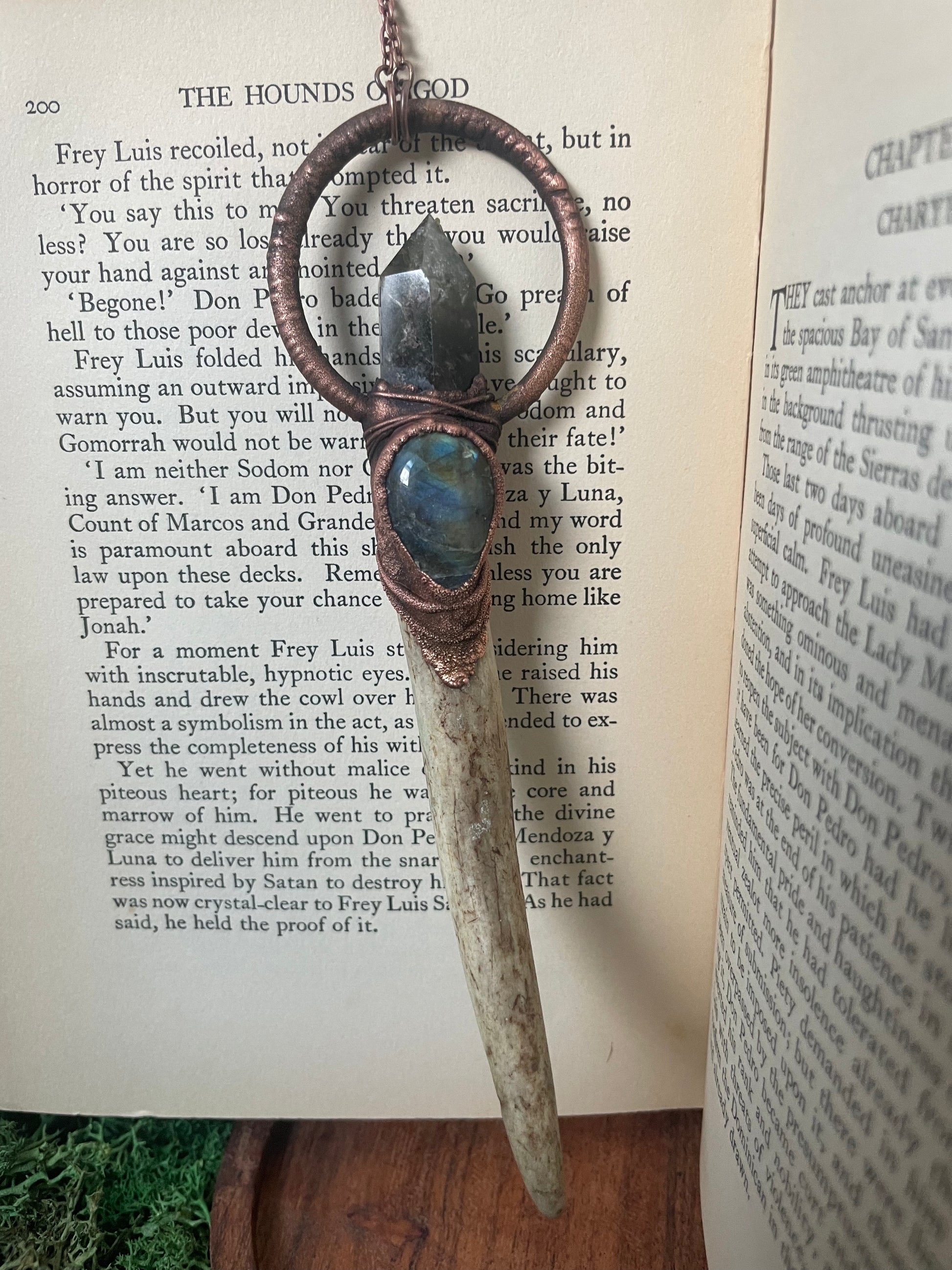 Hand Sculpted with a large Garden Quartz point on top and a Labradorite Cabochon rest on an Deer Antler horn. Electroformed with copper and strung on a copper chain, you choose your length. This versatile piece can be worn as a necklace or hung on a wall.