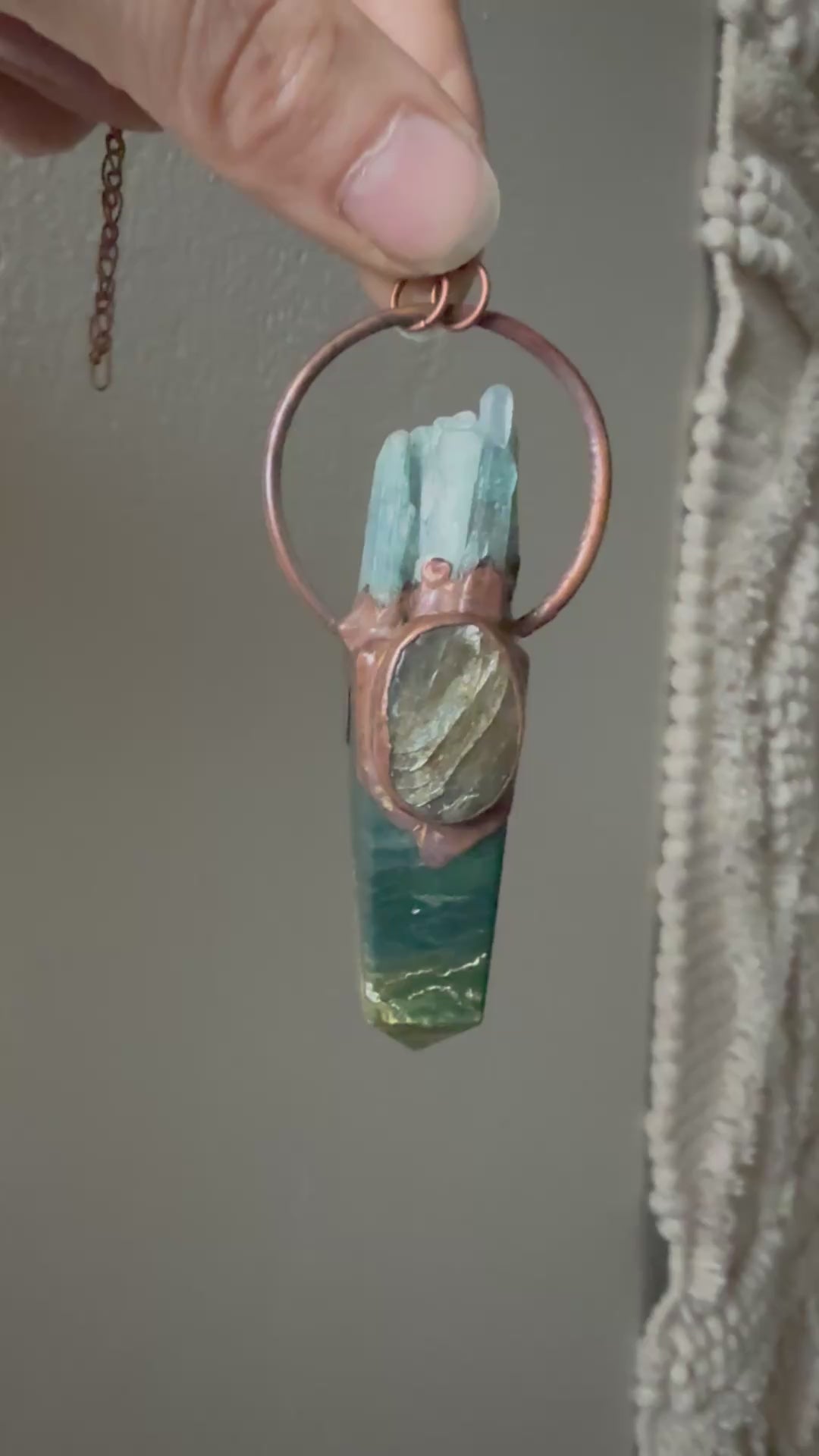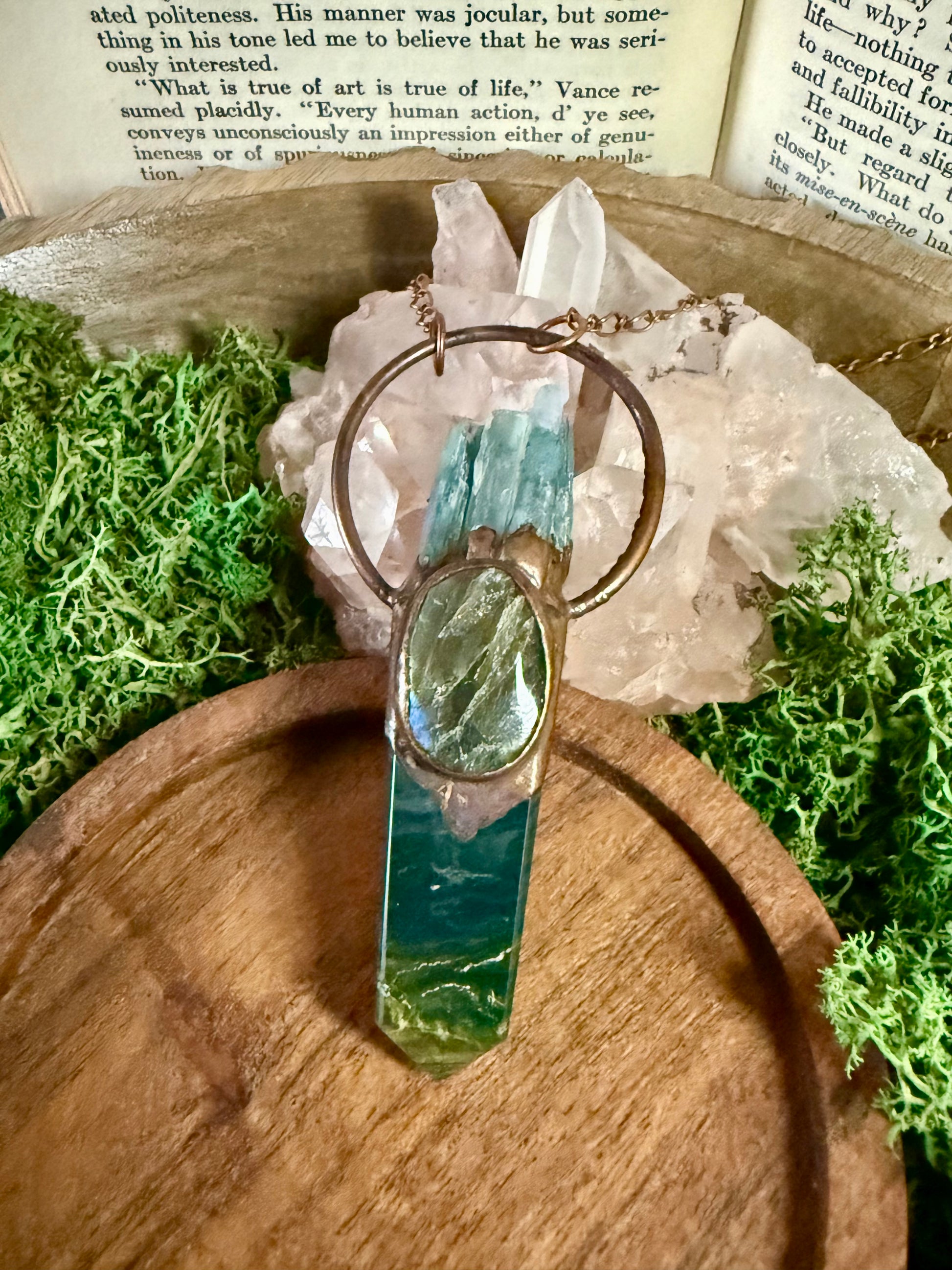 Jasper Stone Point with Green Kyanite cluster and Labradorite Stone Cabochon. Electroformed with copper and strung on a copper chain, you choose your length.