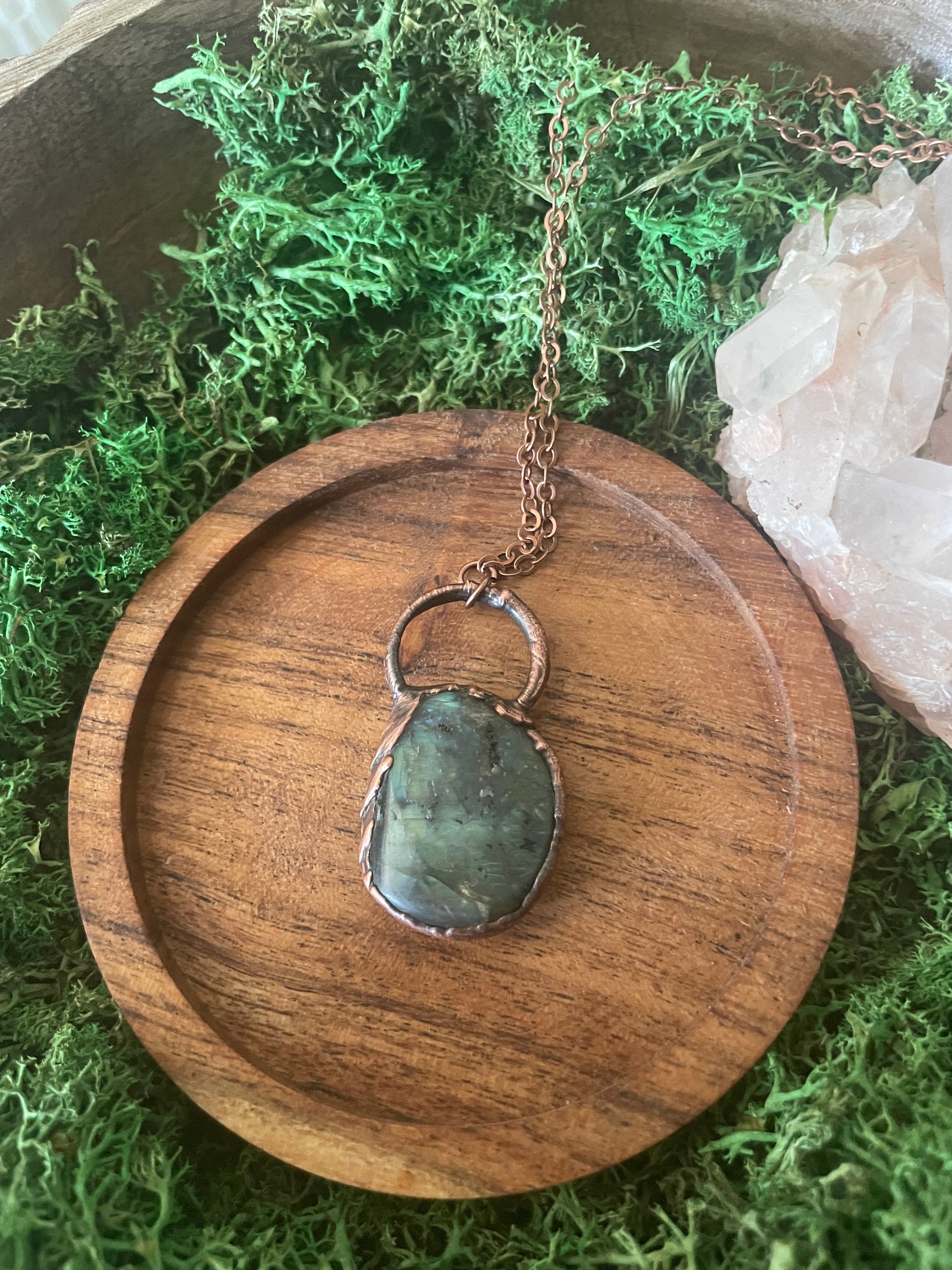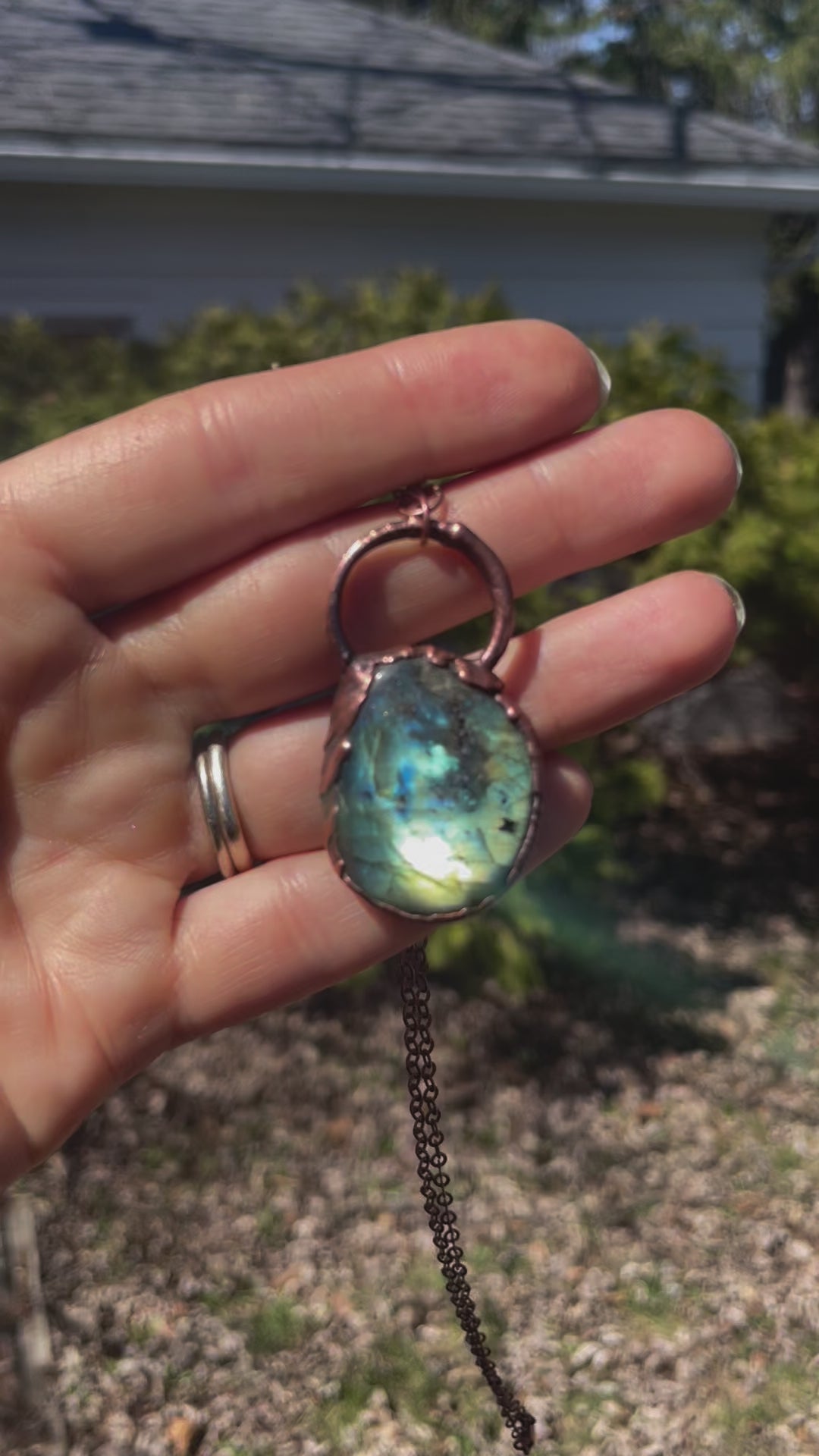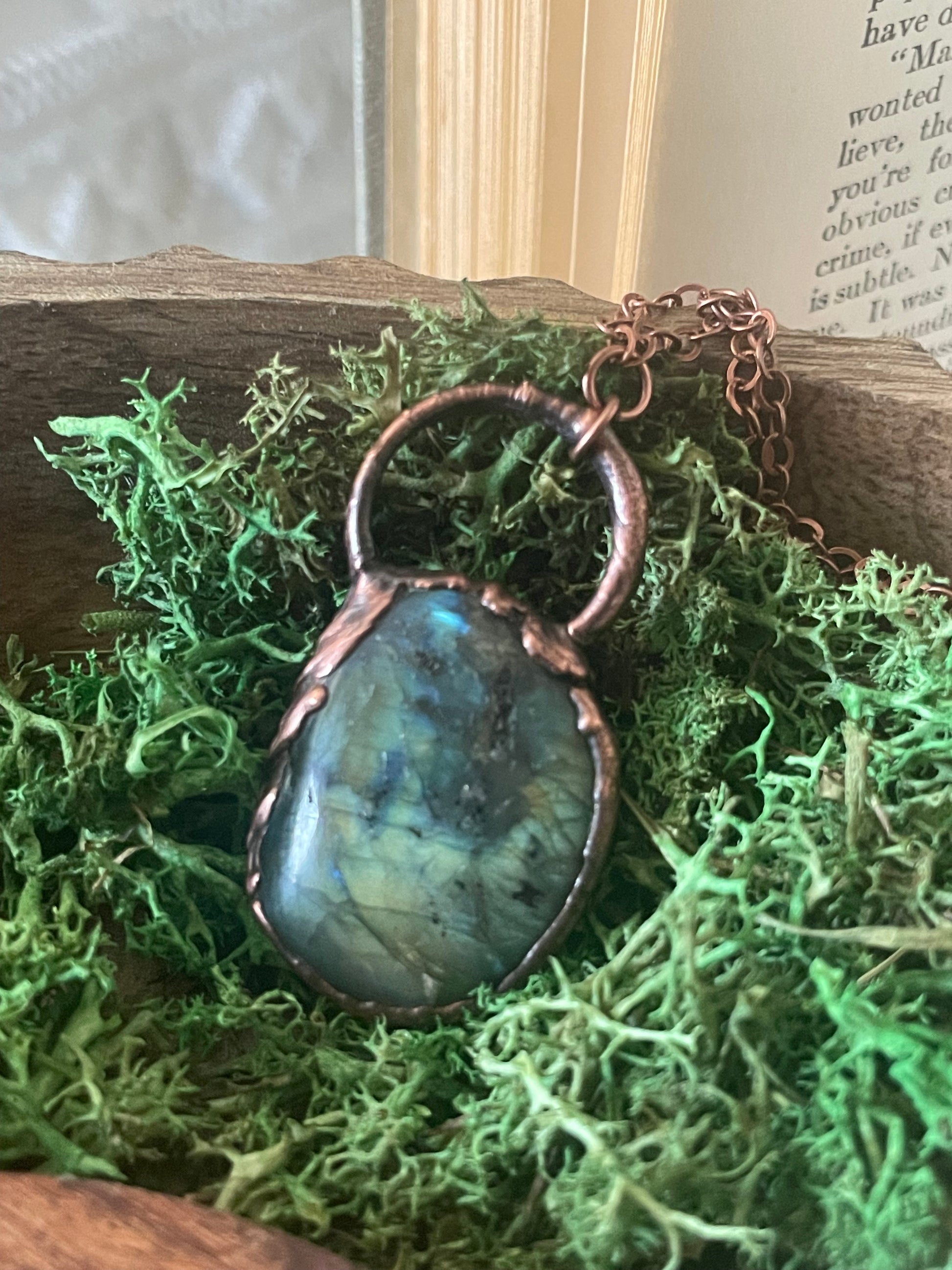A beautiful Labradorite stone, Electroformed with copper and strung on a copper chain, you choose your length.