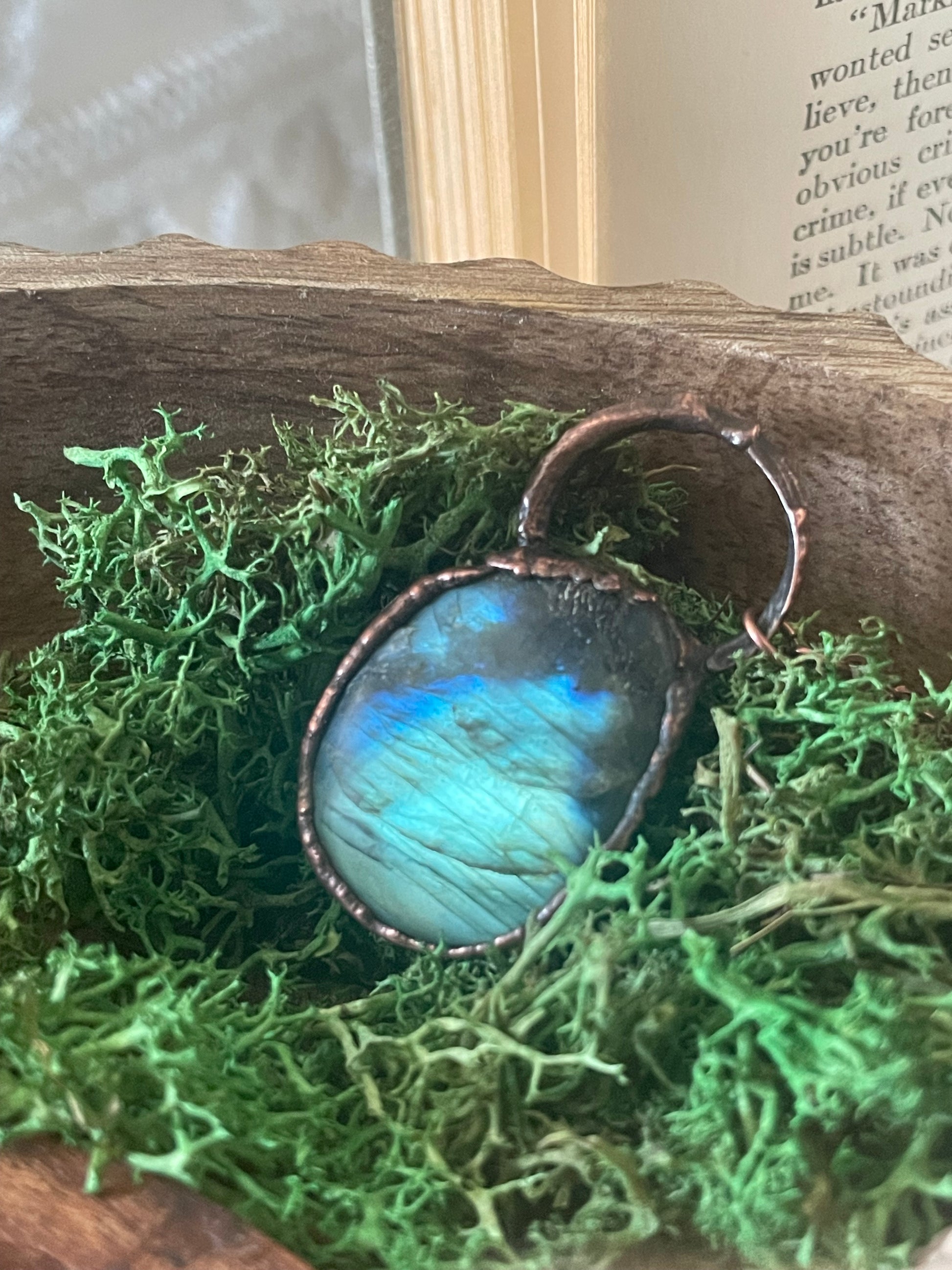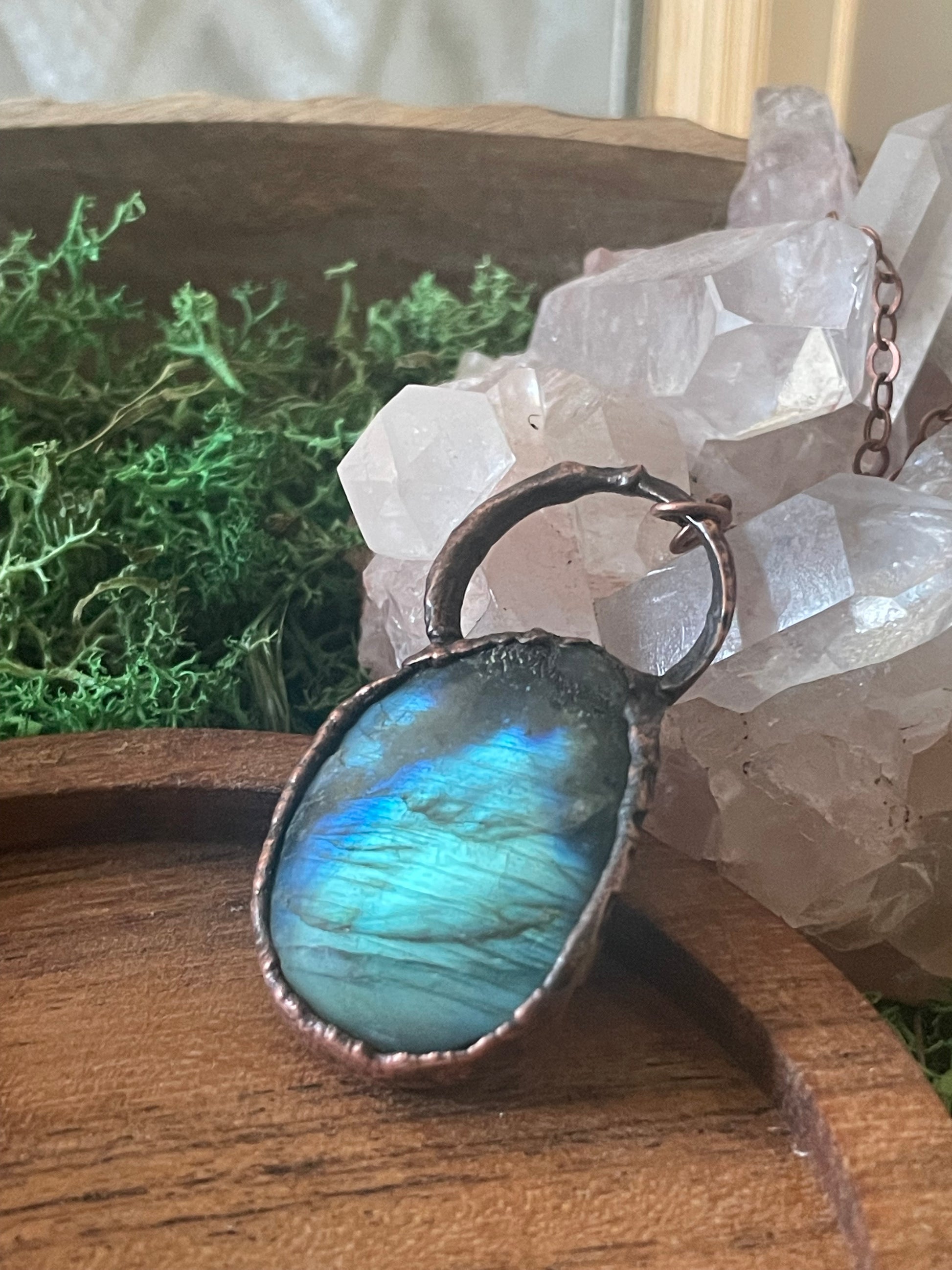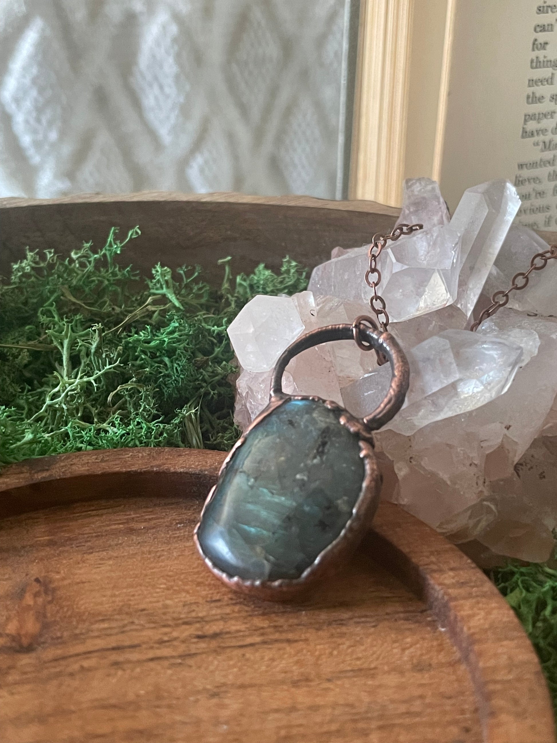 A beautiful Labradorite stone, Electroformed with copper and strung on a copper chain, you choose your length.