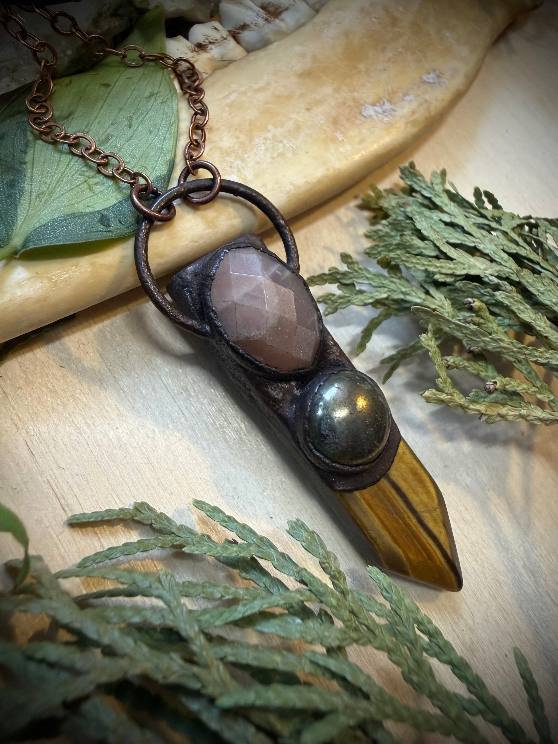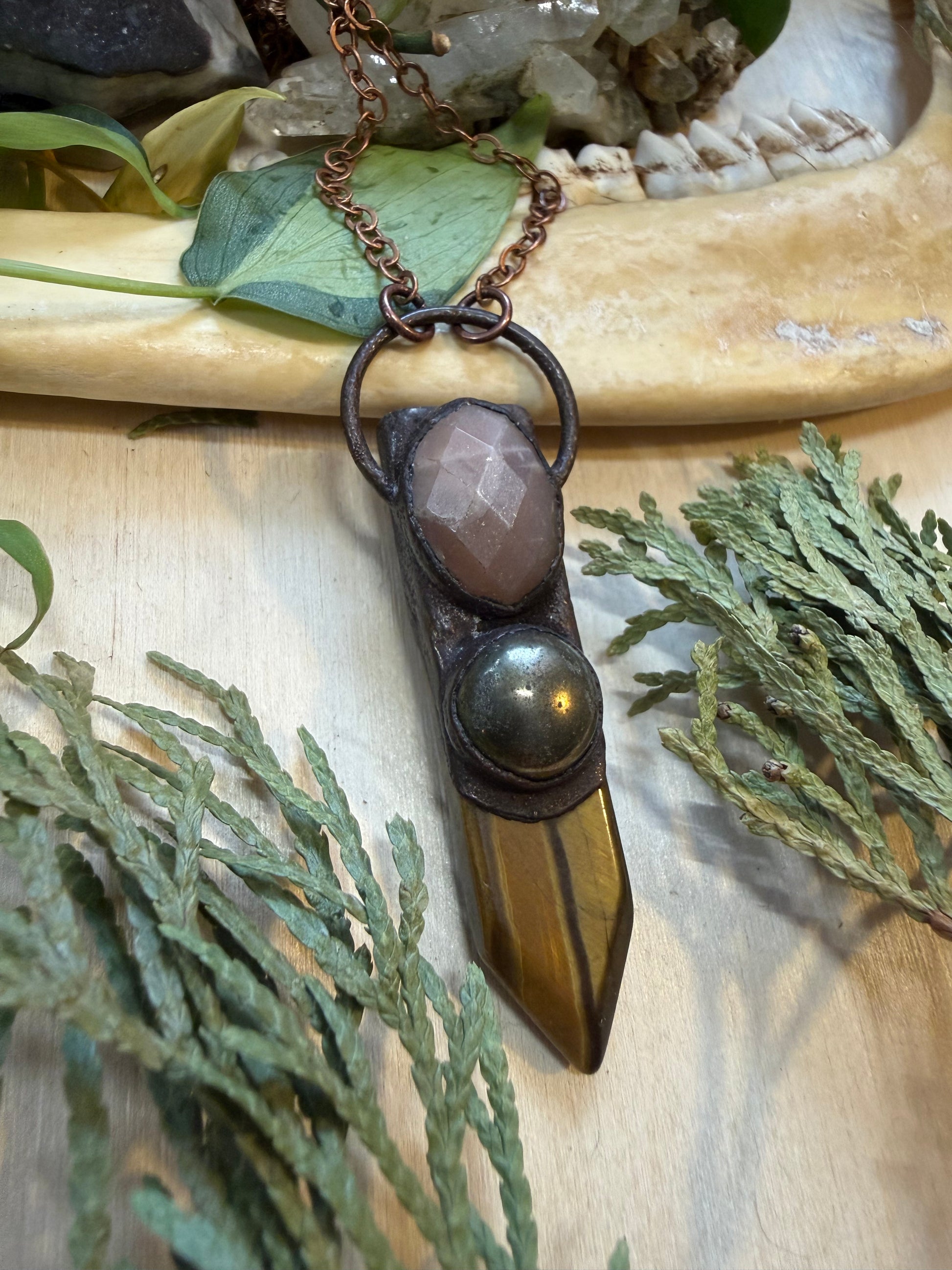 A beautiful Tiger Eye sword shaped stone layered with Sun Stone and Pyrite then electroformed with copper and strung on a copper chain, you choose your length.