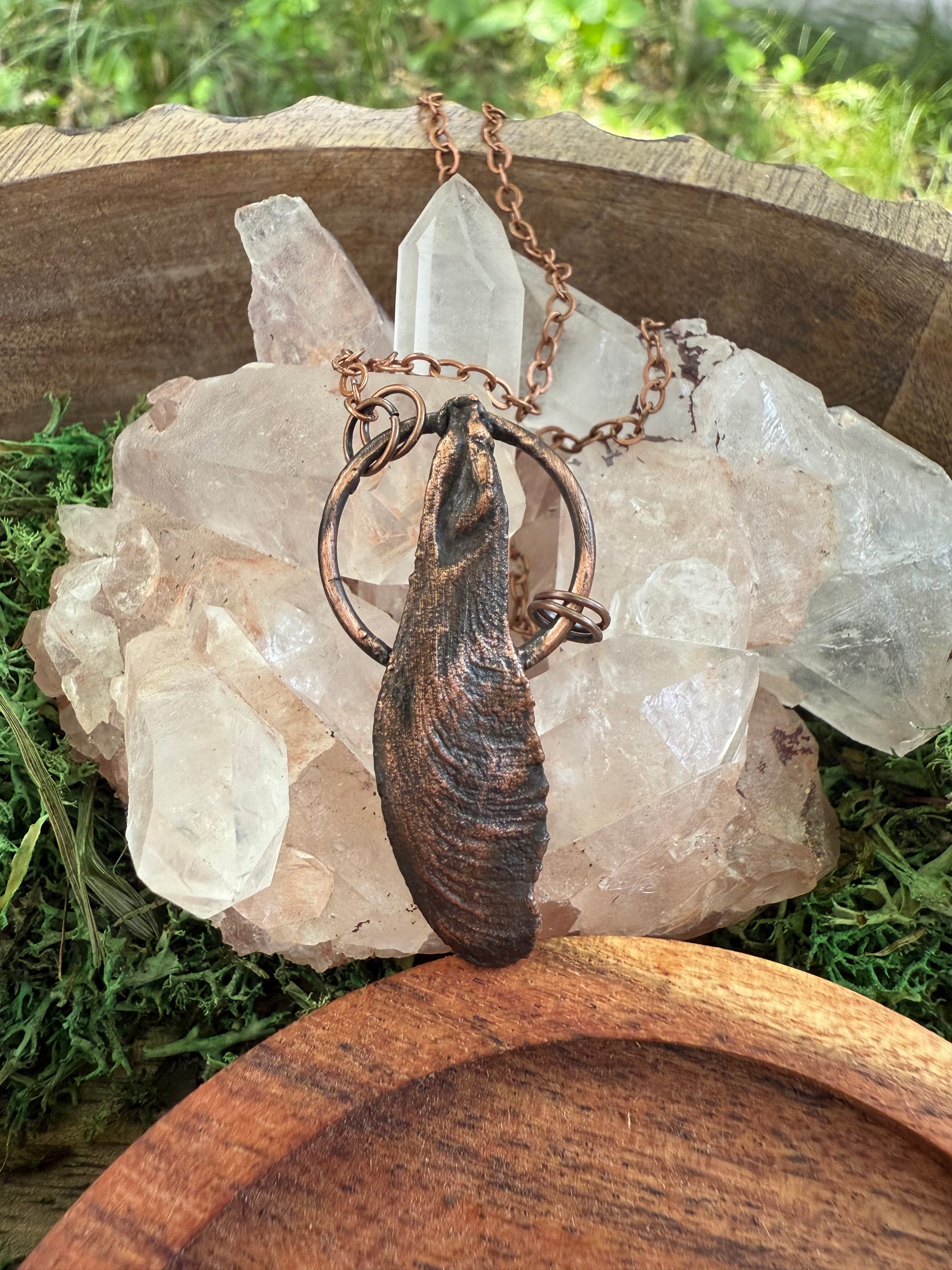 Each piece is lovingly made in my home and takes days to complete. I prep each piece with stones or crystals. Seal the portion I wish to leave exposed and paint with conductive paint for the portion I wish copper to grow. It is then submerged in an acid bath with copper anodes. Electricity is applied for the copper ions to travel from the anode to the cathode (my piece). After a time period of 6-36 hours, I pull the piece from the bath and sand, grind, polish with my dremel. Then patina and seal.