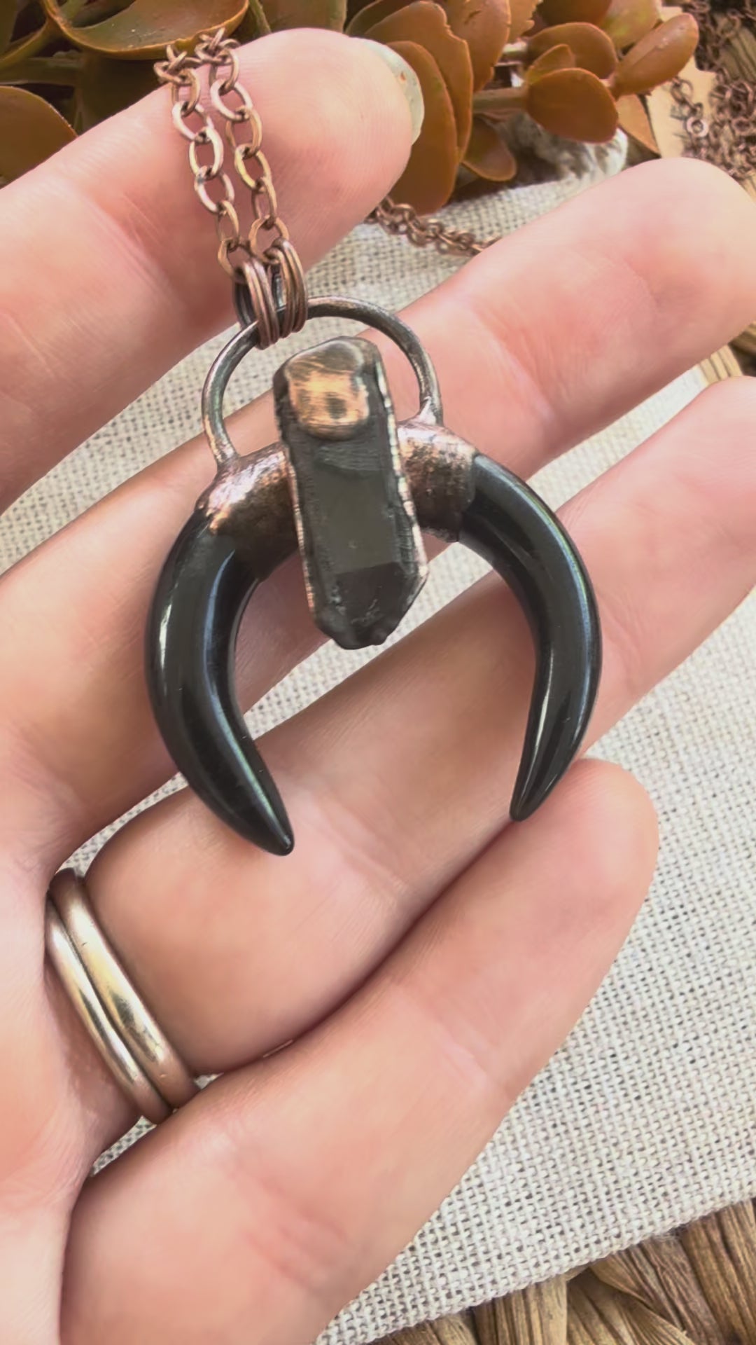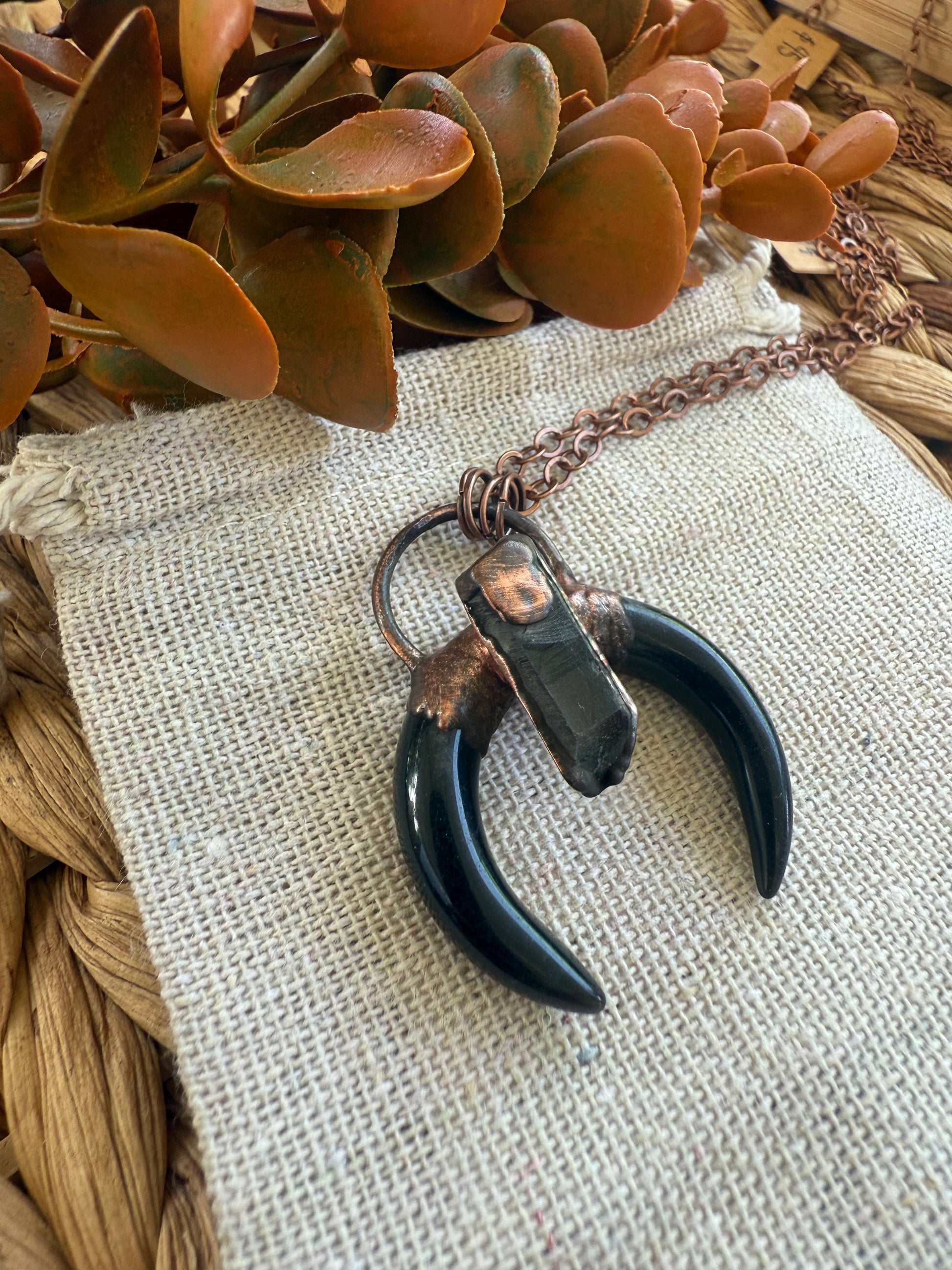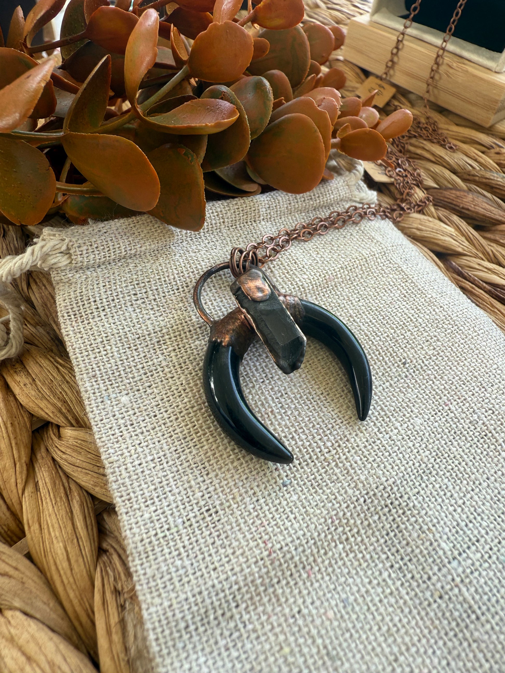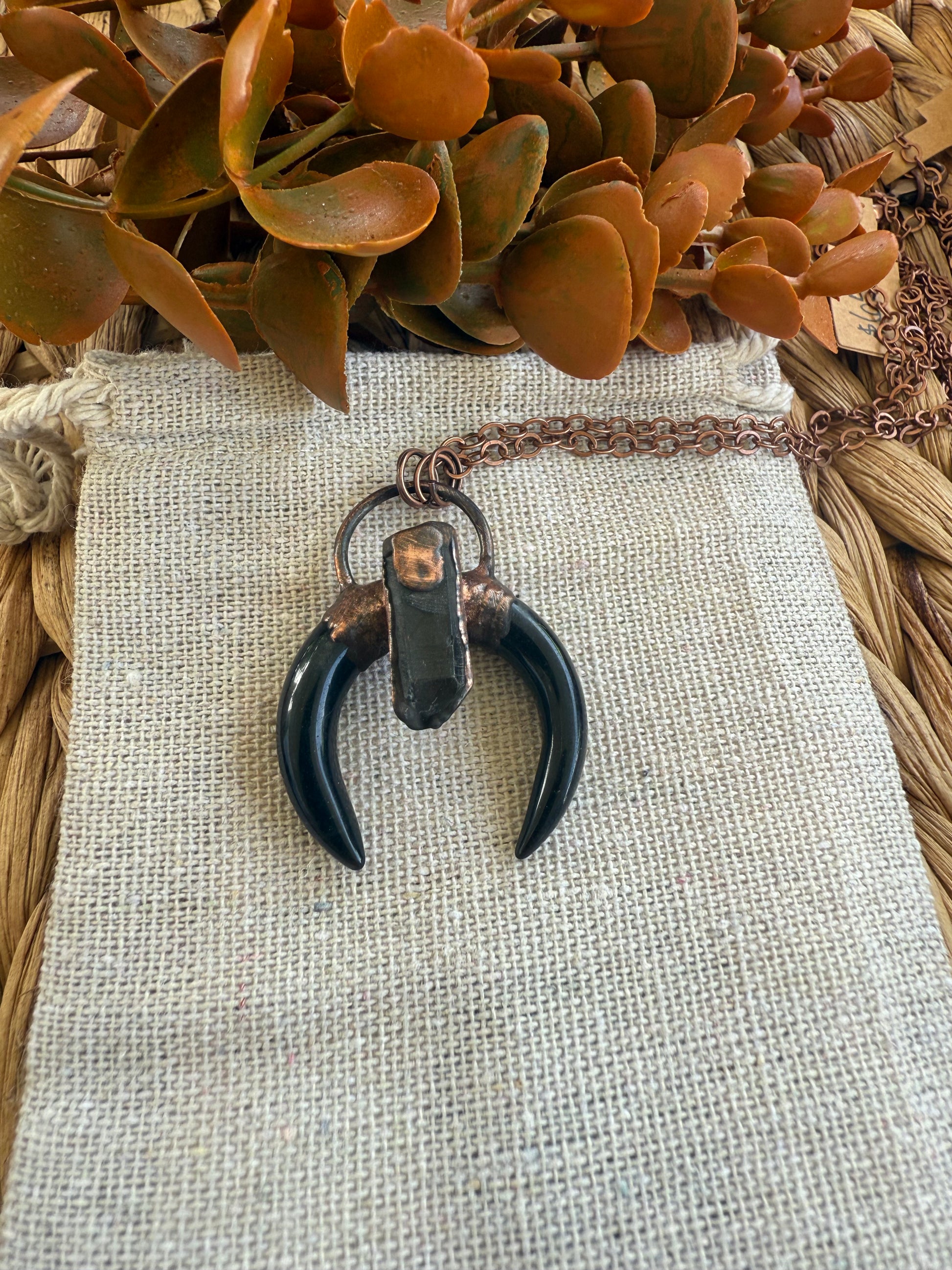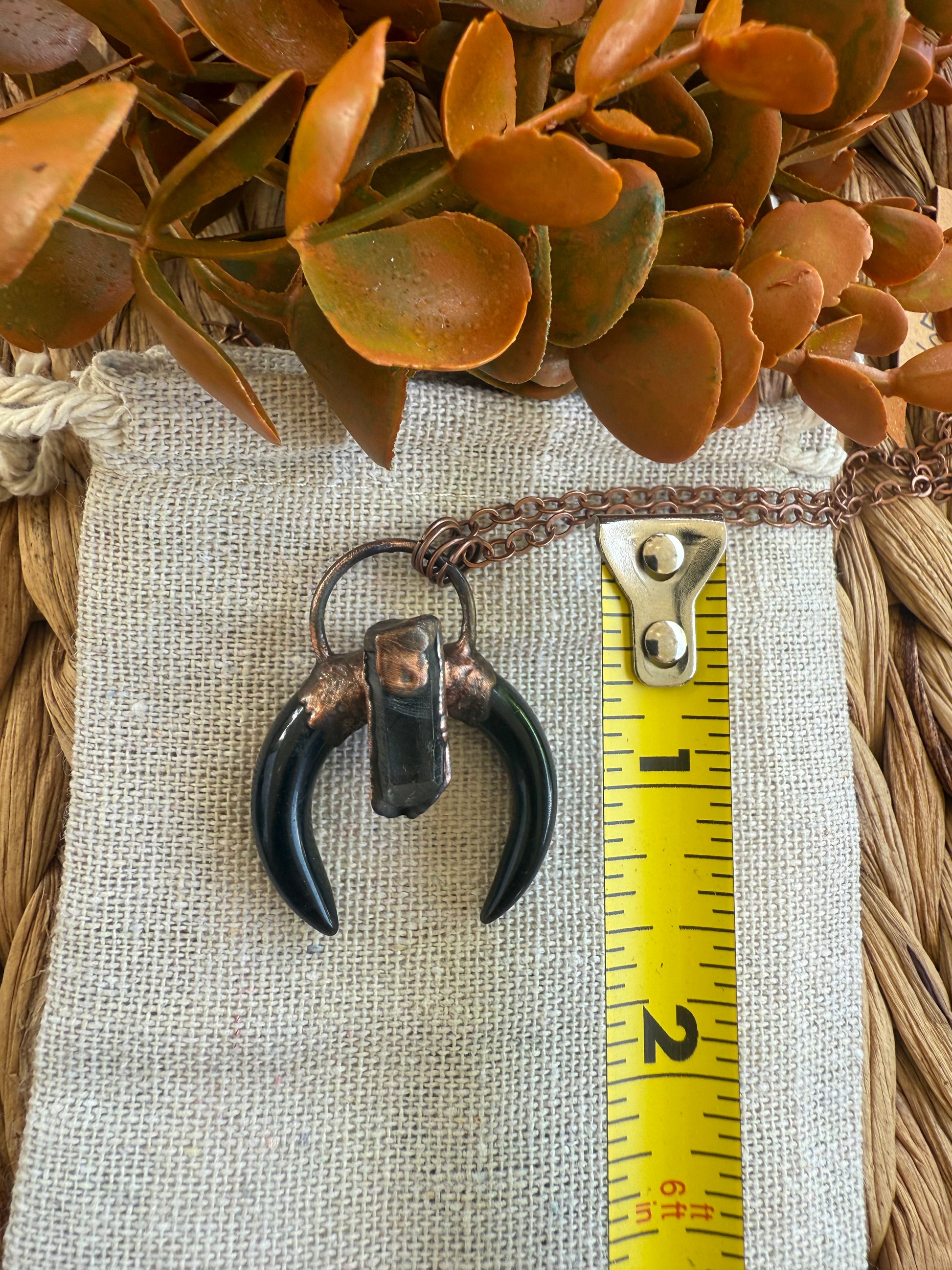 Electroformed Copper obsidian Horn with Quartz Necklace