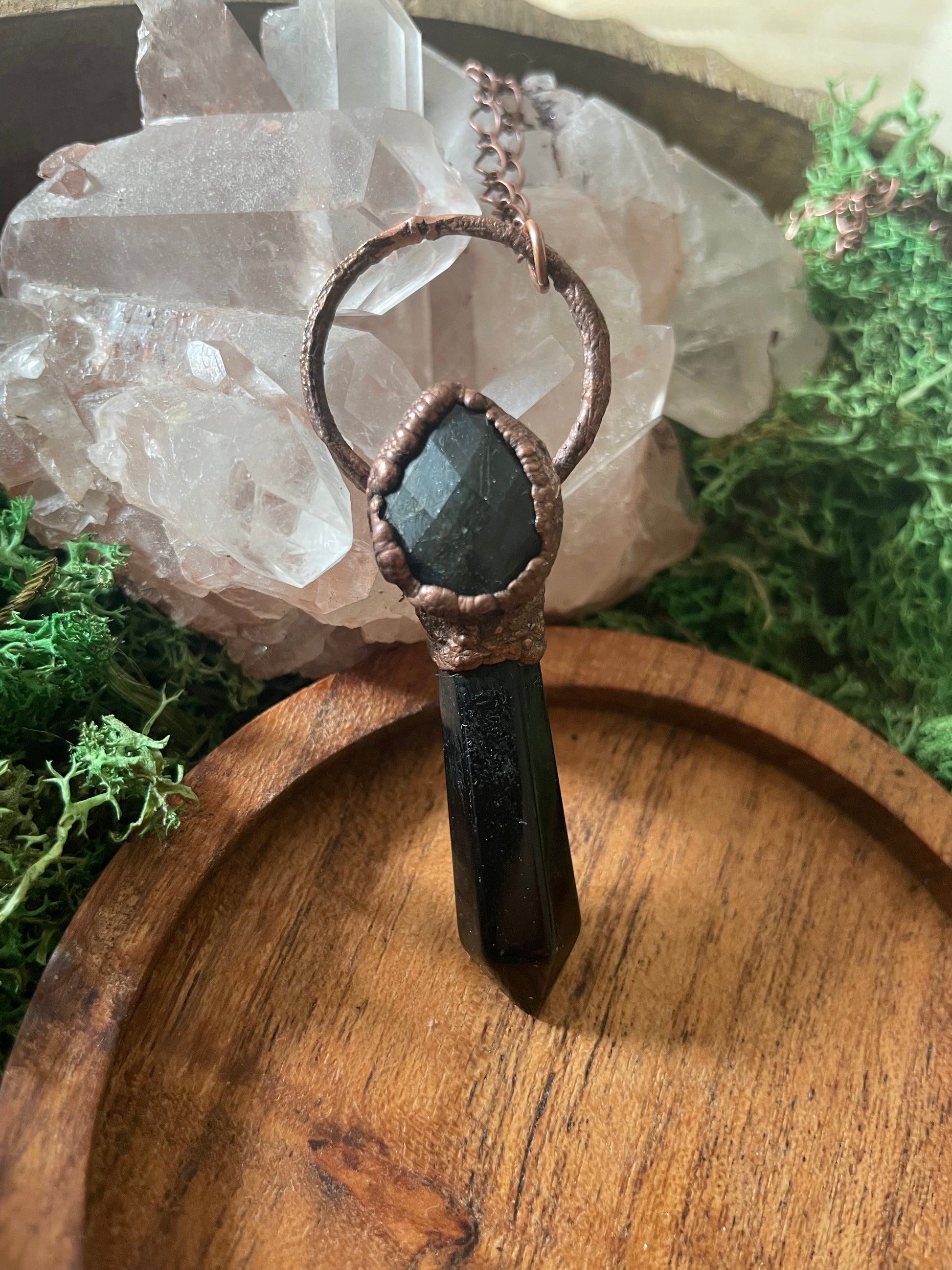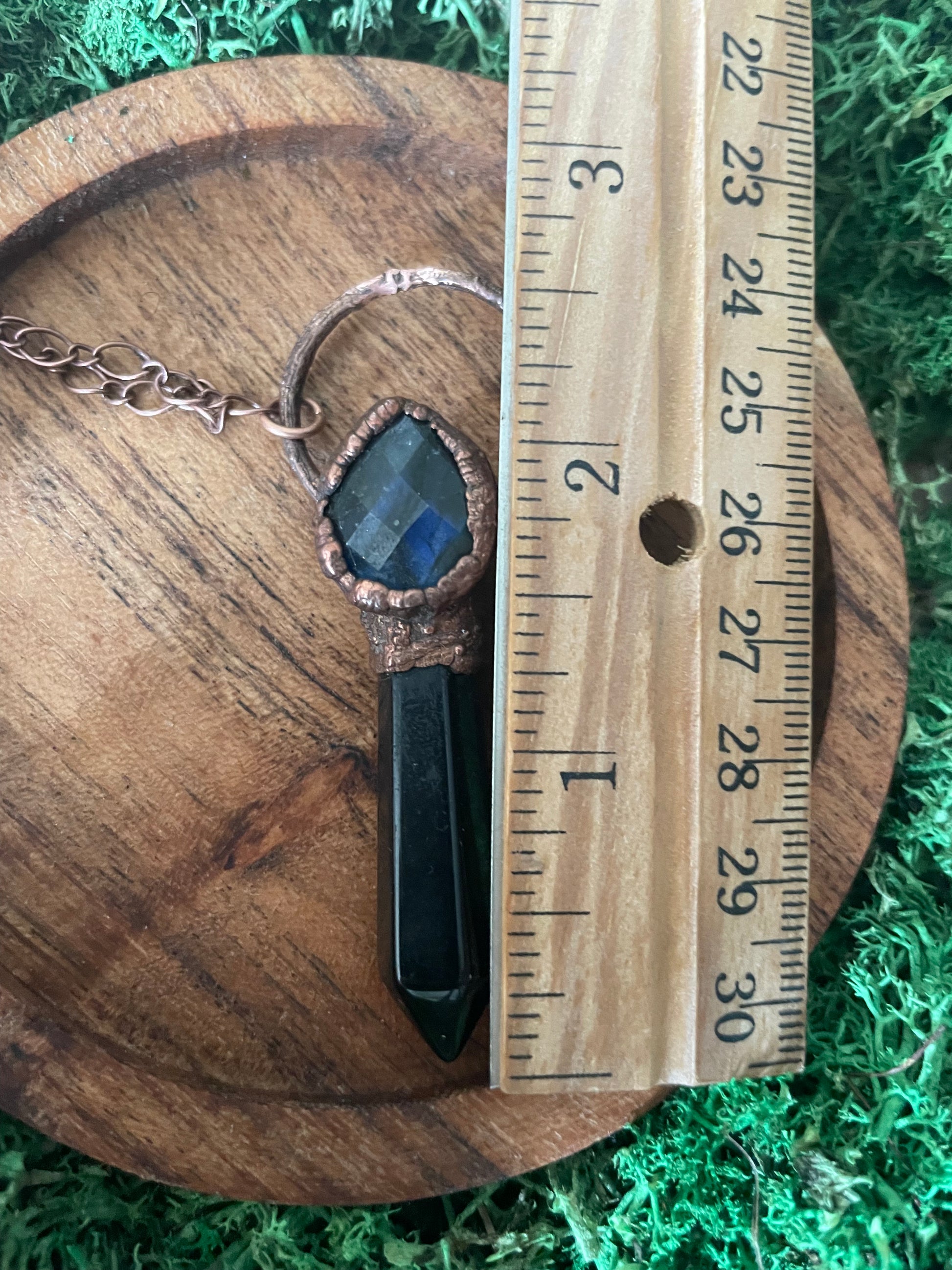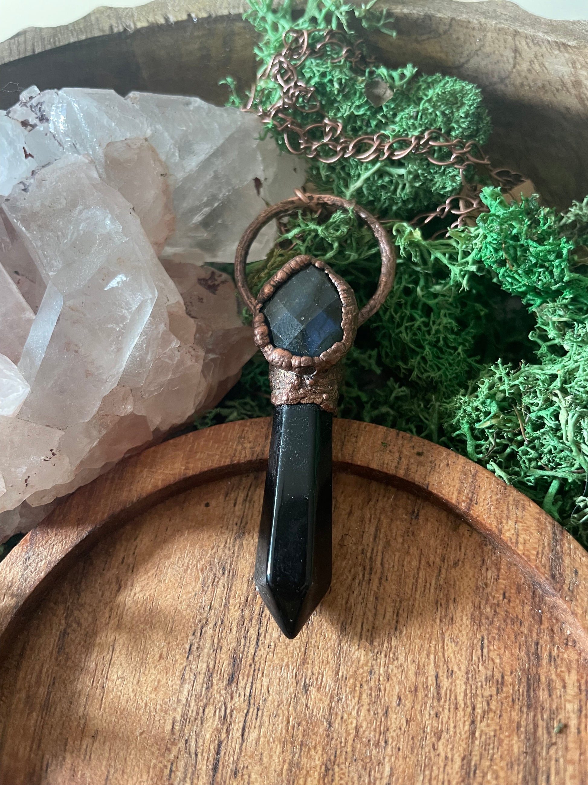 Obsidian Crystal Point with Labradorite Faceted Stone Cabachon. Electroformed with copper and strung on a copper chain, you choose your length.