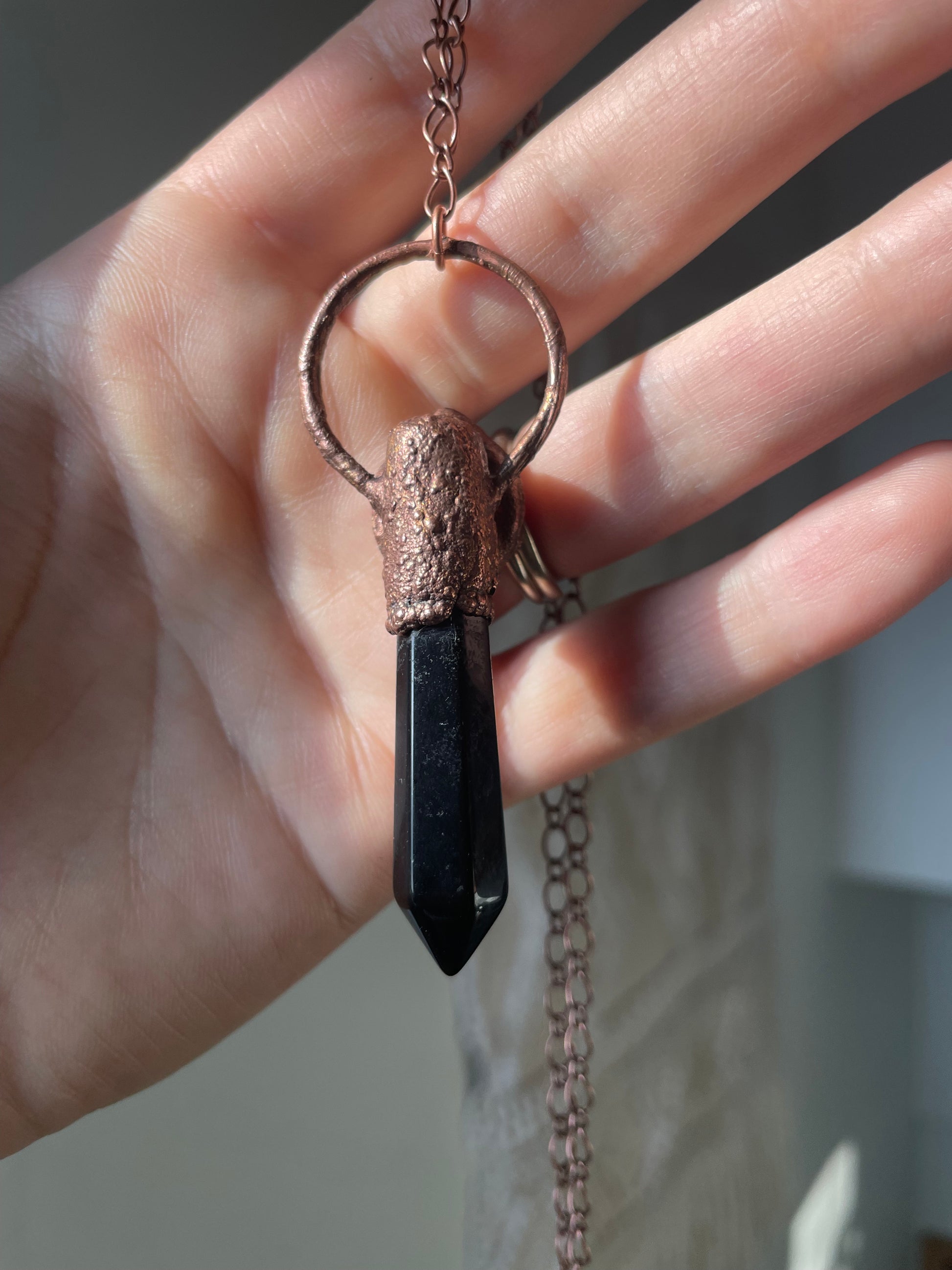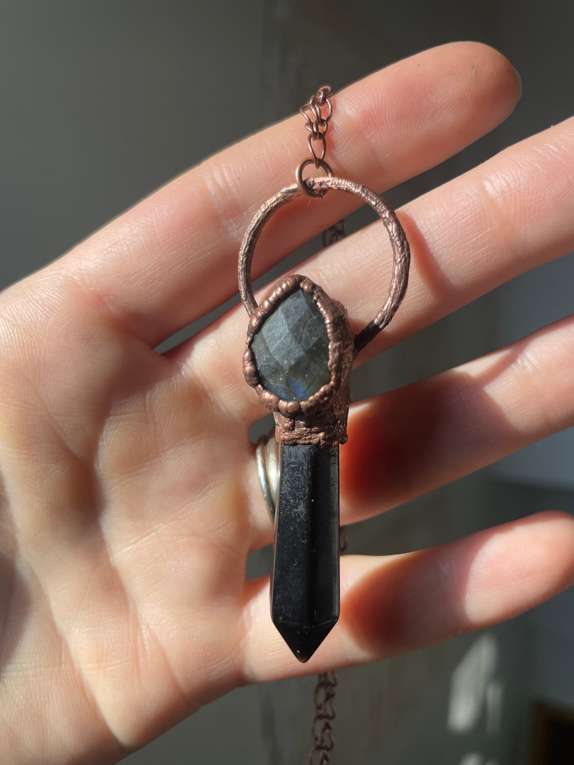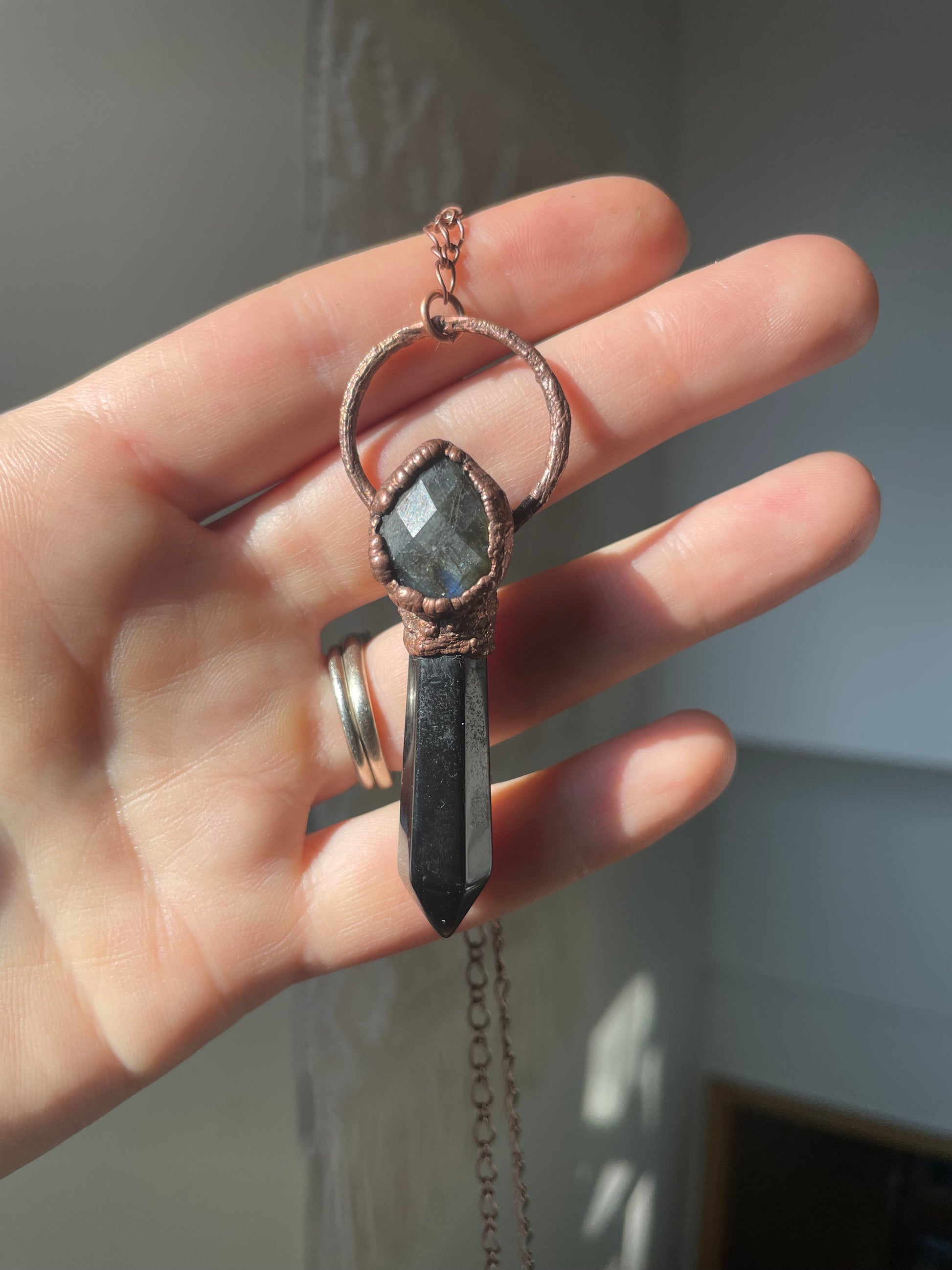 Obsidian Crystal Point with Labradorite Faceted Stone Cabachon. Electroformed with copper and strung on a copper chain, you choose your length.