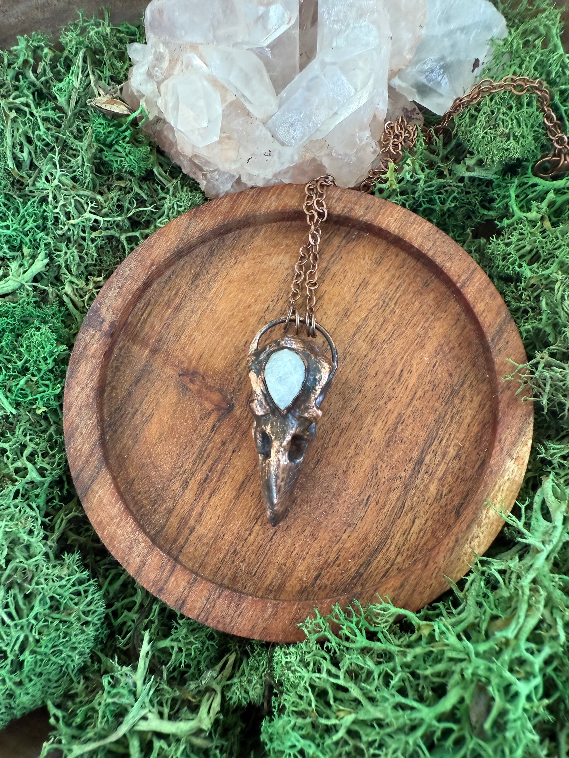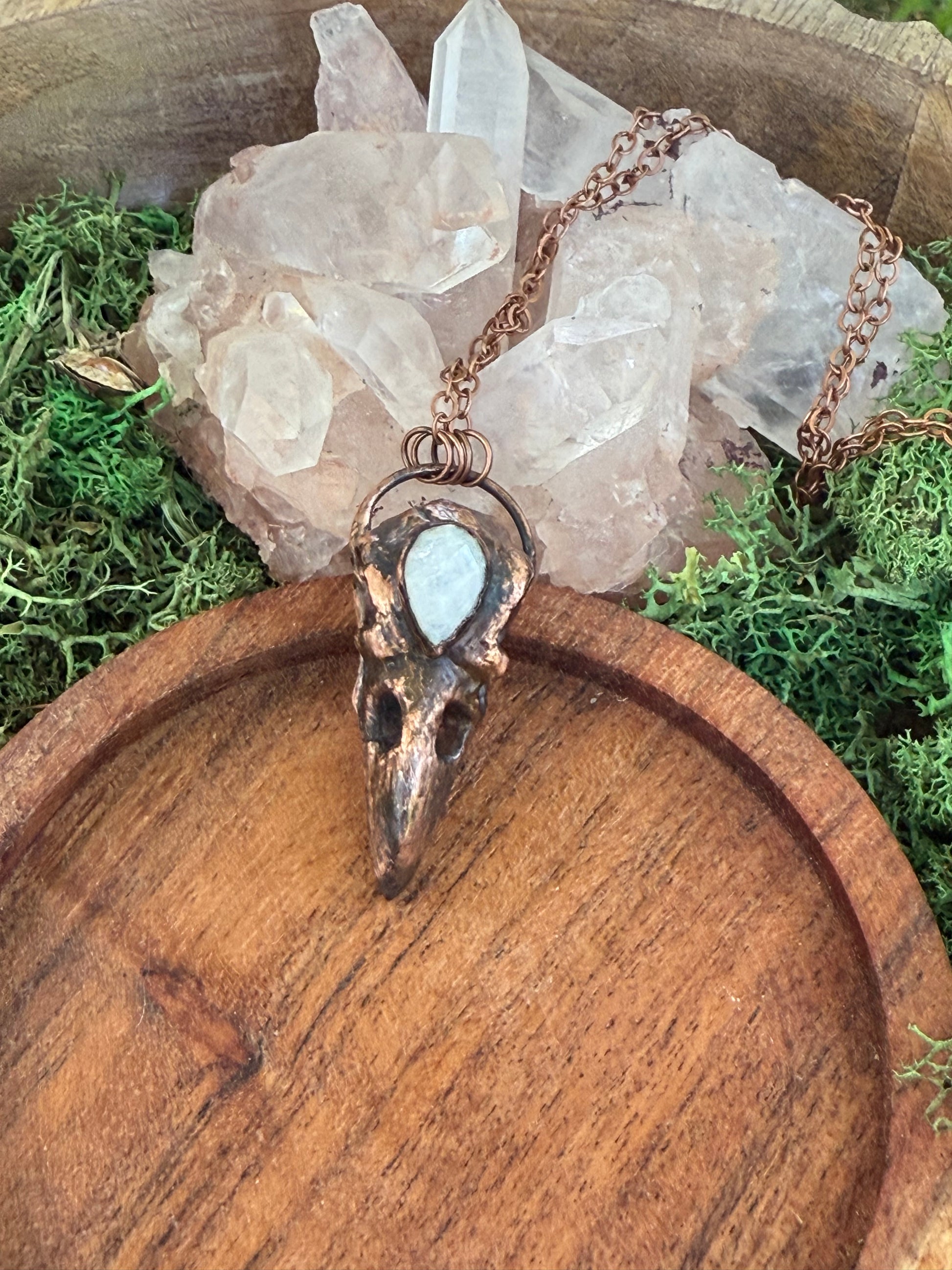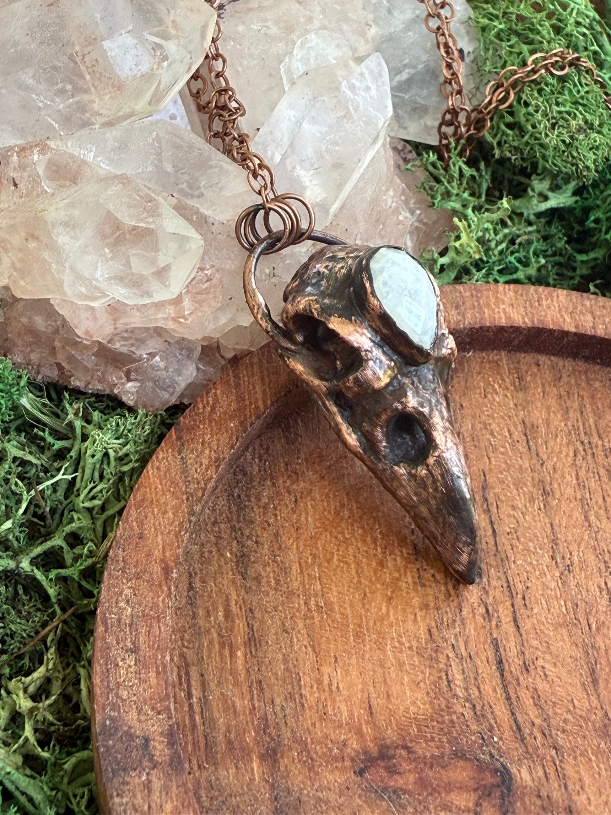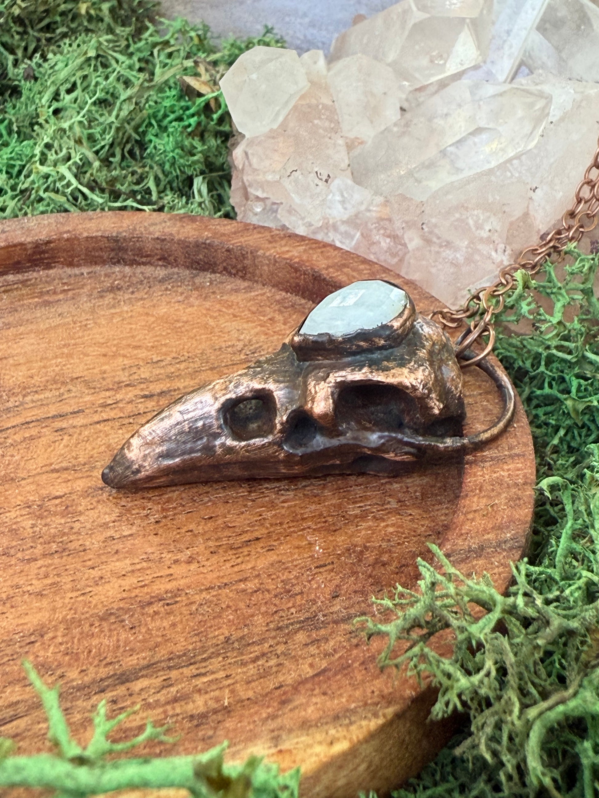 Electroformed Copper Raven Skull with Moonstone Necklace