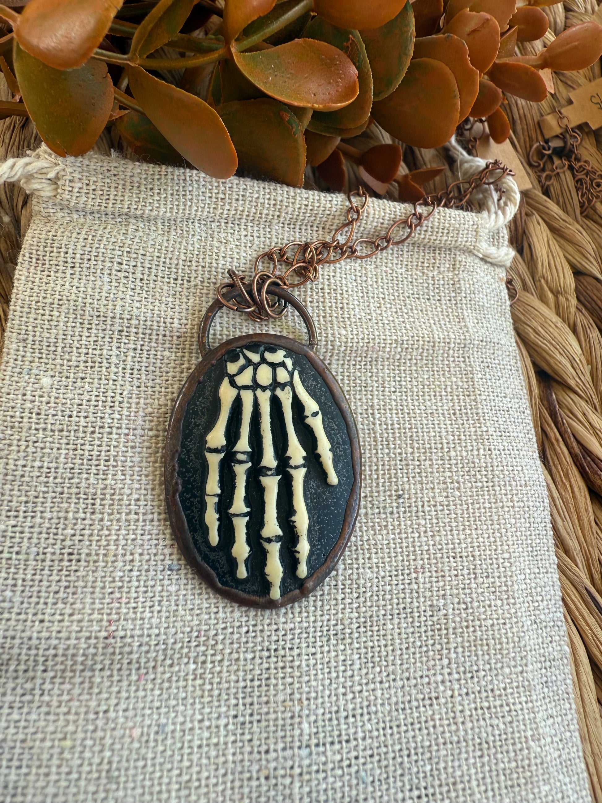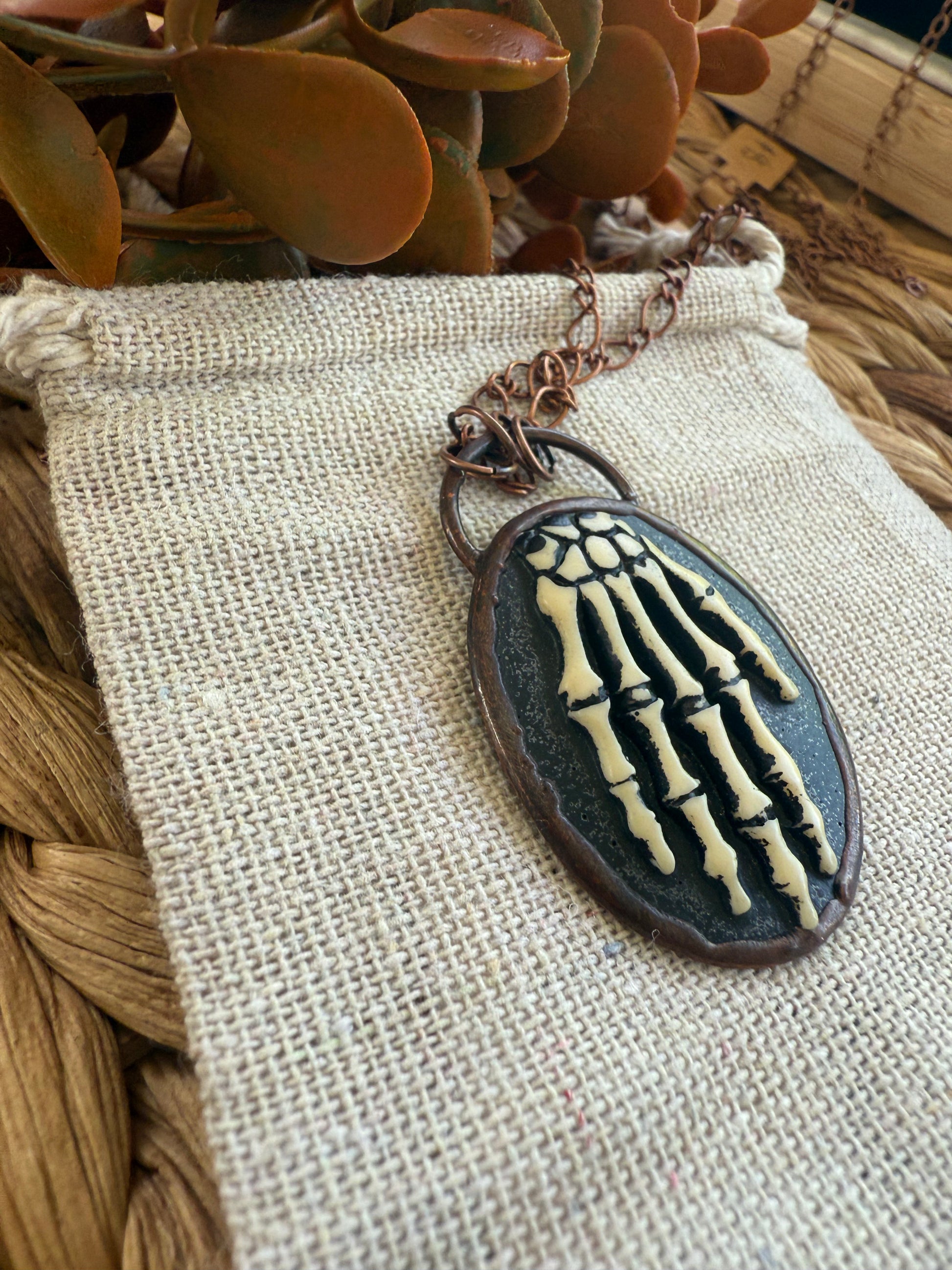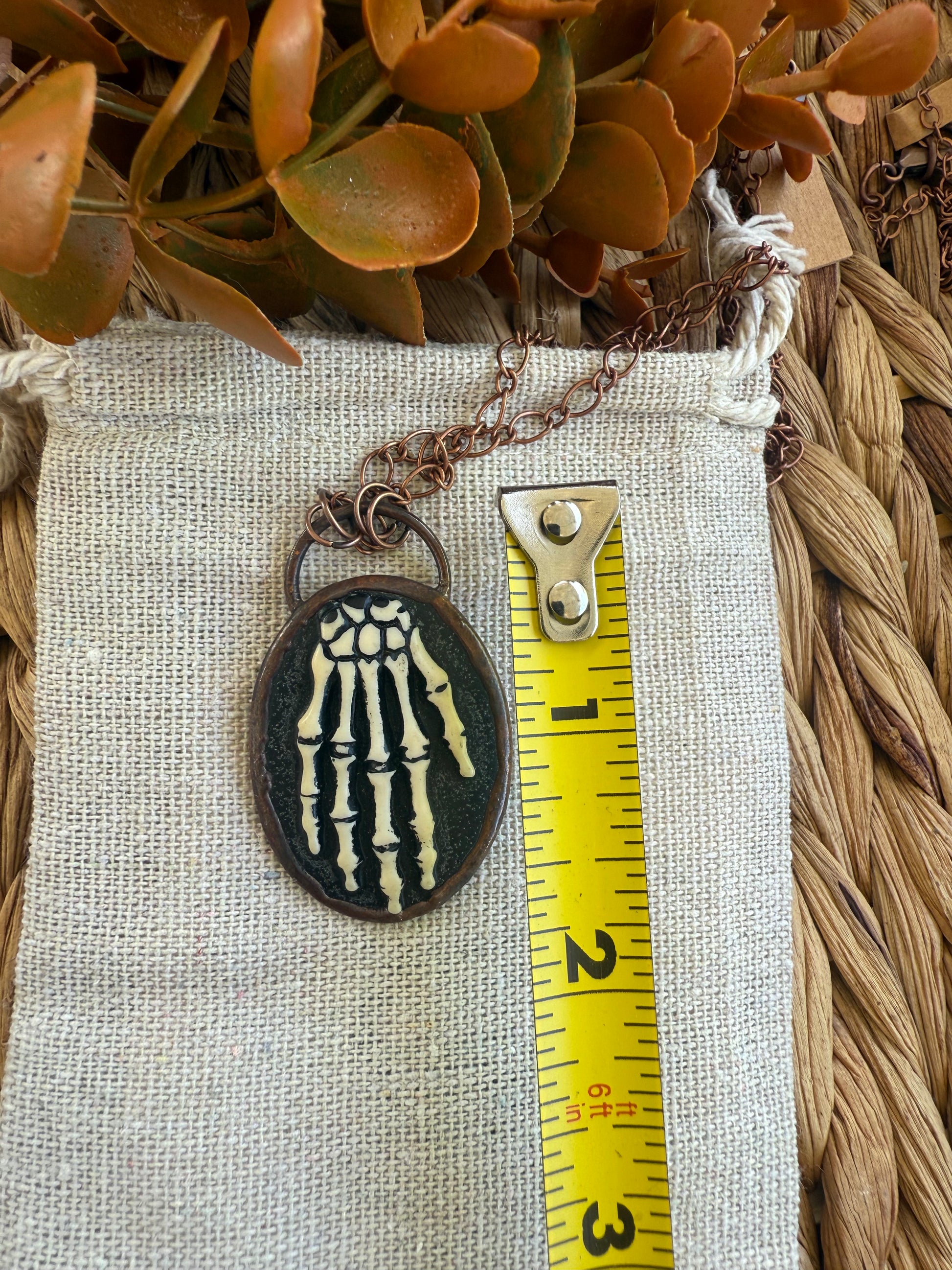 A resin molded skeleton hand cabochon. Electroformed with copper and strung on a copper chain, you choose your length.