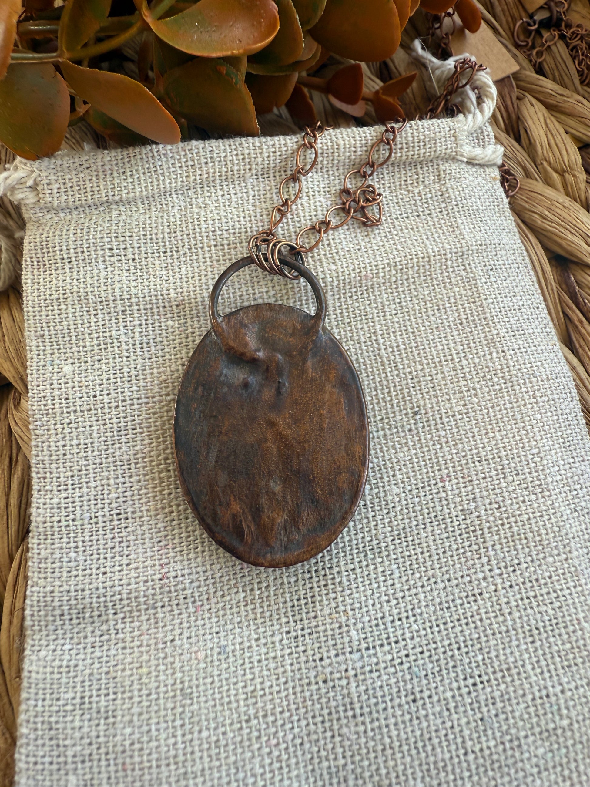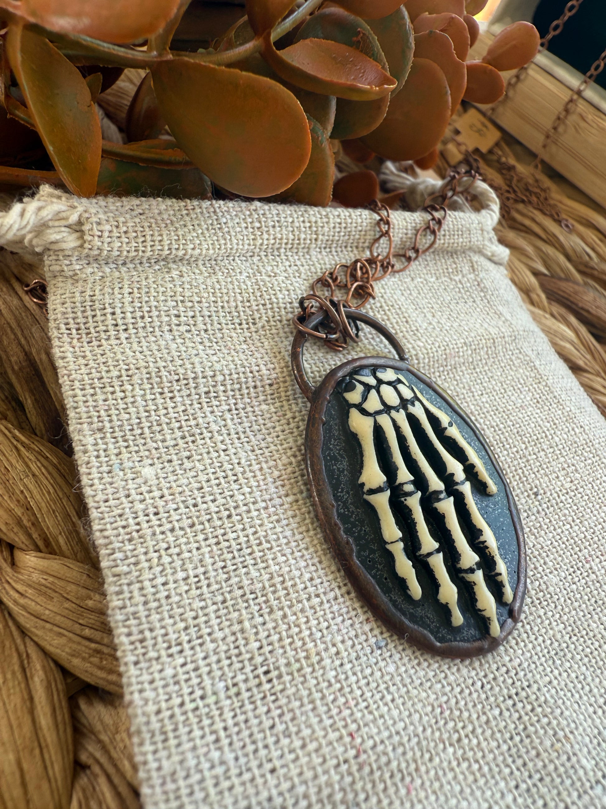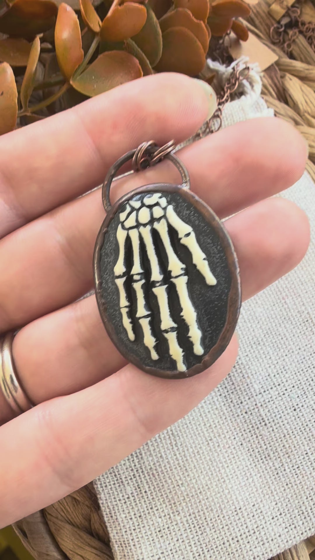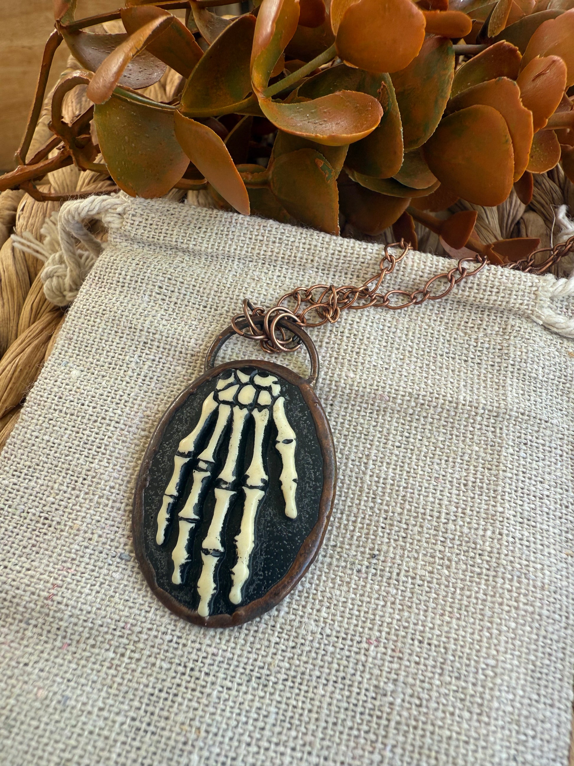 A resin molded skeleton hand cabochon. Electroformed with copper and strung on a copper chain, you choose your length.
