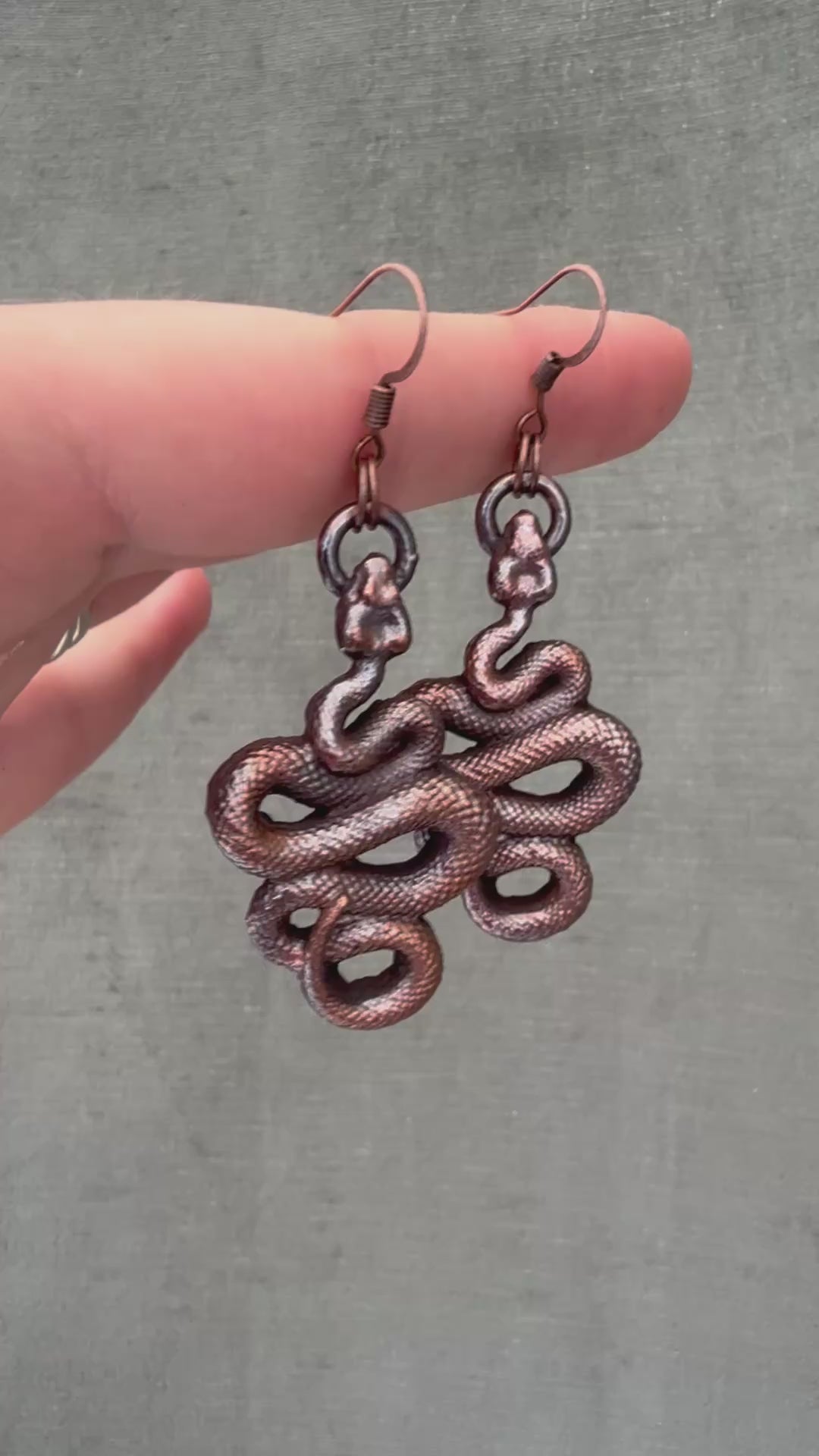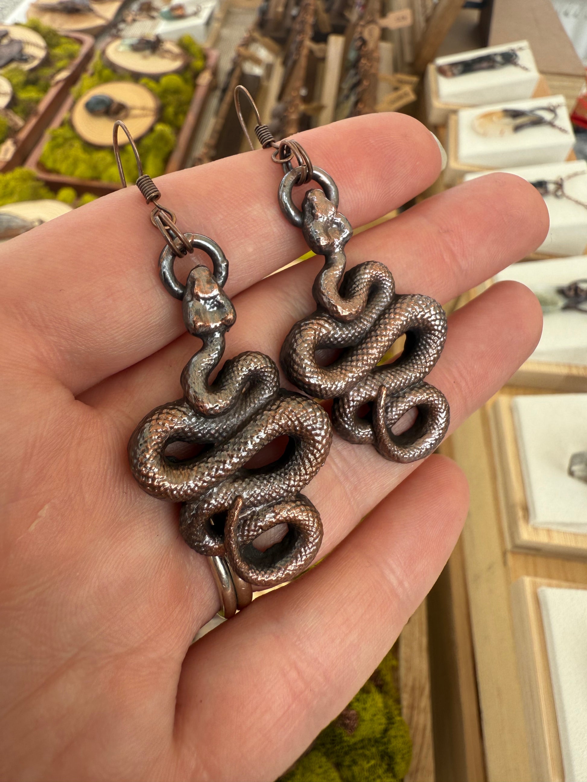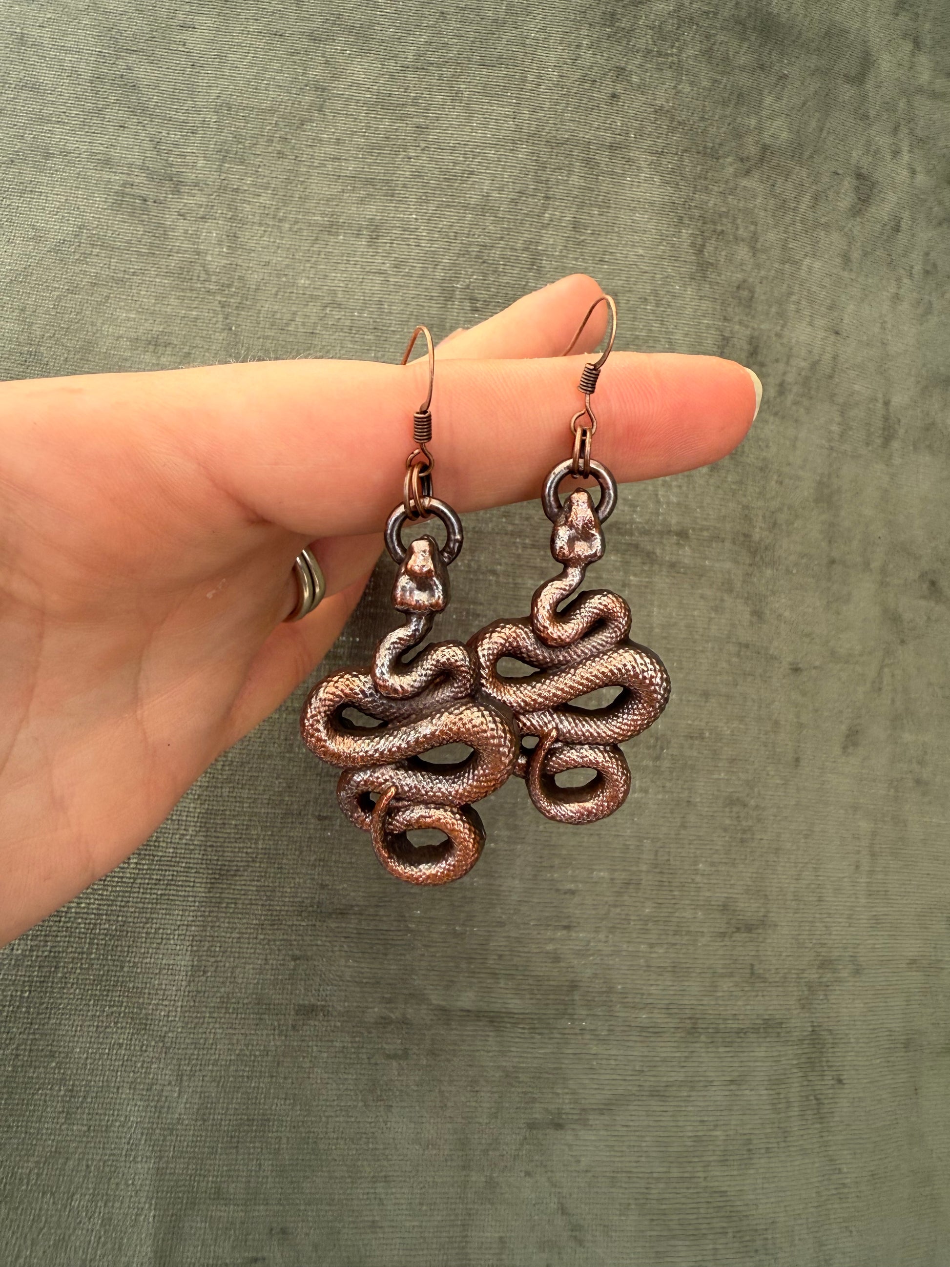 Copper serpent Earrings. Resin casted snake electroplated with copper and hung on copper ear hooks.