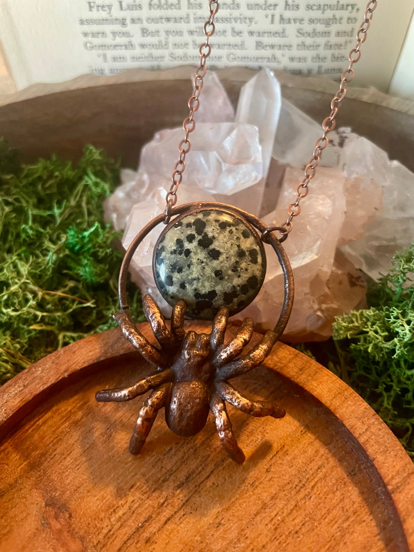 Electroformed Copper Spider and Dalmation Jasper Stone Necklace