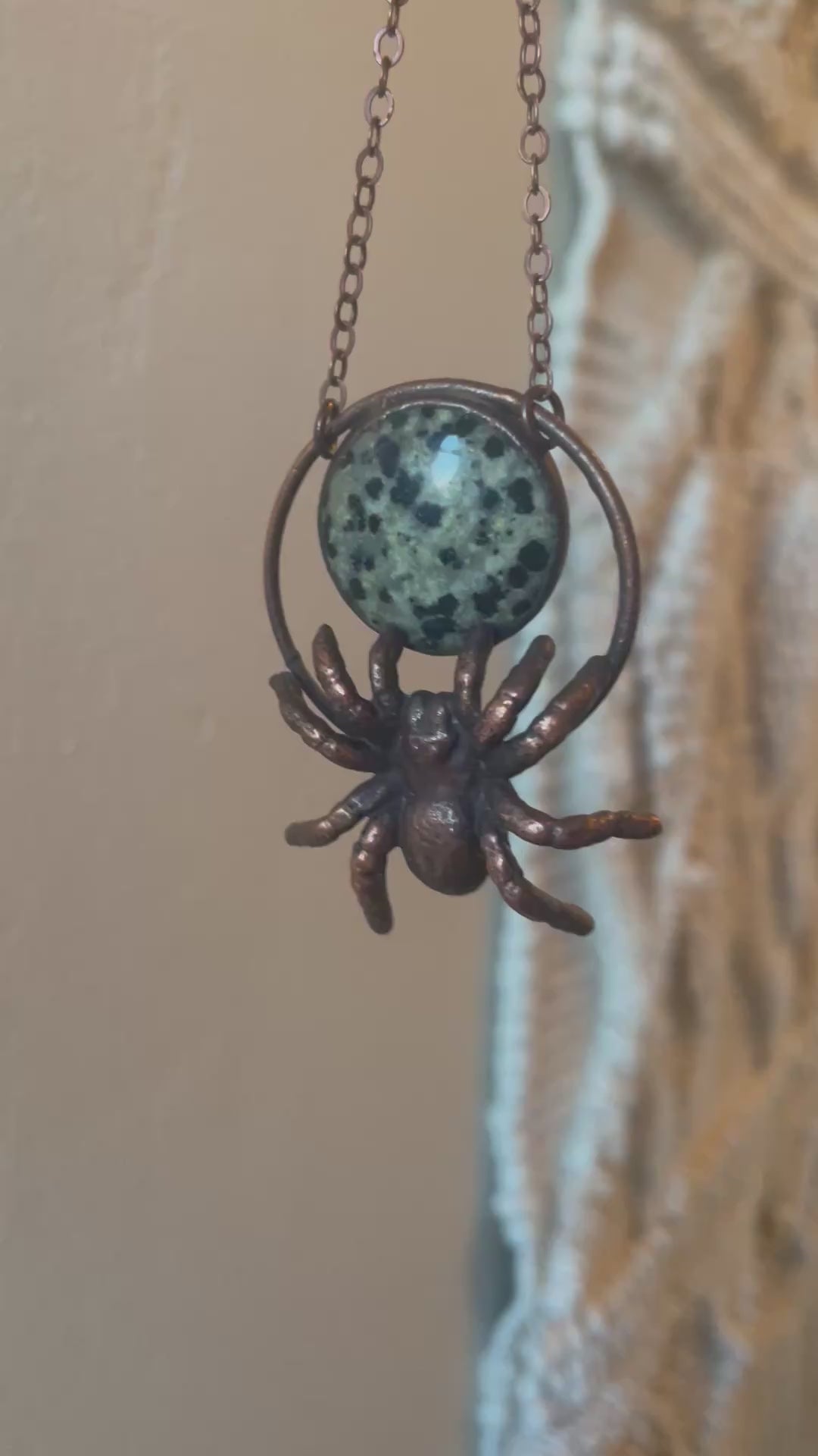 A plastic spider with Dalmation Jasper cabachon. Electroformed with copper and strung on a copper chain, you choose your length.