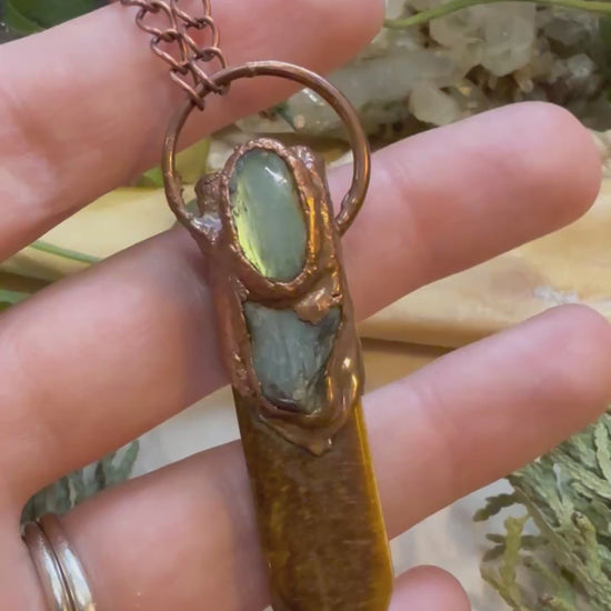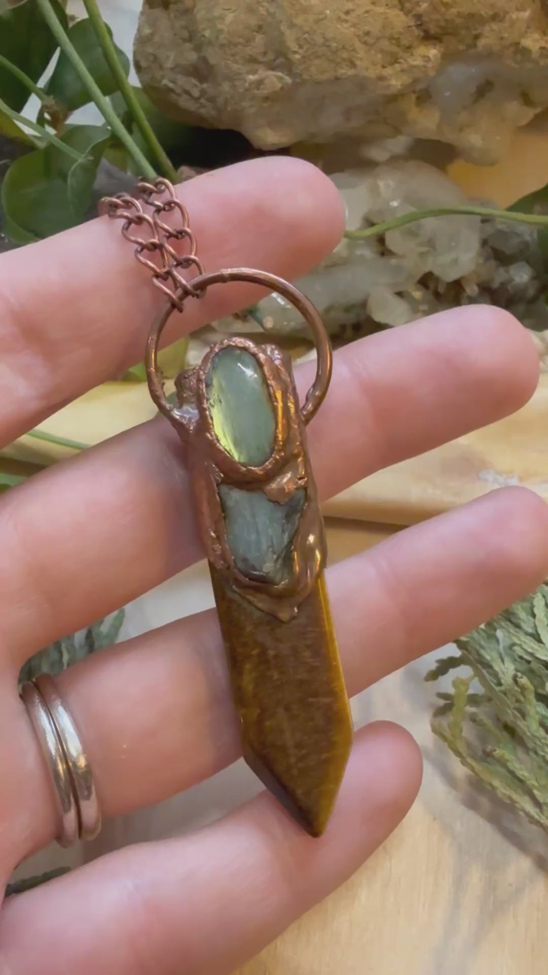 Tigers Eye sword shaped stone with green Kyanite and topped with Labradorite. Electroformed with copper and strung on a copper chain, you choose your length.