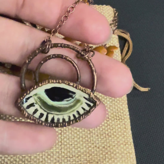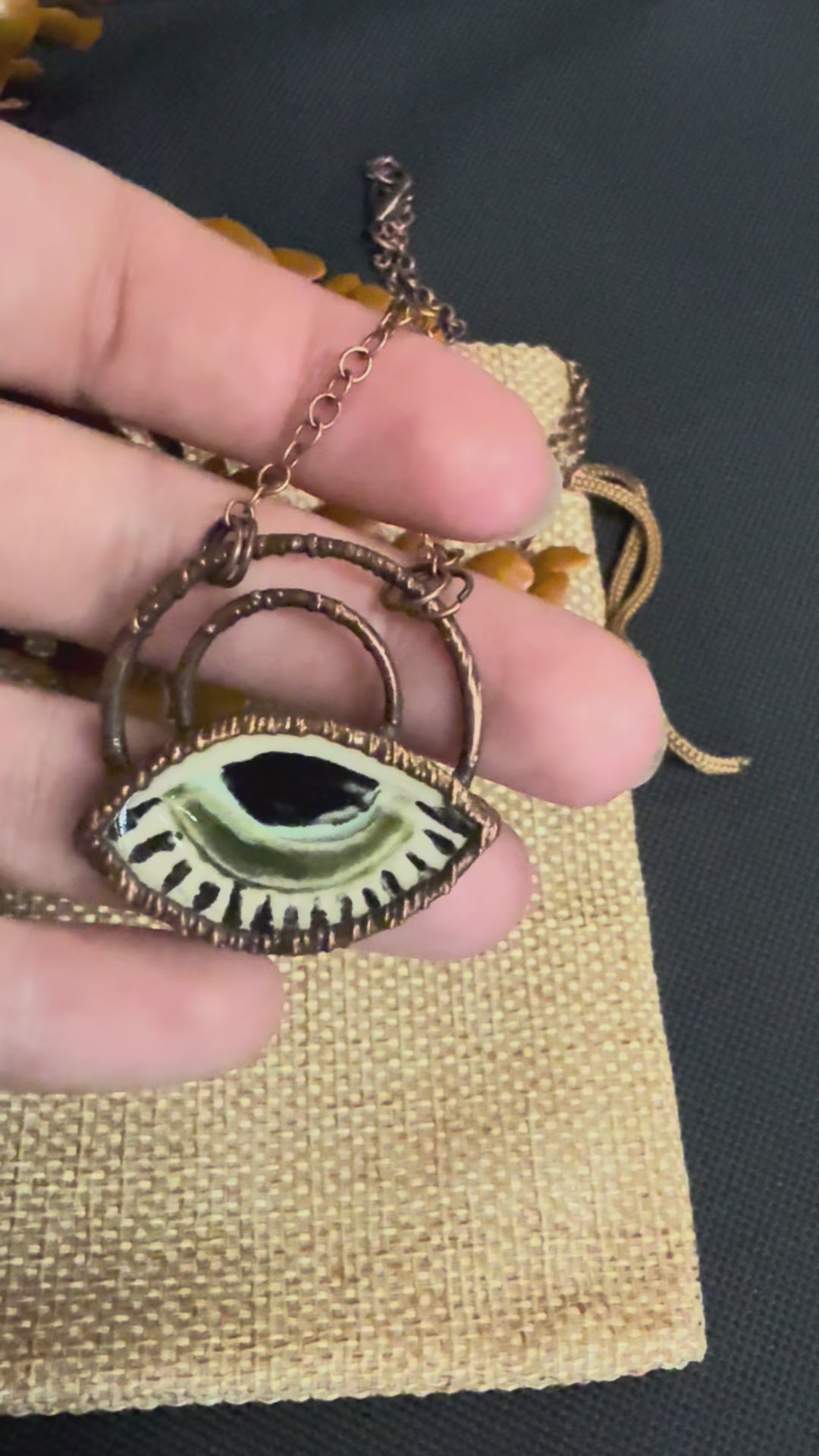 A little clay sculpted eye. I had so much fun making this charm along with a few others at my local clay studio Half Moon Clay. Electroformed with copper and strung on a copper chain, you choose your length.