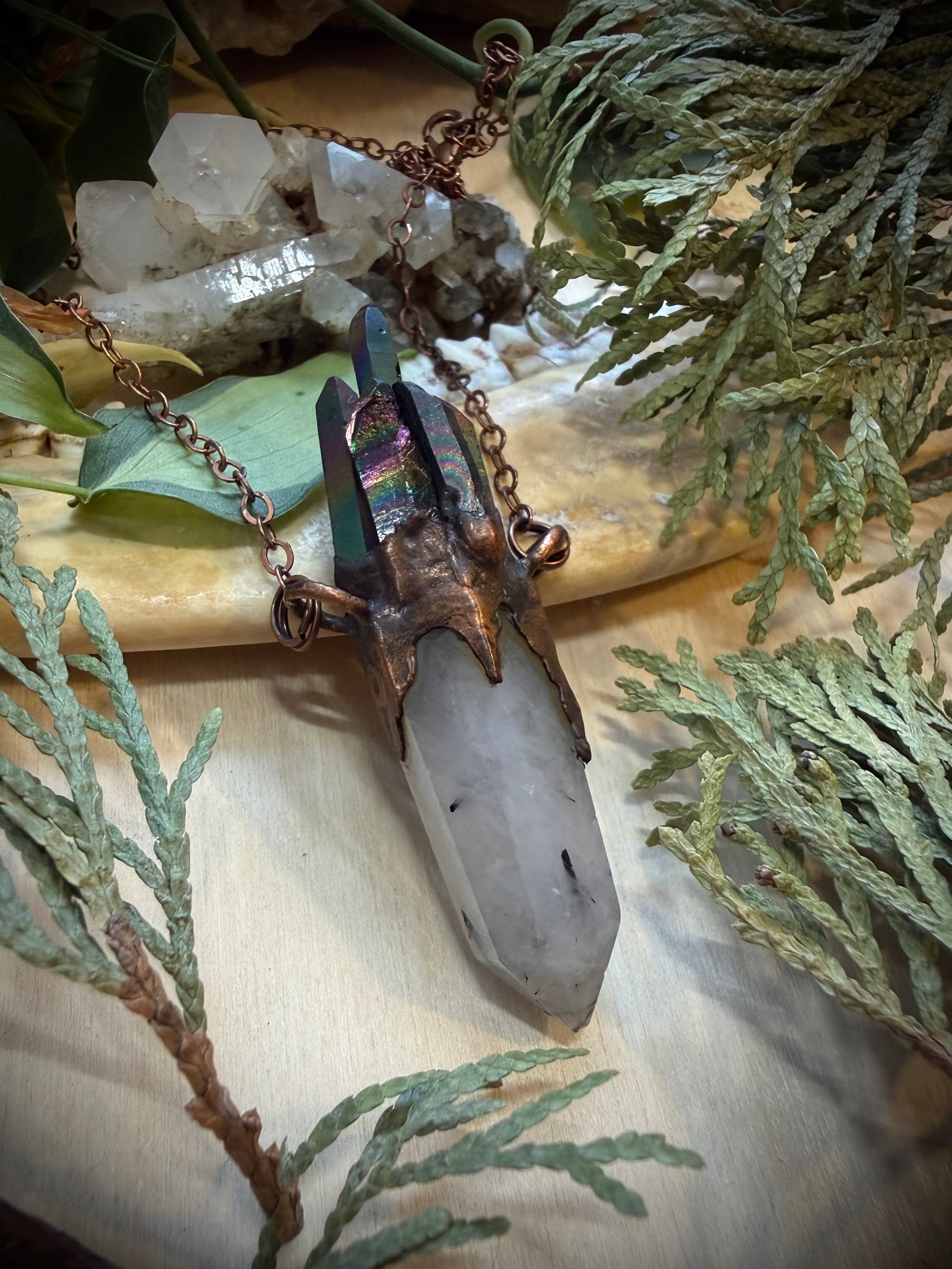 A cluster of Aura Quartz Points set on top of a Rutilated Quartz Point. Electroformed with copper and strung on a copper chain, you choose your length.