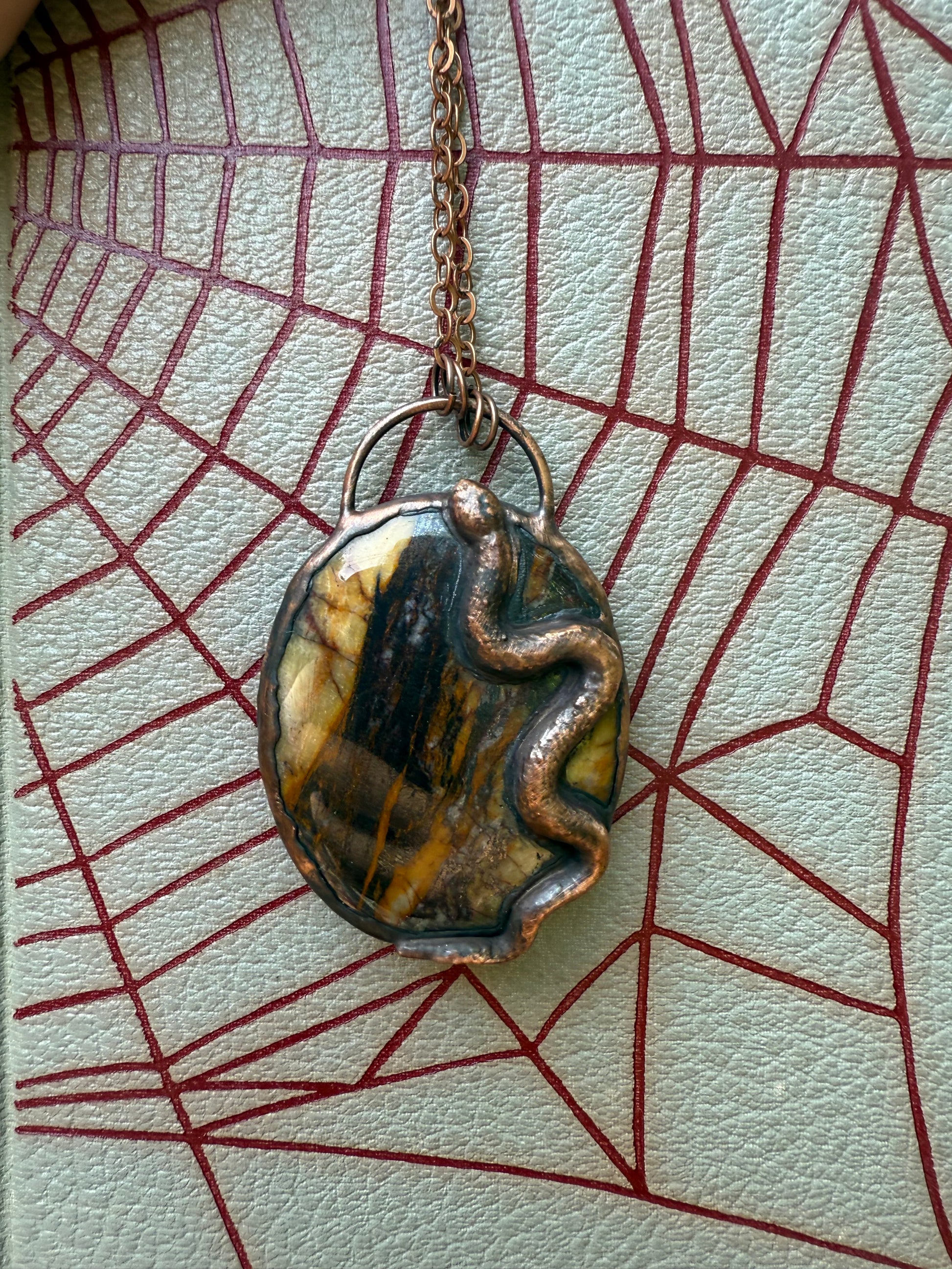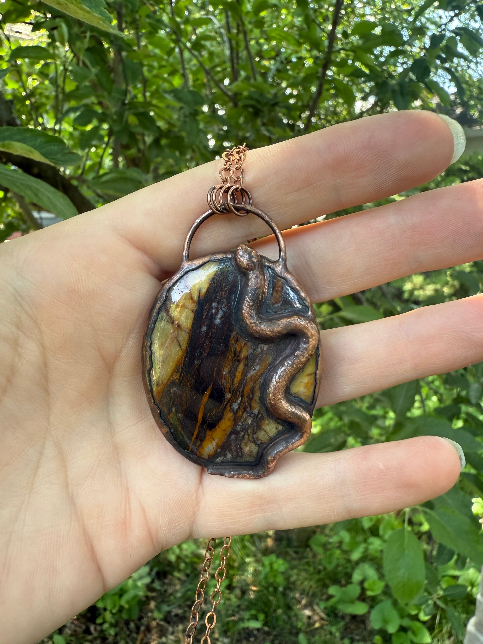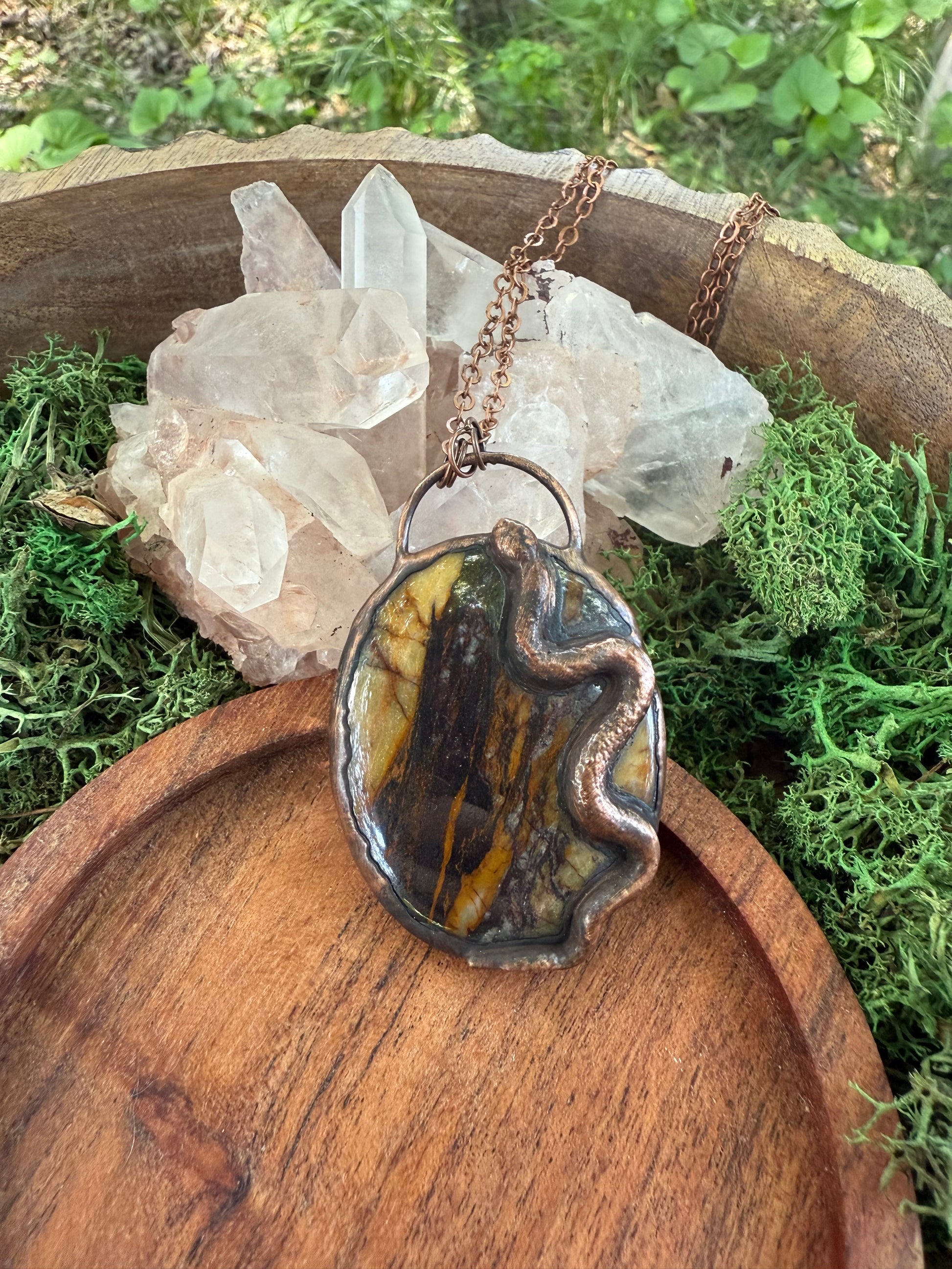 A large Mookaite stone with a sculpted clay snake positioned on top. Electroformed with copper and strung on a copper chain, you choose your length.
