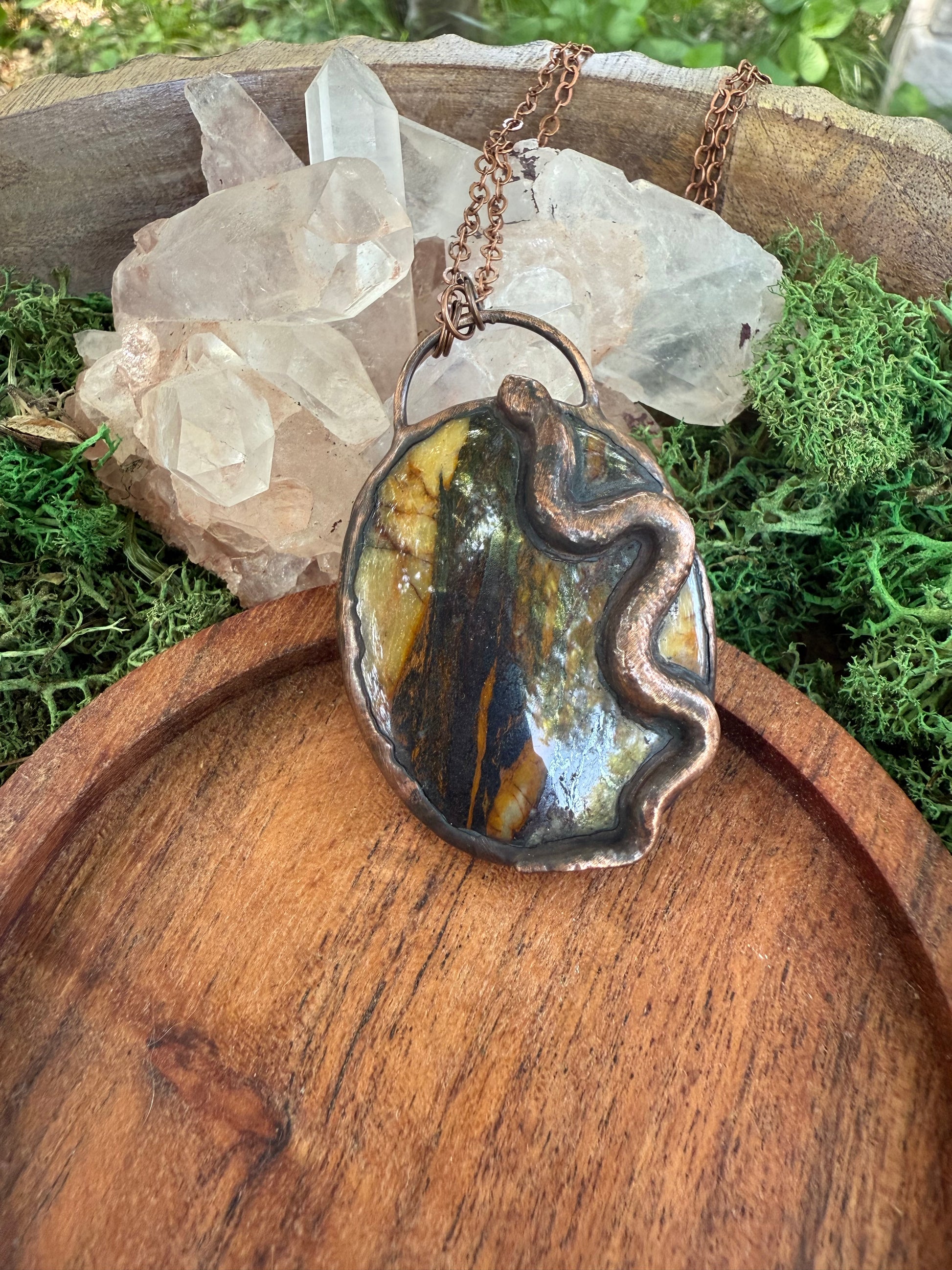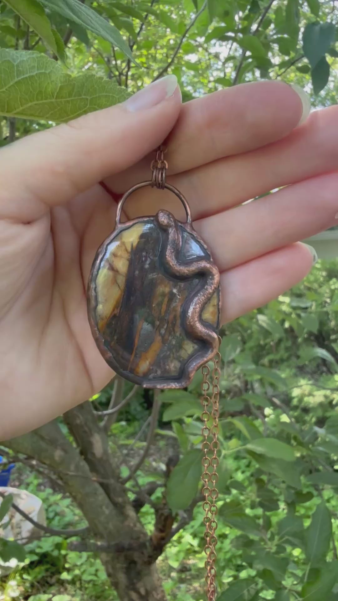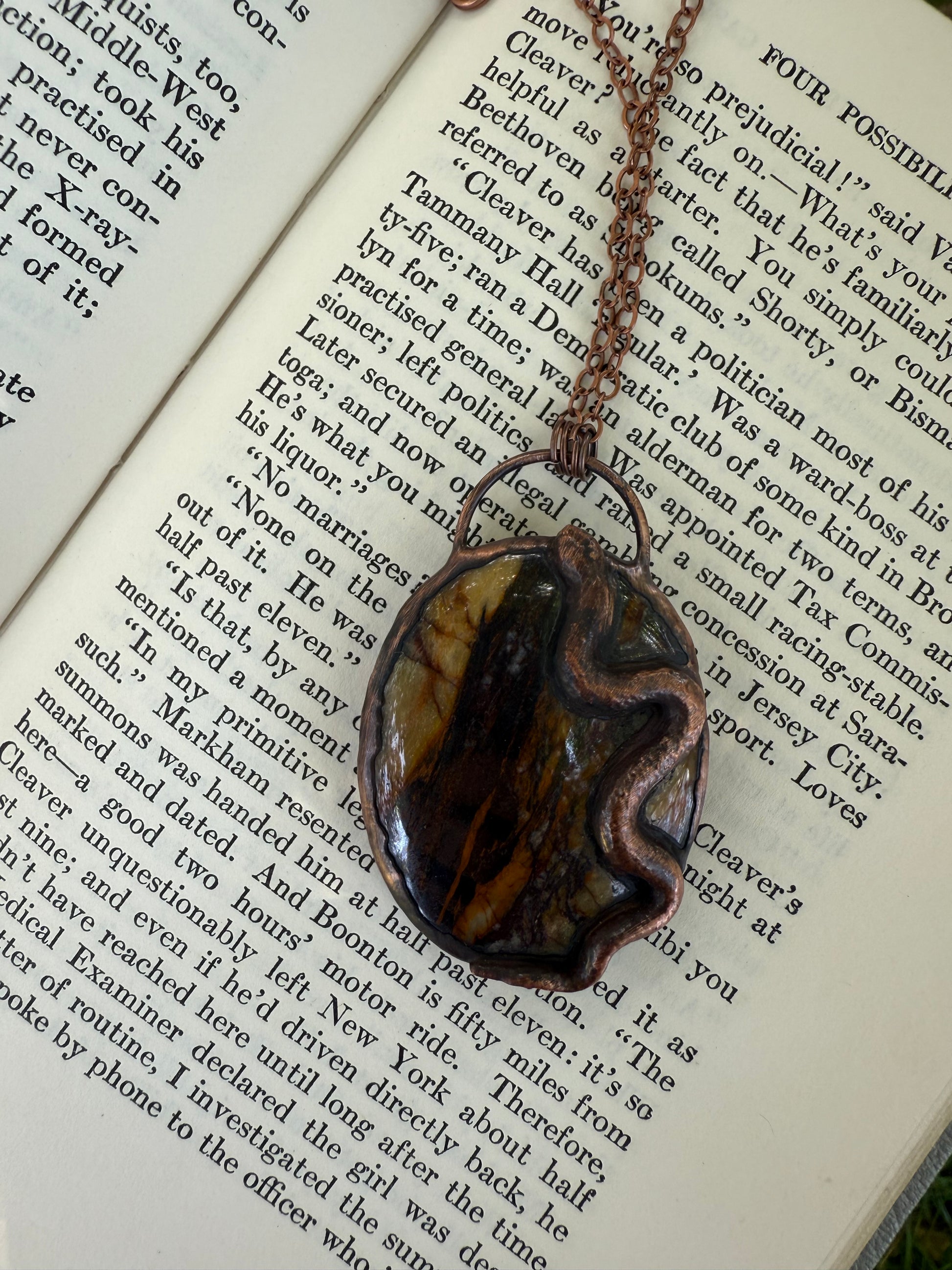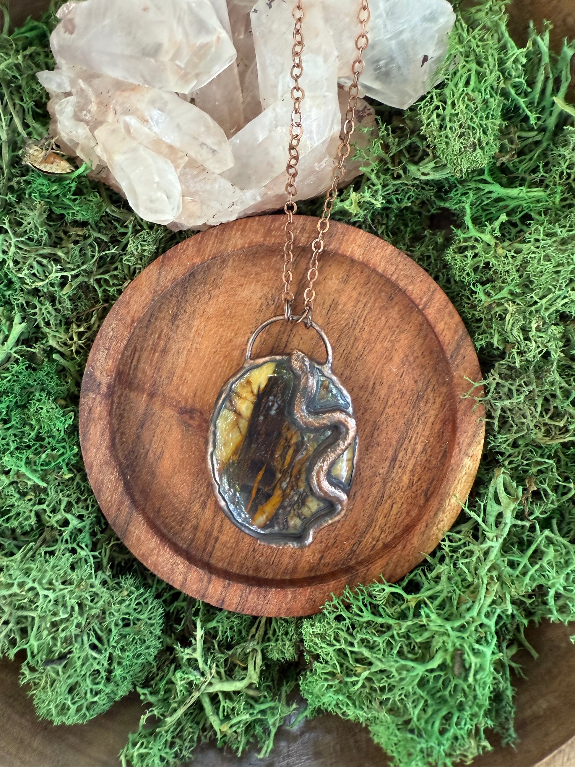 A large Mookaite stone with a sculpted clay snake positioned on top. Electroformed with copper and strung on a copper chain, you choose your length.