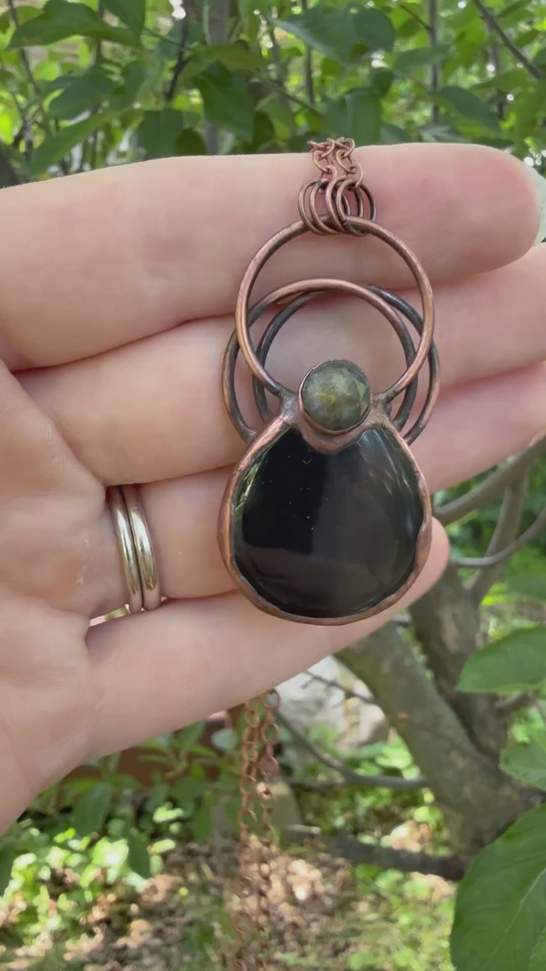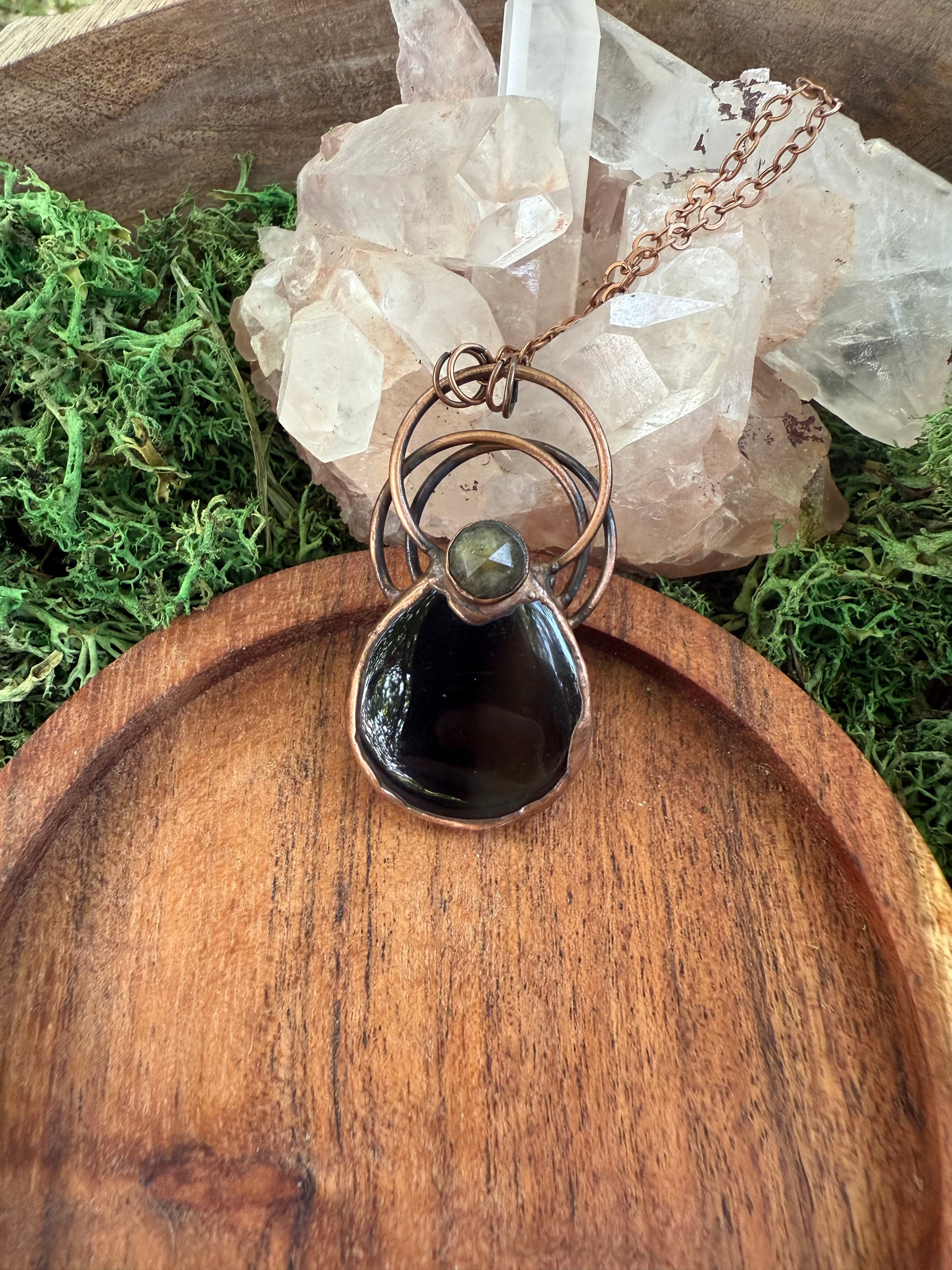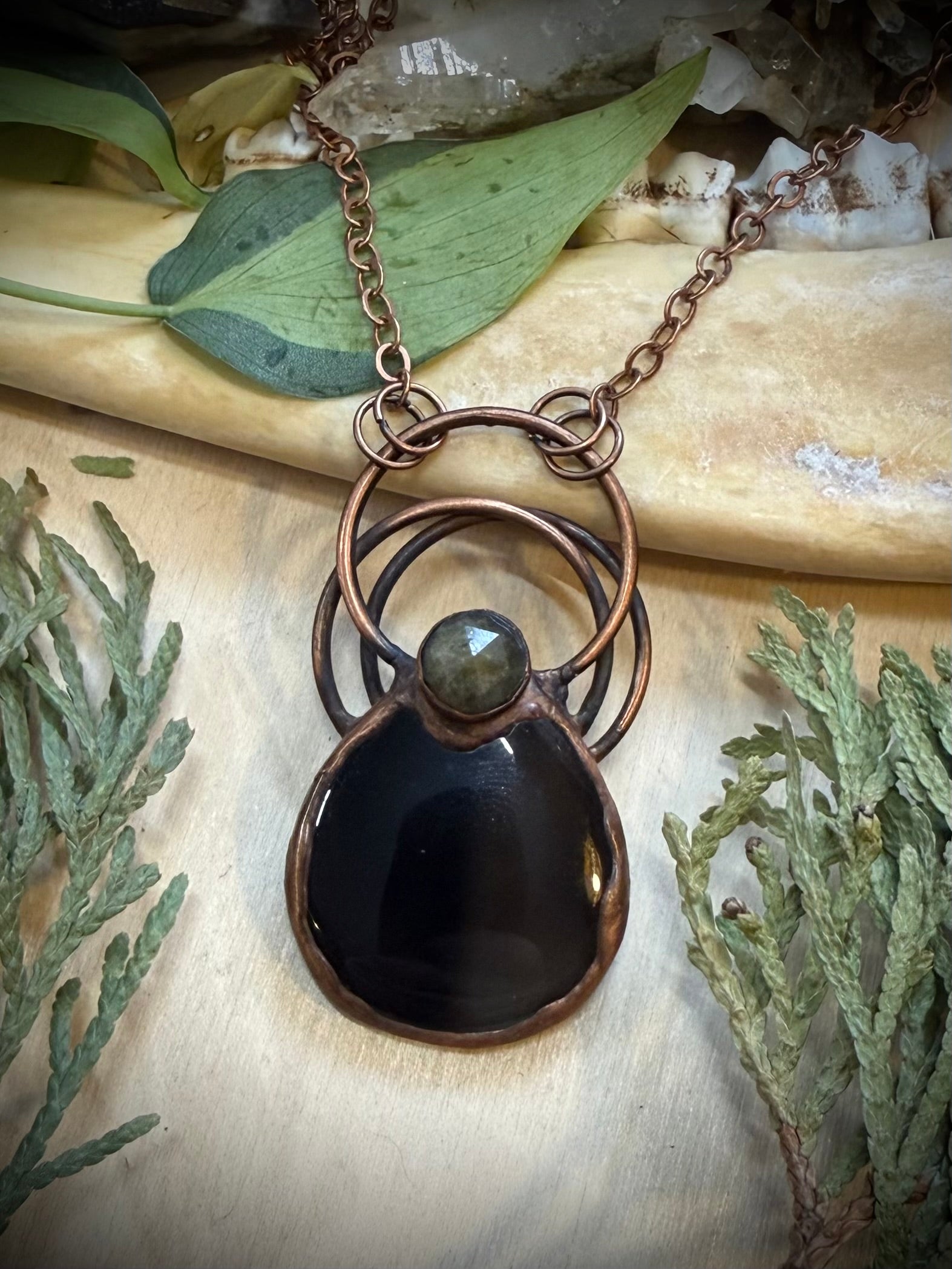 A black Agate with faceted Labradorite cabochon set with triple ring detail. Electroformed with copper and strung on a copper chain, you choose your length.
