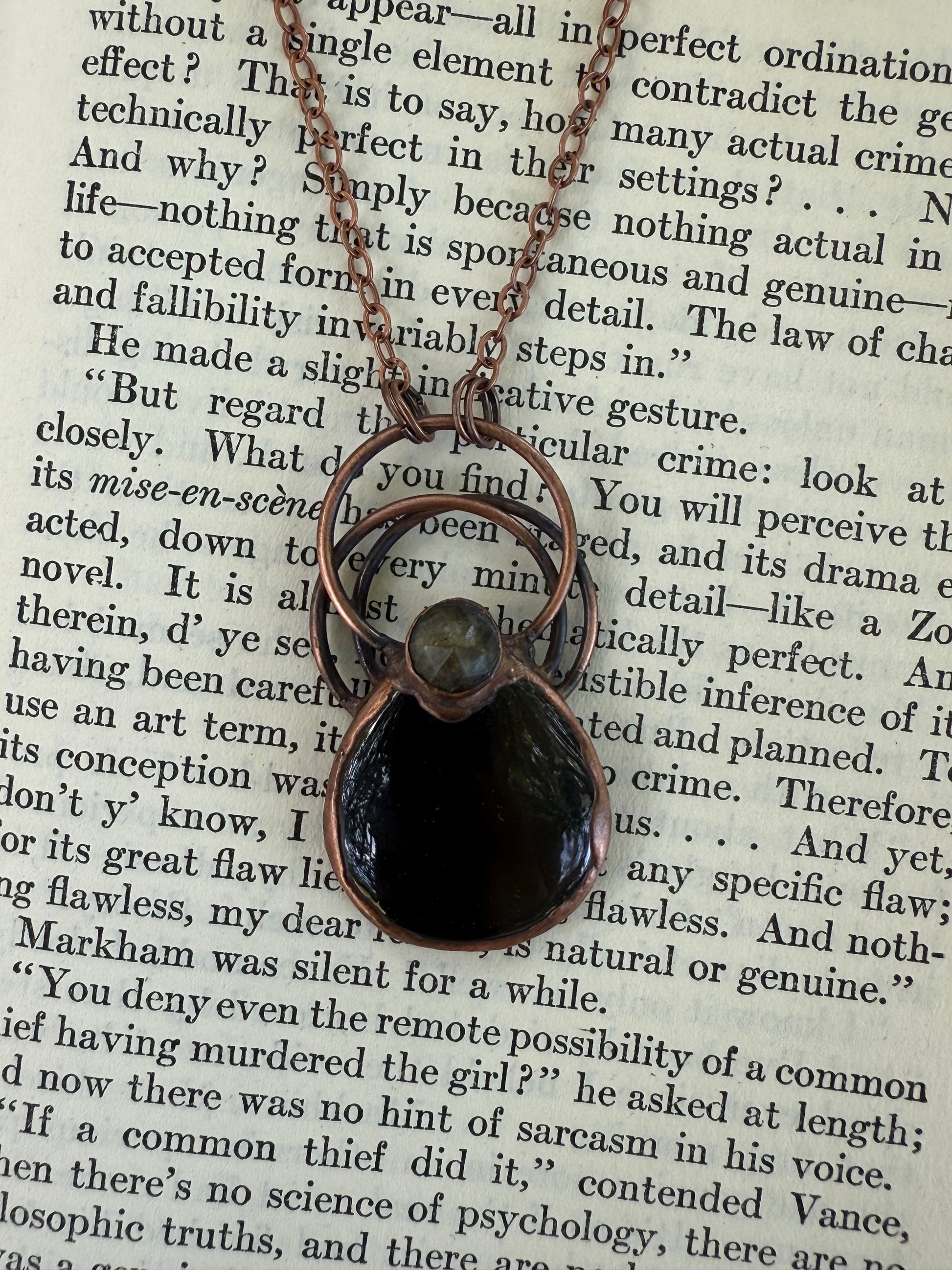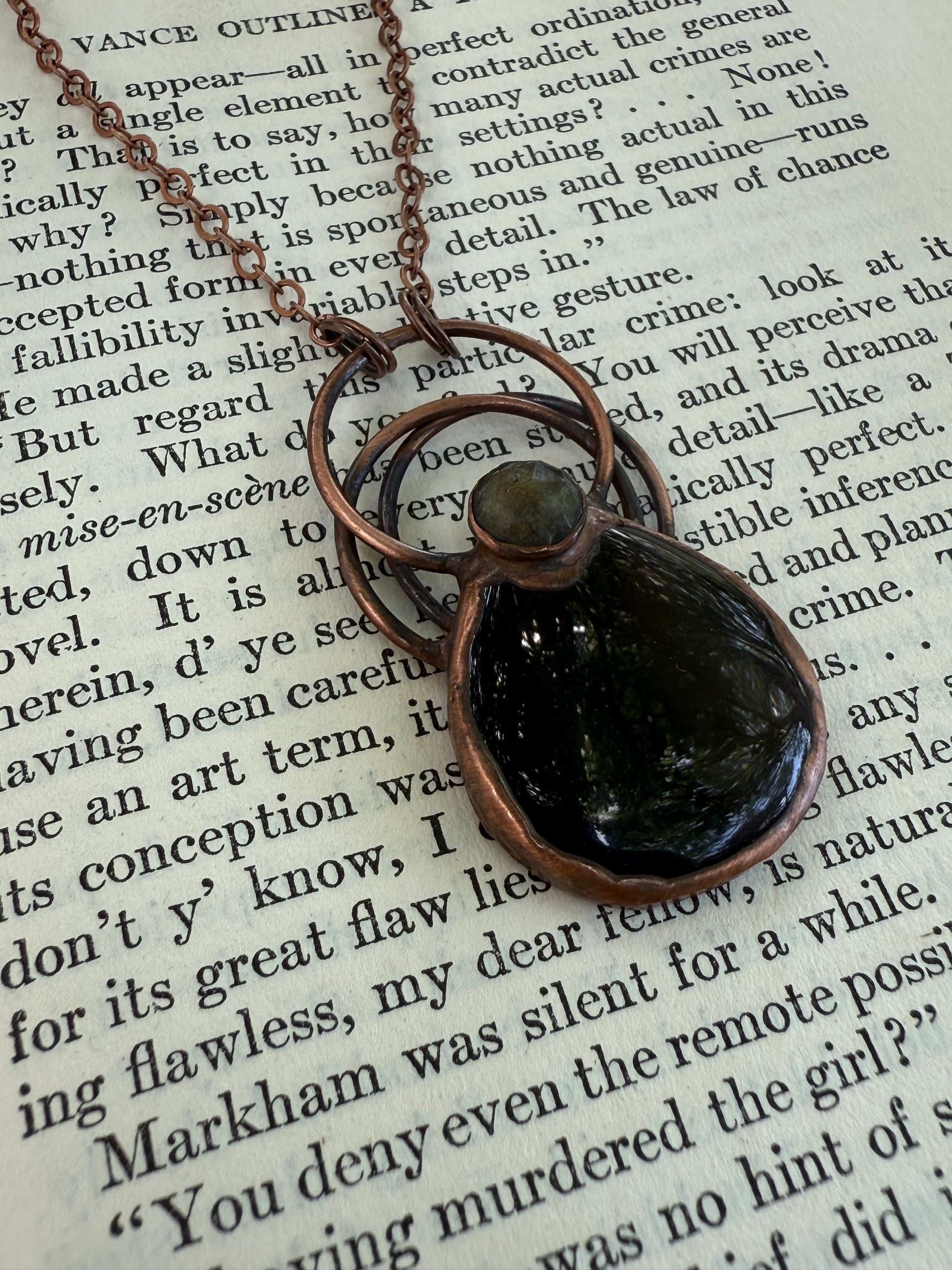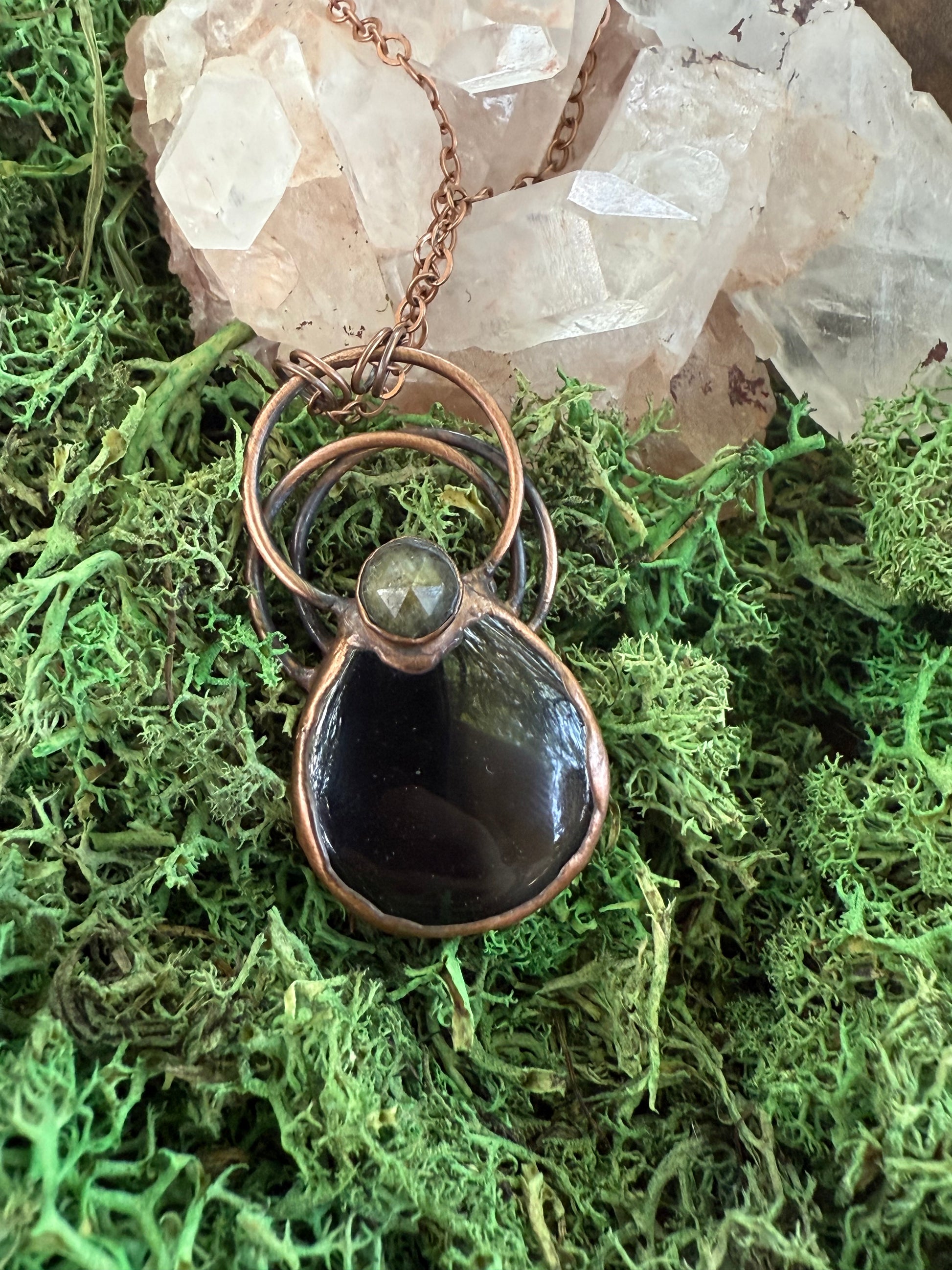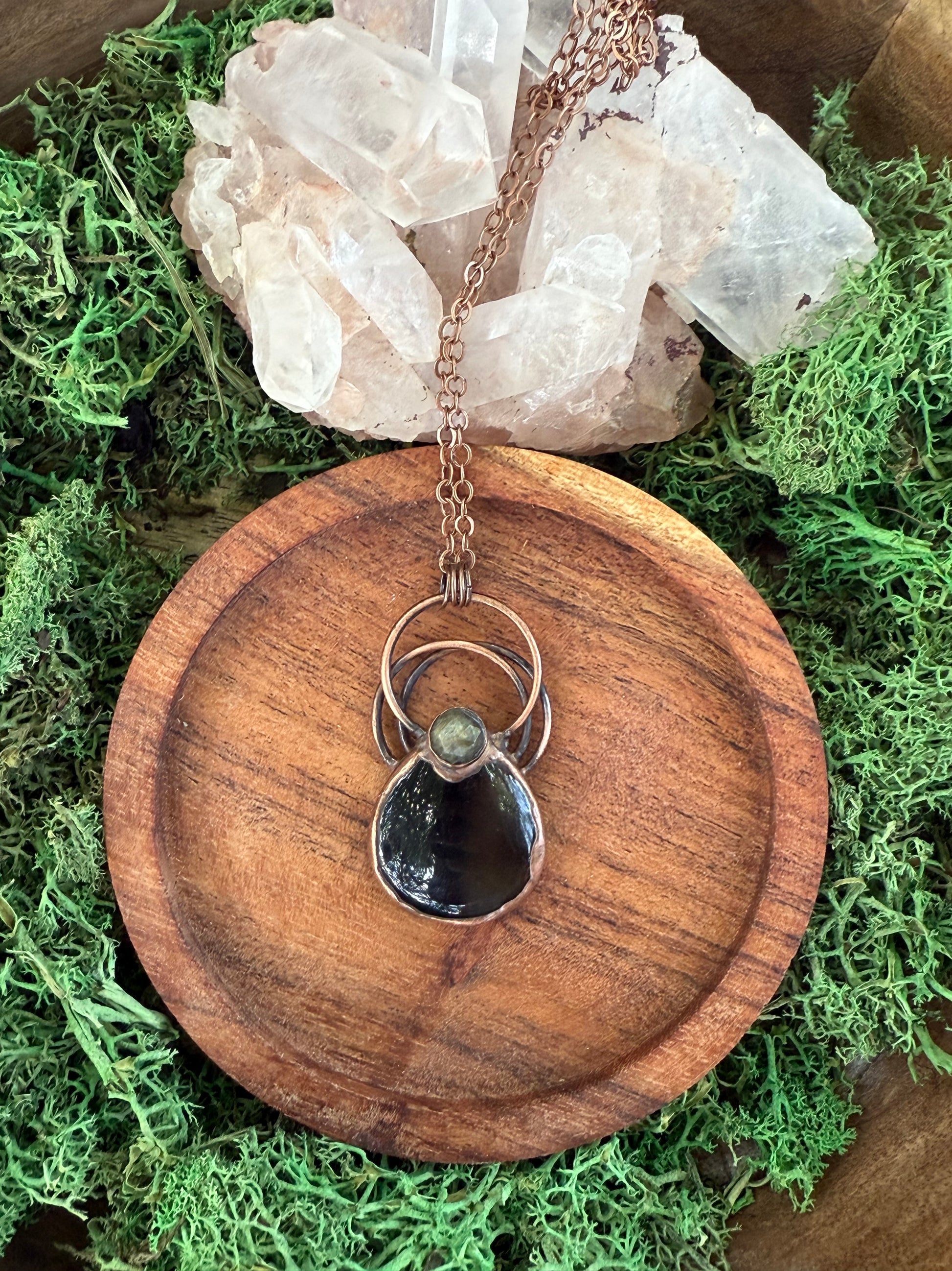 A black Agate with faceted Labradorite cabochon set with triple ring detail. Electroformed with copper and strung on a copper chain, you choose your length.